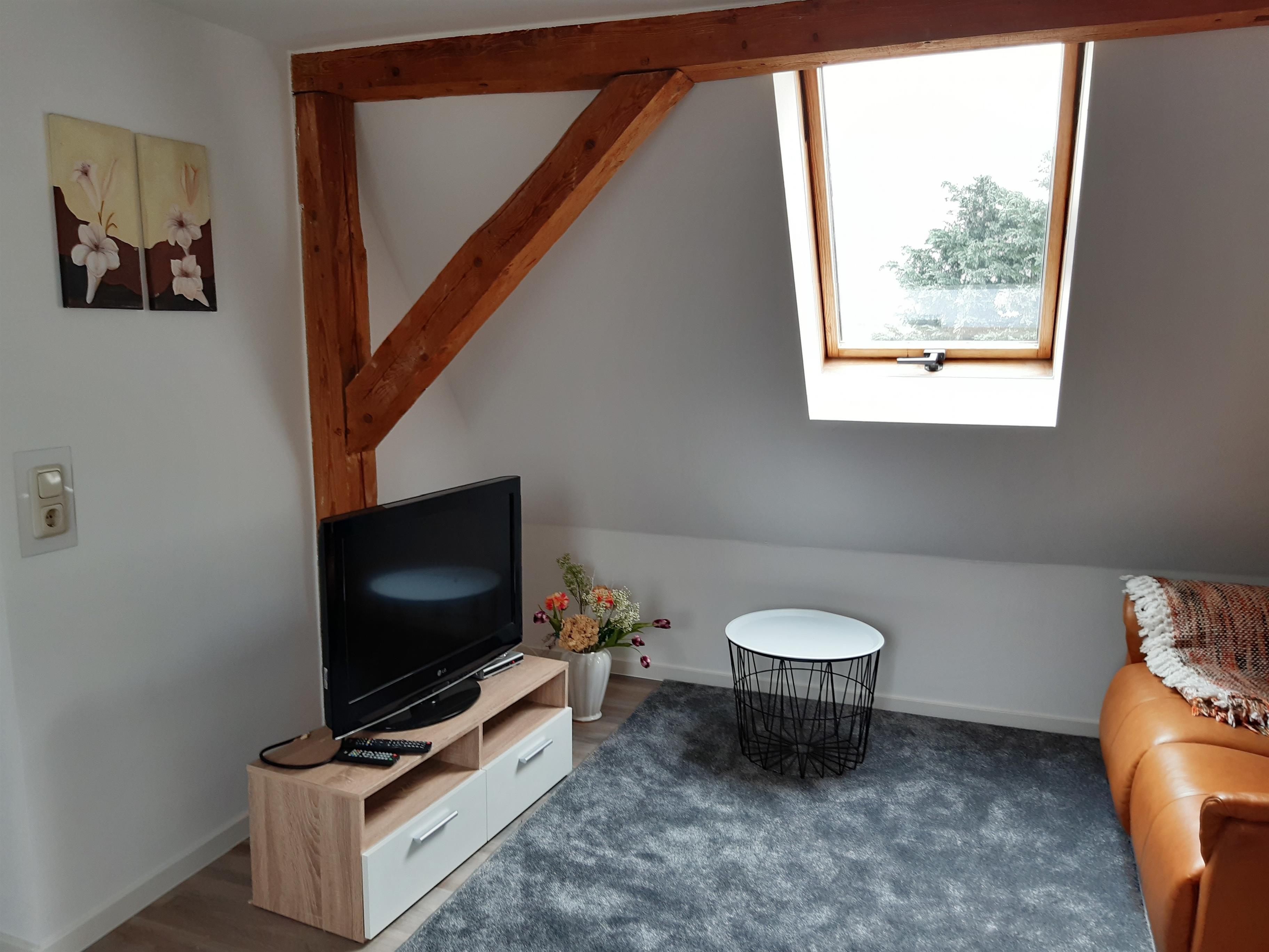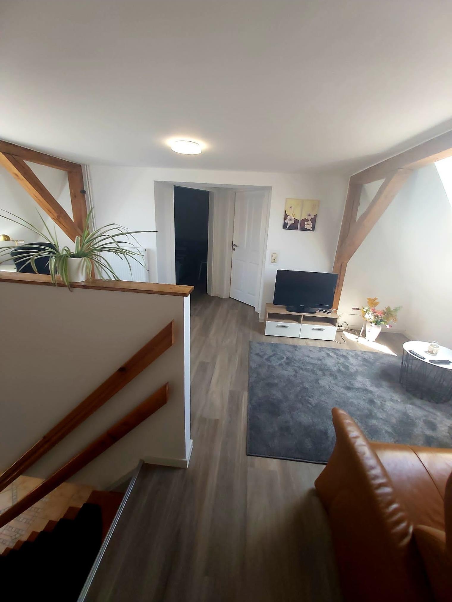 Im Obergeschoß befindet sich ein großzügiger Flur mit Fernseher , Wc und 3 Schlafräumen .