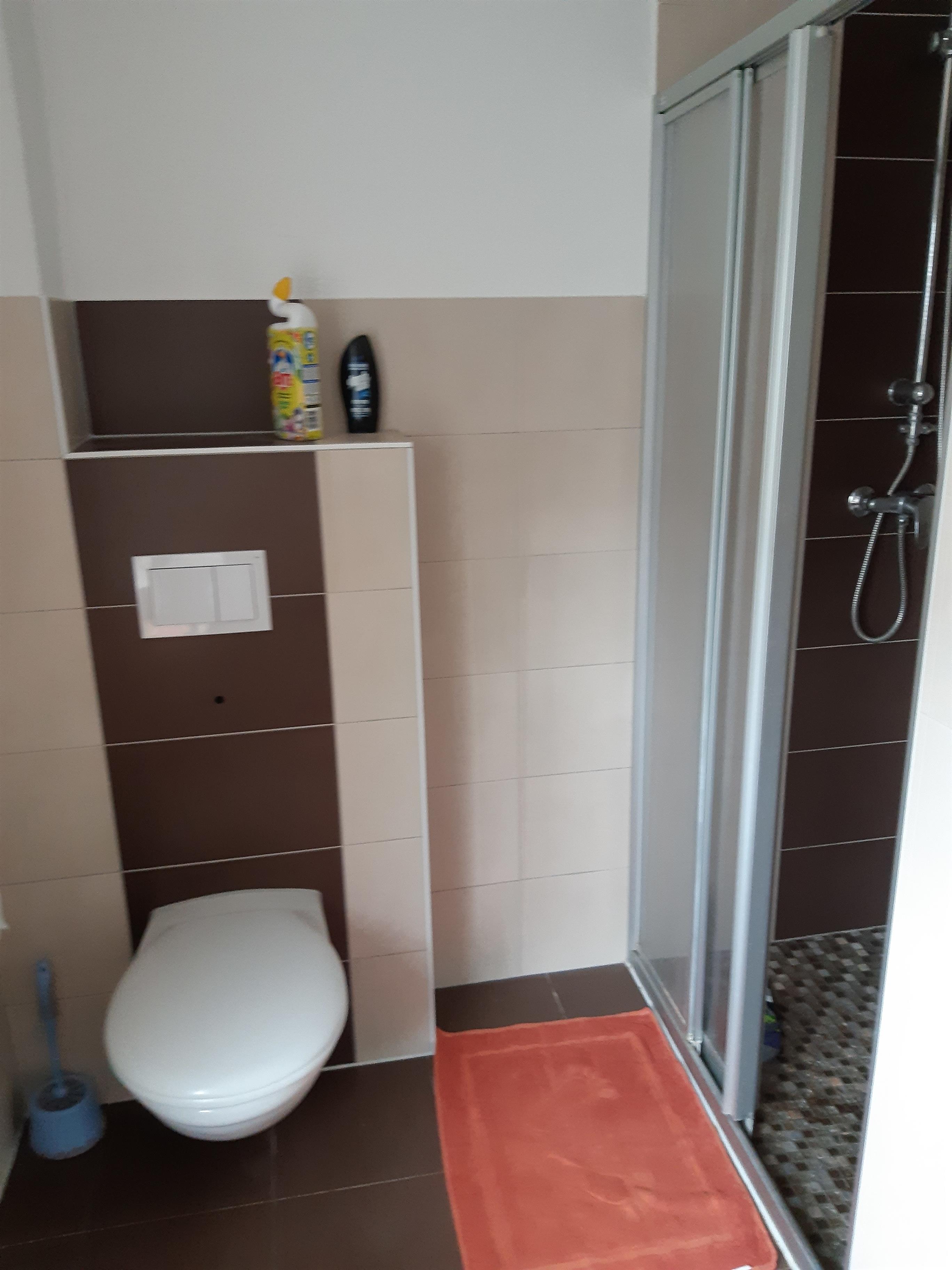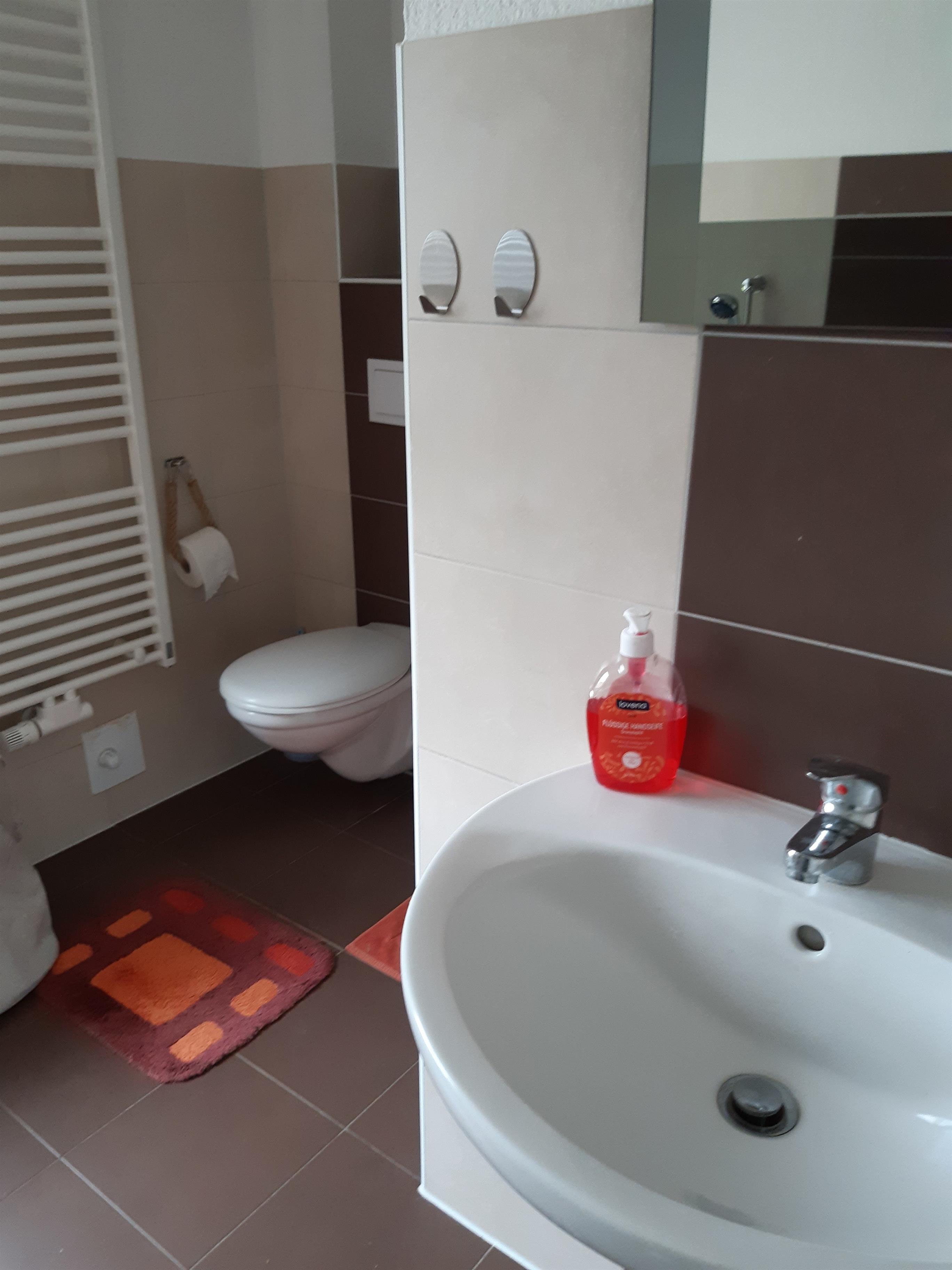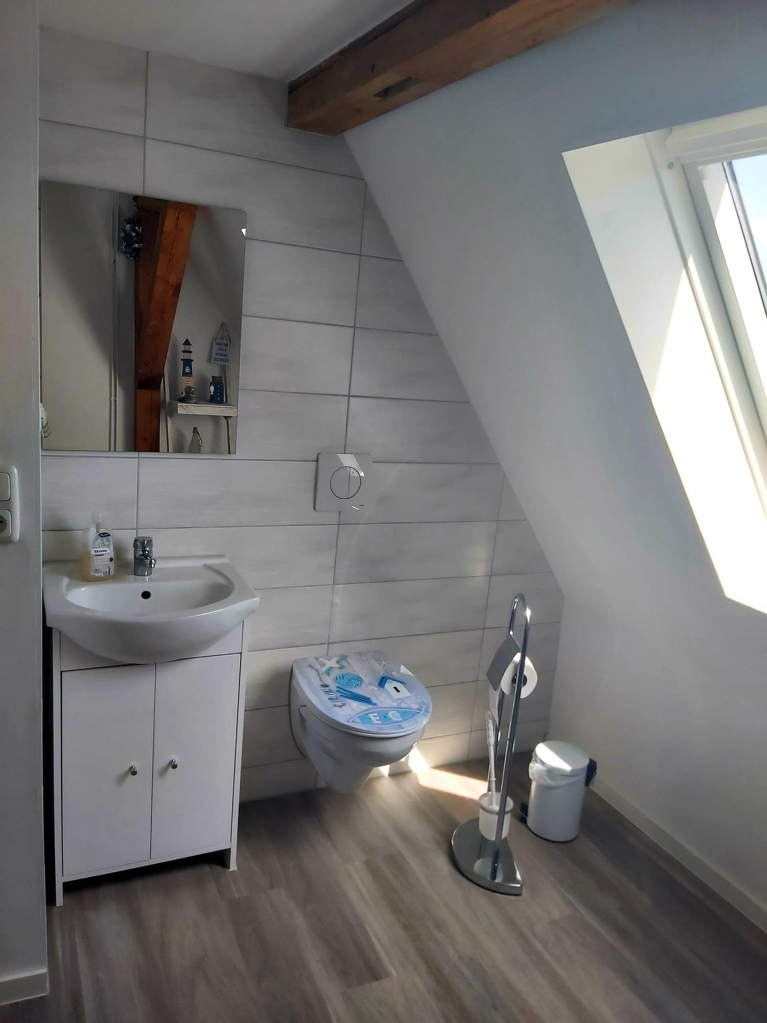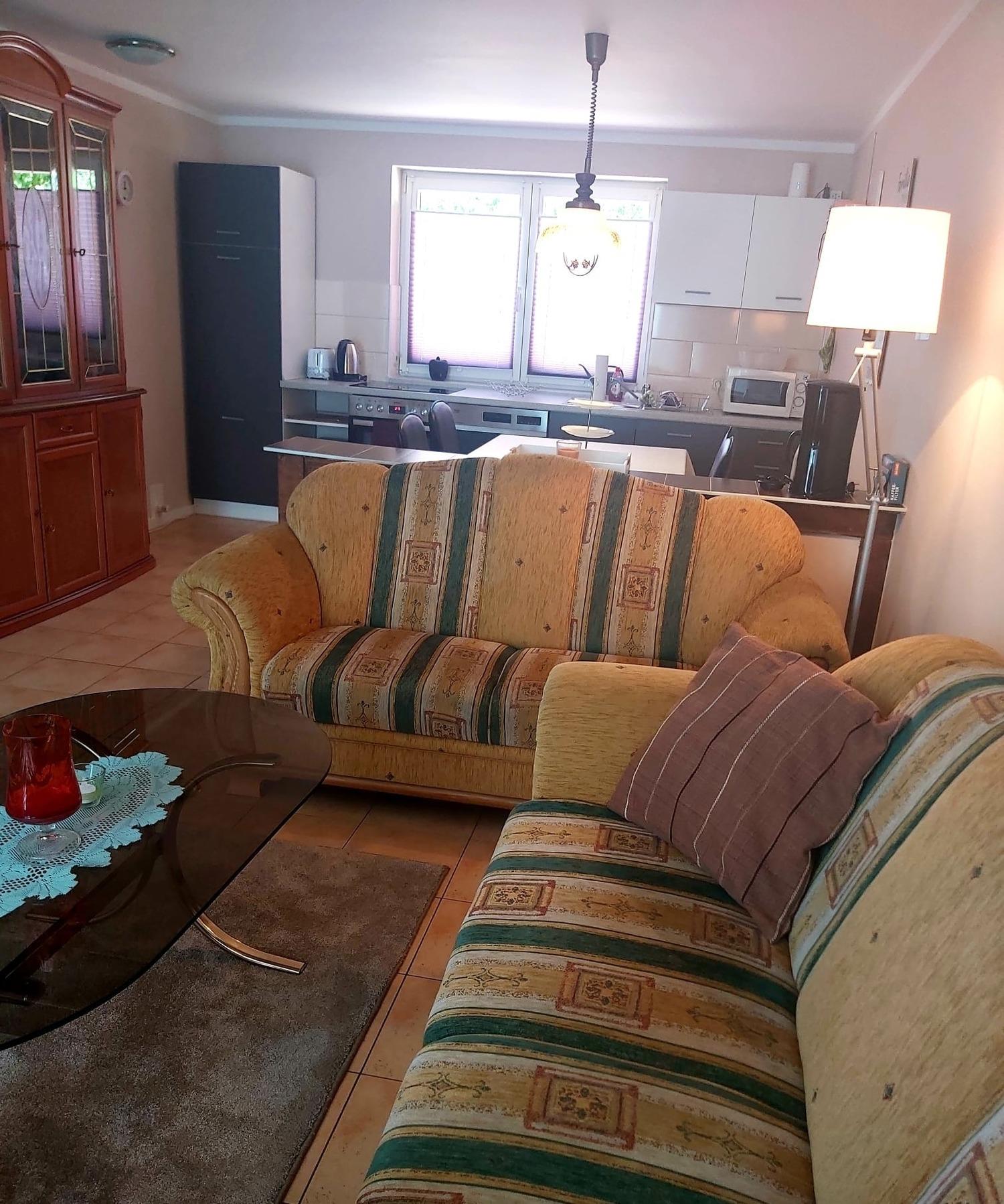 Im Erdgeschoß Wohnraum mit offener Küche ,Bad/ Wc , Dusche und Badewanne .
