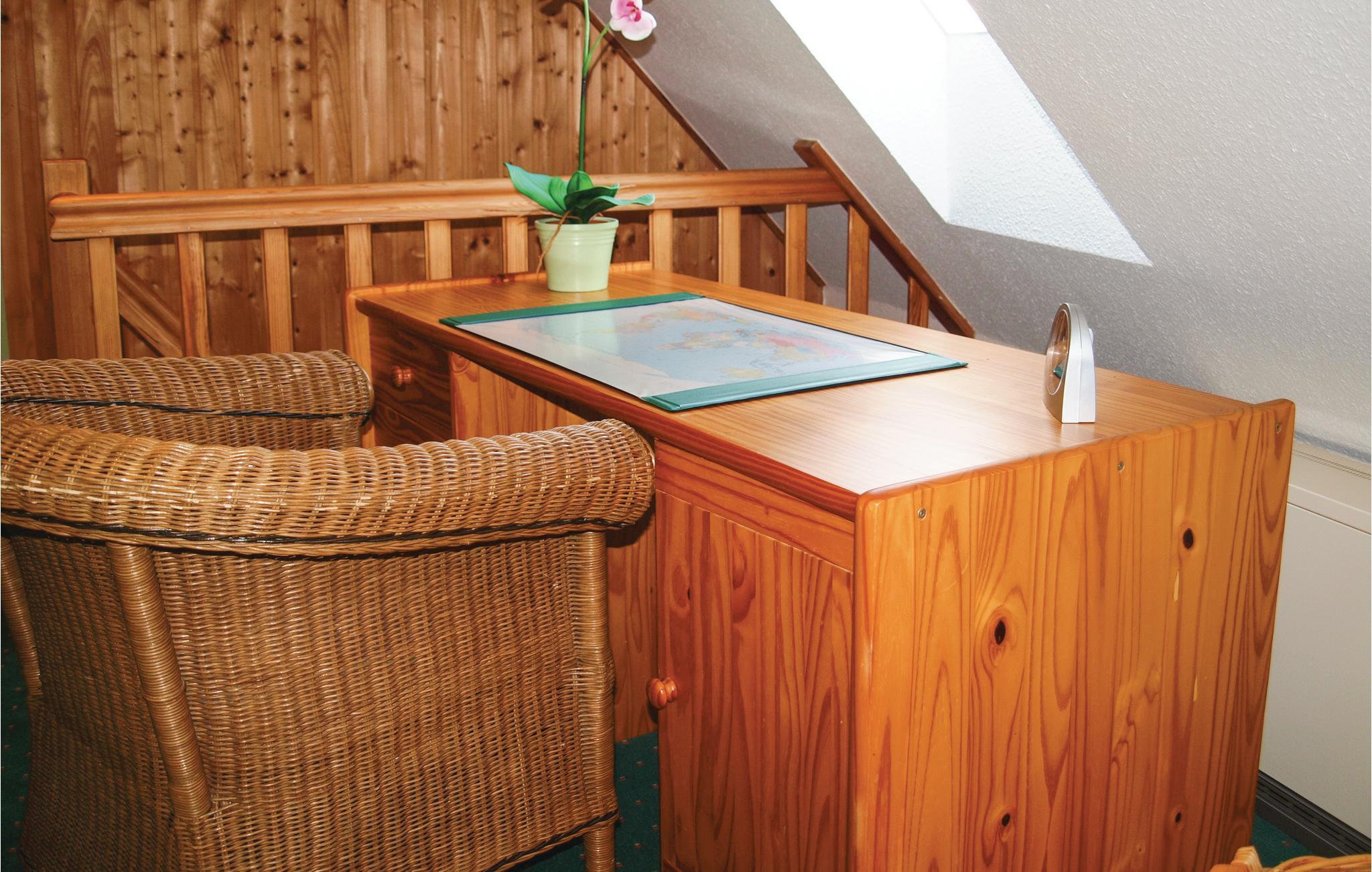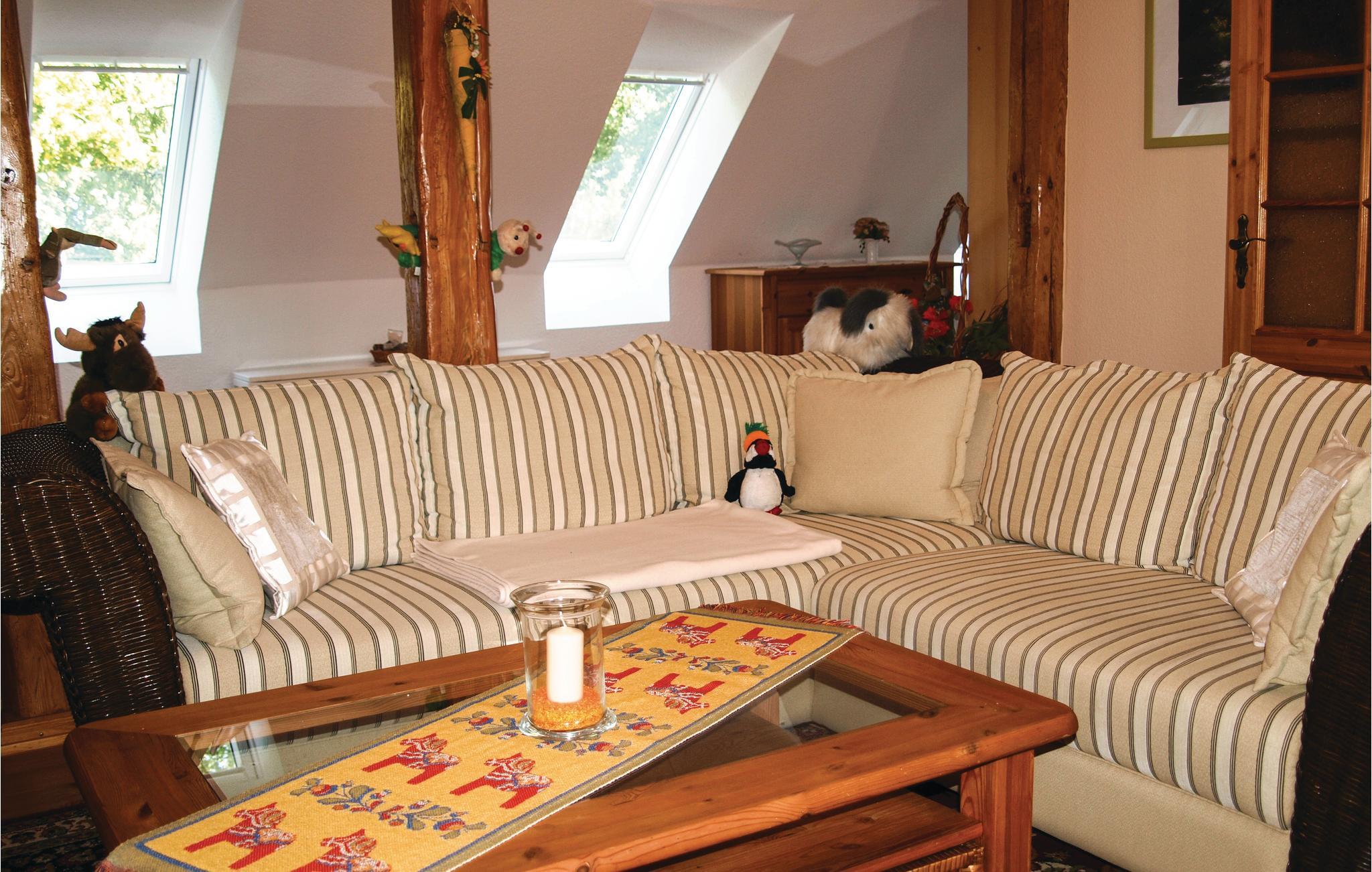 I kommer op til denne hyggeligt og delvist rustikt indrettet ferielejlighed på første sal via en ydertrappe. I dagligstuen med åbent køkken er der en stige op til hemsen under det spidse tag. Boligen er del af en gård med mange katte. Opdag naturområdet Unteres Recknitztal og fugleparken Marlow med tropehus og pingvinanlæg. Også seværdig er hollændermøllen i Marlow. Muligheder for dagsture er bl.a. ravbyen Ribnitz-Damgarten, halvøen Darß-Zingst, Karls oplevelseslandsby i Rövershagen samt Rostock og Stralsund.