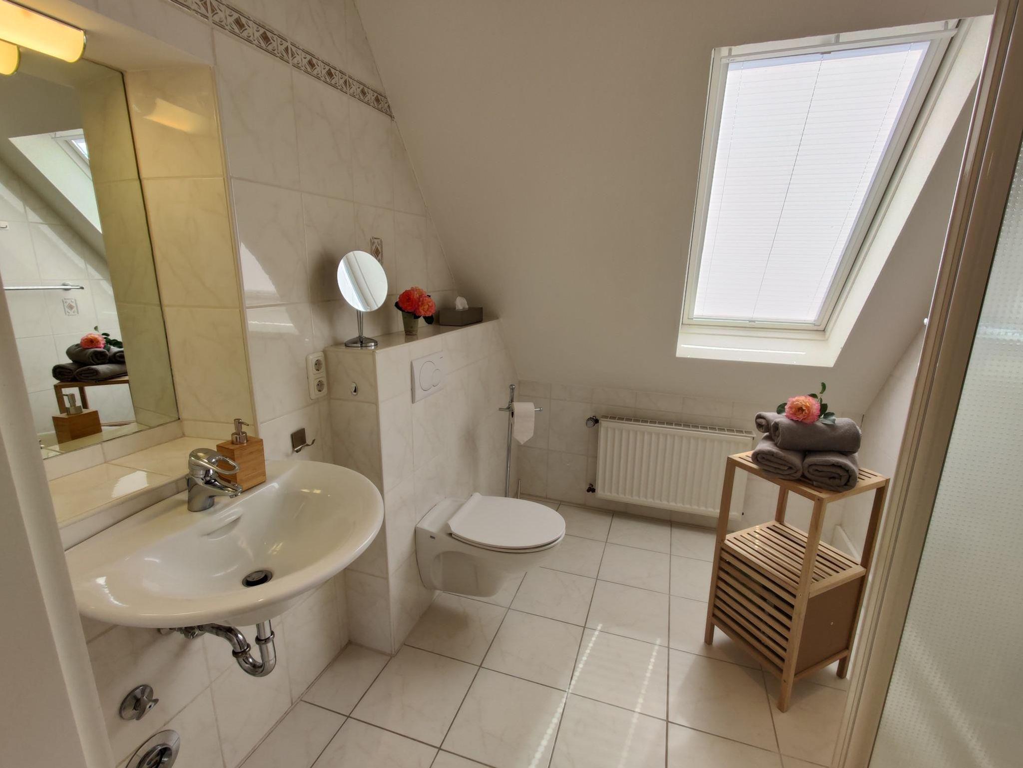 Das Badezimmer mit Tageslicht bietet eine Dusche, Handtücher, einen Haarfön und einen Kosmetikspiegel.