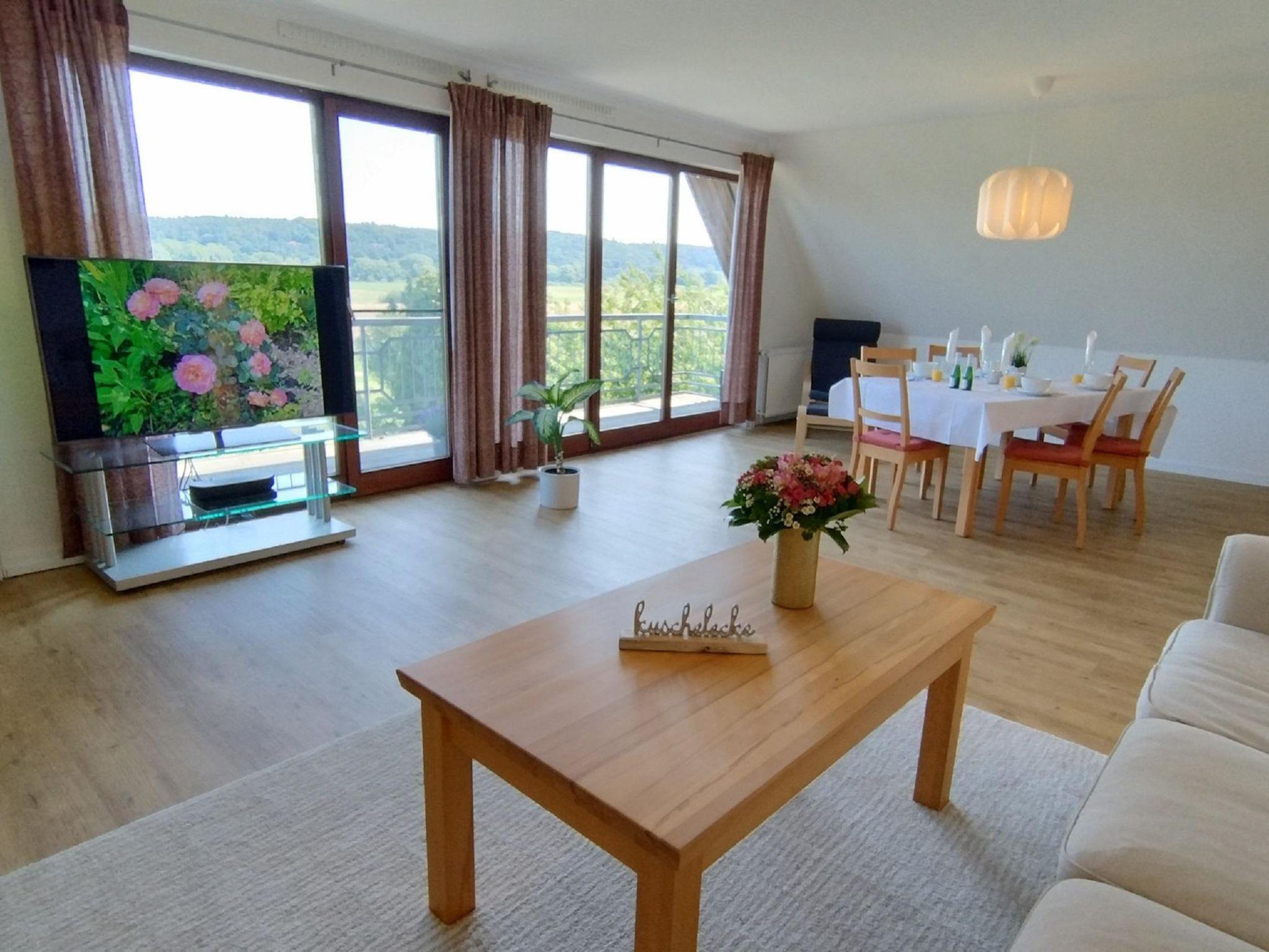 Der großzügige, helle und gemütliche Wohnbereich lädt zum Entspannen ein und ist ausgestattet mit zwei Sofas, einem 55-Fernseher mit Sat-TV, einem modernen Internetradio, BlueRay-Player, Lesesessel und einem Balkon, von dem aus Sie den Panoramablick auf den Deich und die Elbe genießen können.