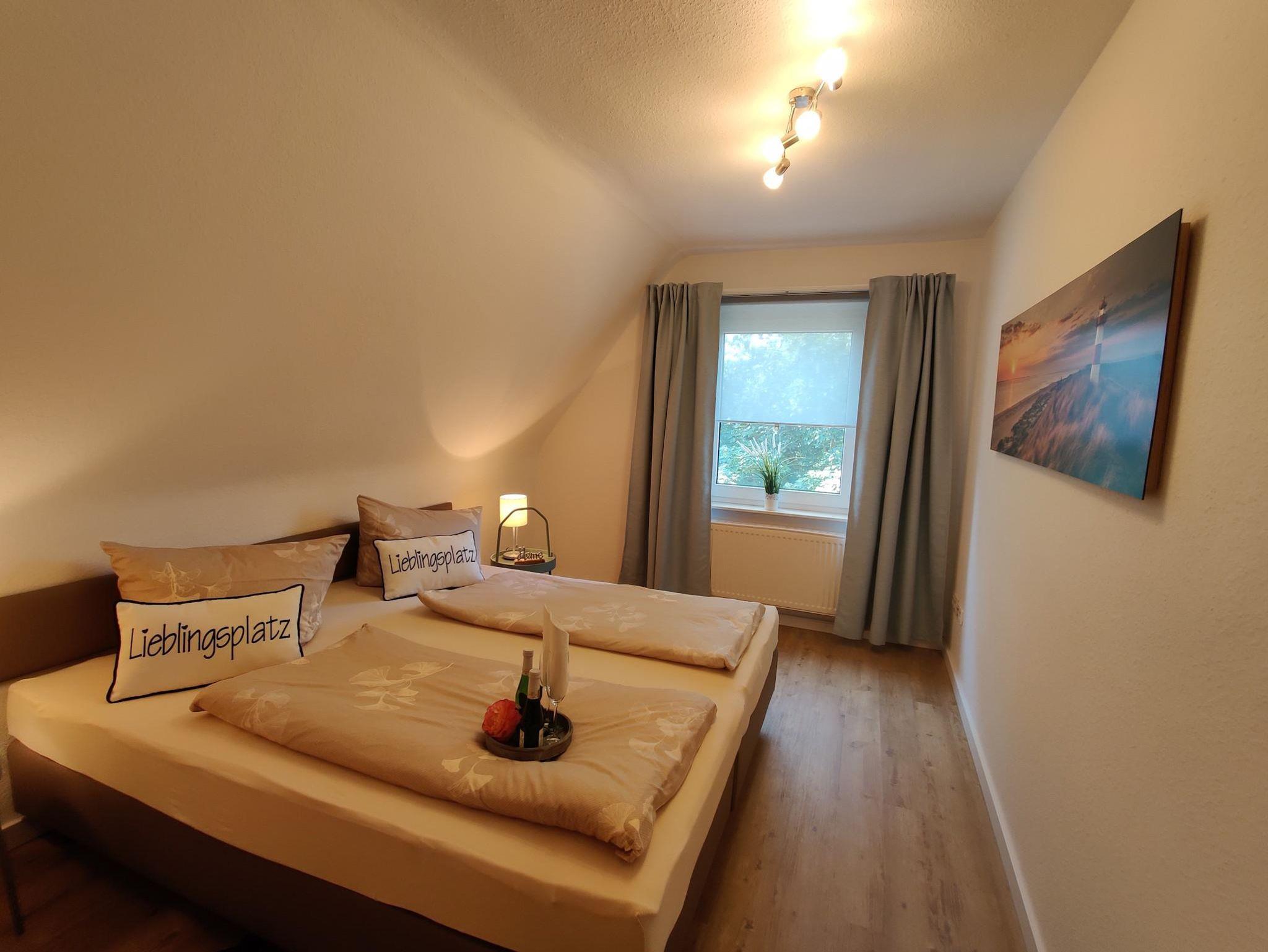 Ein Schlafzimmer ist mit einem Doppelbett (1,80 m), das zweite Schlafzimmer mit ein Einzelbett und ein Schrankbett ausgestattet. Beide Zimmer haben eine gute Verdunklungsmöglichkeit.