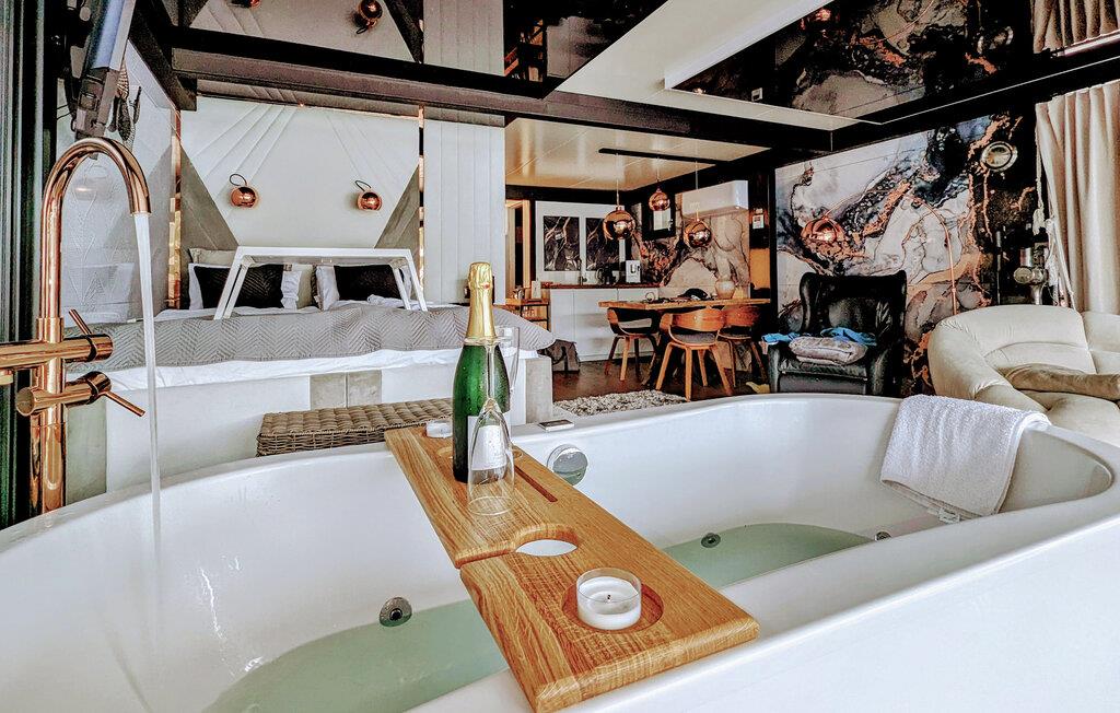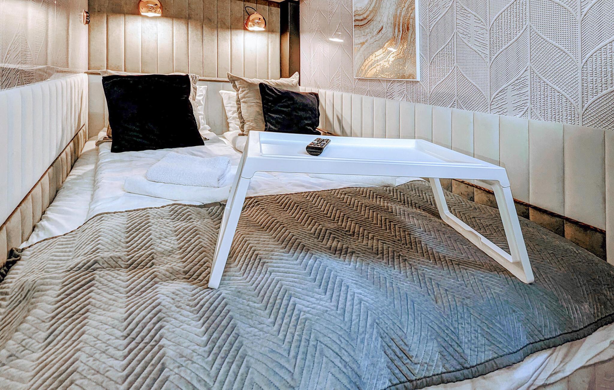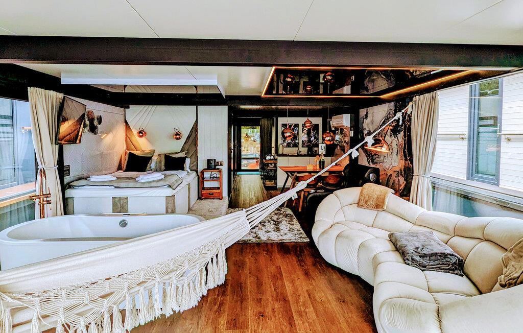 Husbåden DeLuxe ligger fortøjet i den lille Marina Martinshafen, og her kan I se frem til ren luksus med et behageligt opholdsrum og to udendørs terrasser i to etager. Det store panoramavindue giver rummet et luftigt udtryk og en fantastisk udsigt over livet på havnen. Med en lille sauna, et boblebad og en massagestol kan I forkæle jer selv med lidt god wellness efter en aktiv feriedag. I sover kun 30 centimeter over vandoverfladen, og I skal ikke bekymre jer om bølgernes skvulp; der er nemlig ikke nogen.