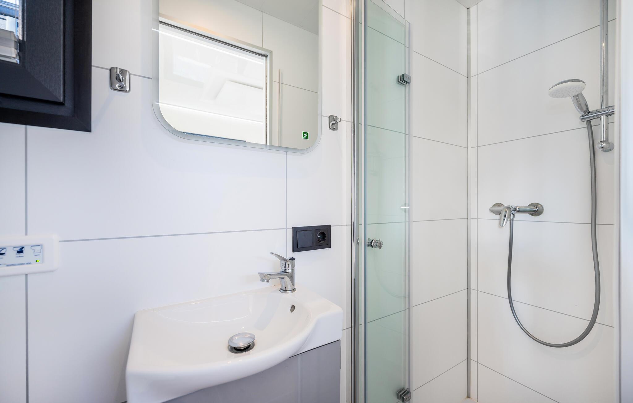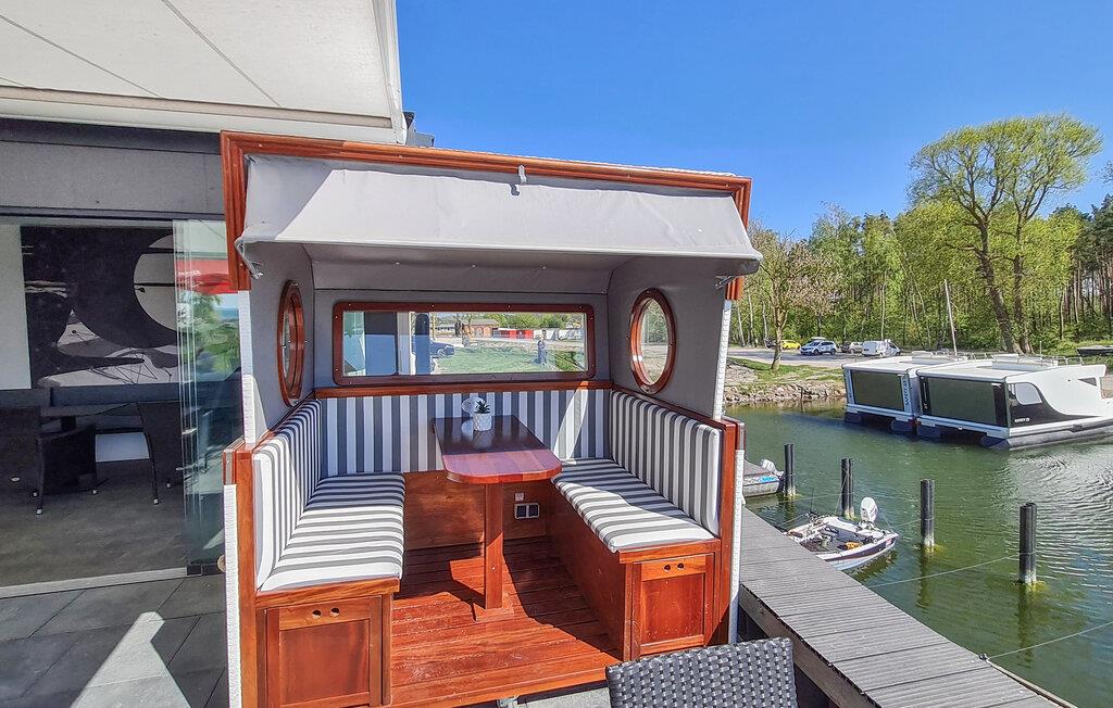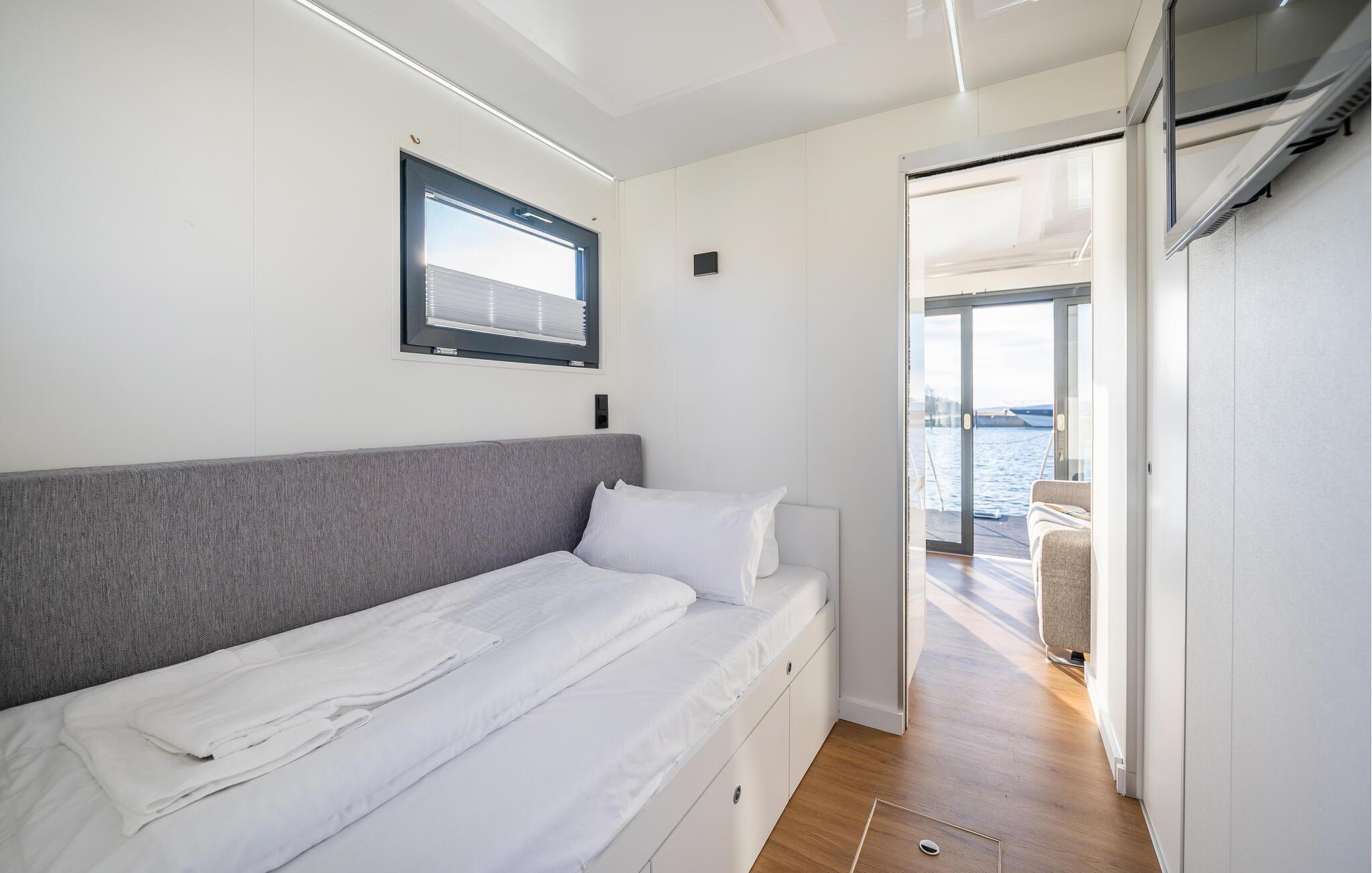 Denne båd er som et slags Tiny-house på vandet og byder på et lille opholdsområde med sovesofa og fladskærms-tv. Det lille separate soveværelse har en udtræksseng, og både stuen og soveværelset har en indgang og udgang til hver deres udendørs terrasse. I finder også et lille badeværelse med bruser, håndvask, toilet og en hårtørrer. Opholdsstuen er udstyret med et lille køleskab, en vask, en kedel og en kaffemaskine. Båden er udstyret med aircondition, så I får det helt rette klima i den lille båd, og på terrassen finder I siddepladser med den smukkeste udsigt over havnebiografen og Jasmunder Bodden.