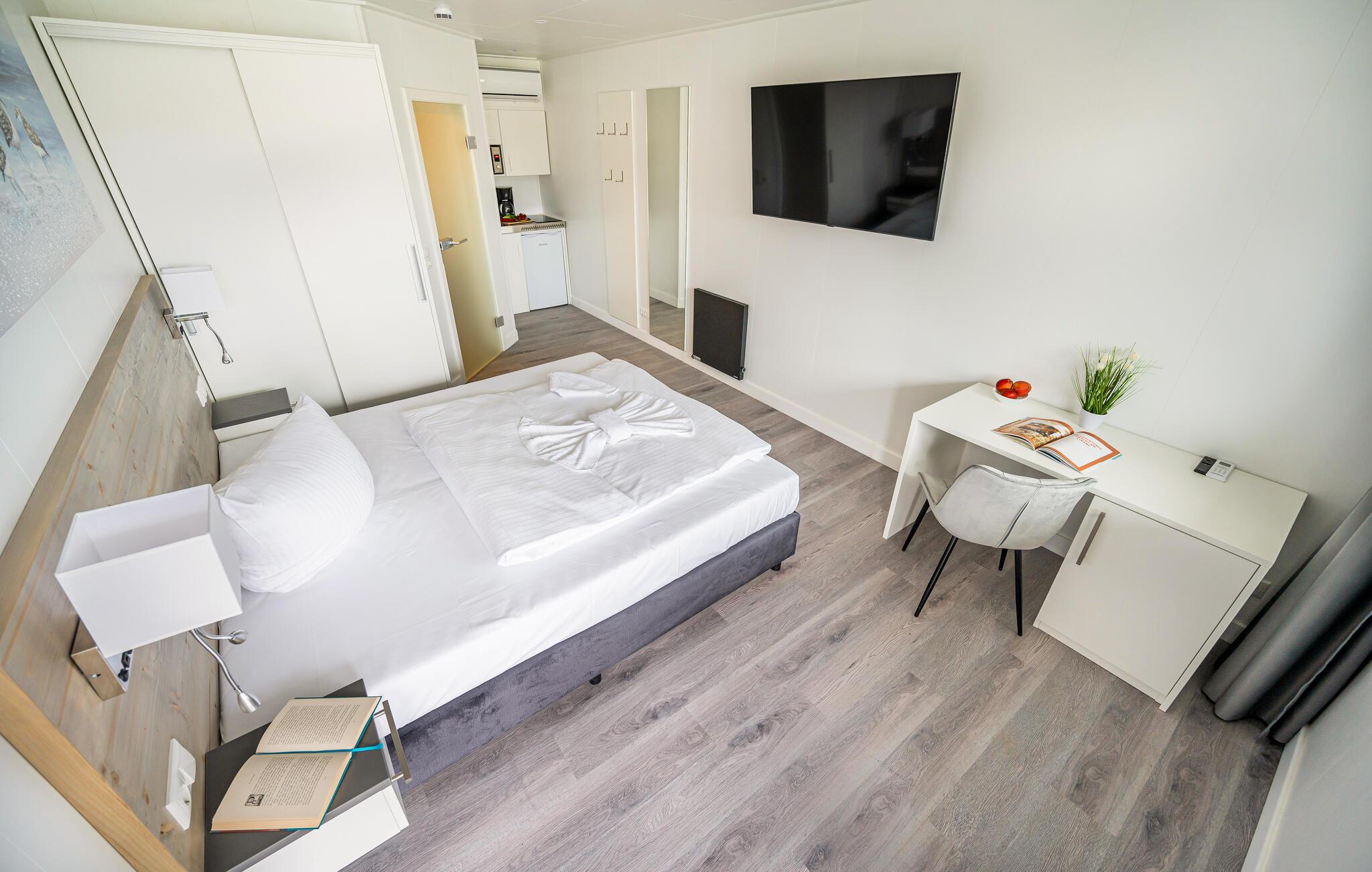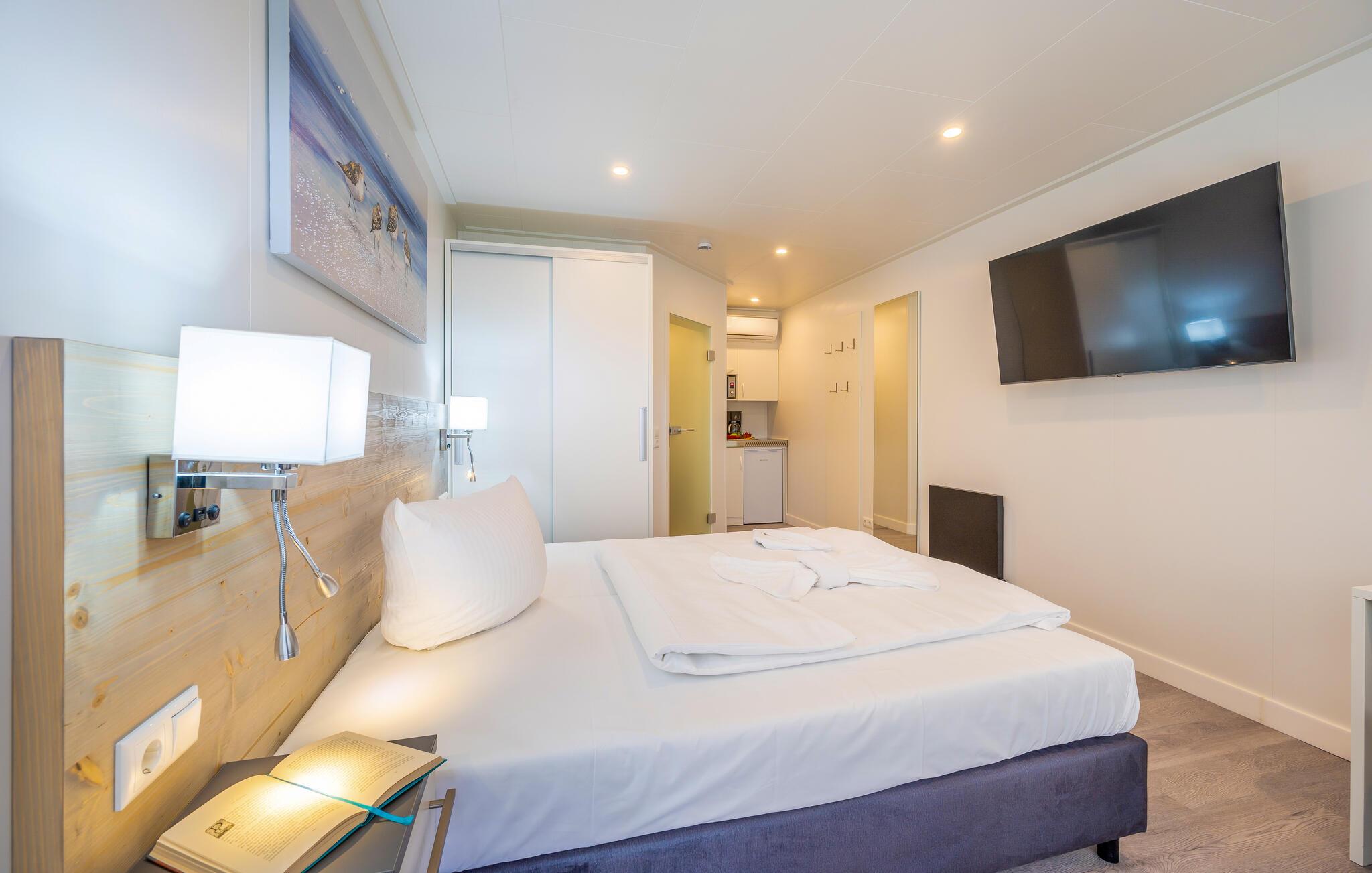 Lejligheden ligger lige i den smukke natur med udsigt til vandet og bådpladserne i lystbådehavnen. Her får I med andre ord den helt perfekte base for en ferie med mange dejlige udflugter på øen. Studio Waterfront har et soveværelse med dobbeltseng og et lille tekøkken. Køkkenet har køleskab, to-brænder kogeplade, kaffemaskine, elkedel, brødrister og mikroovn. Badeværelset er udstyret med bruseniche, håndvask og toilet, og så byder lejligheden på et klimaanlæg med både køle- og varmefunktioner, så I kan finde den helt rette temperatur at slappe af i.