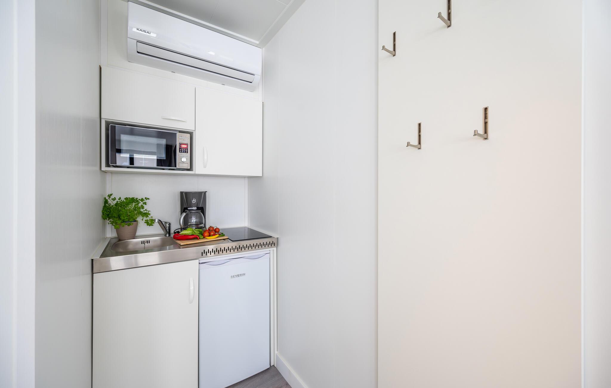 Lejligheden ligger lige i den smukke natur med udsigt til vandet og bådpladserne i lystbådehavnen. Her får I med andre ord den helt perfekte base for en ferie med mange dejlige udflugter på øen. Studio Waterfront har et soveværelse med dobbeltseng og et lille tekøkken. Køkkenet har køleskab, to-brænder kogeplade, kaffemaskine, elkedel, brødrister og mikroovn. Badeværelset er udstyret med bruseniche, håndvask og toilet, og så byder lejligheden på et klimaanlæg med både køle- og varmefunktioner, så I kan finde den helt rette temperatur at slappe af i.