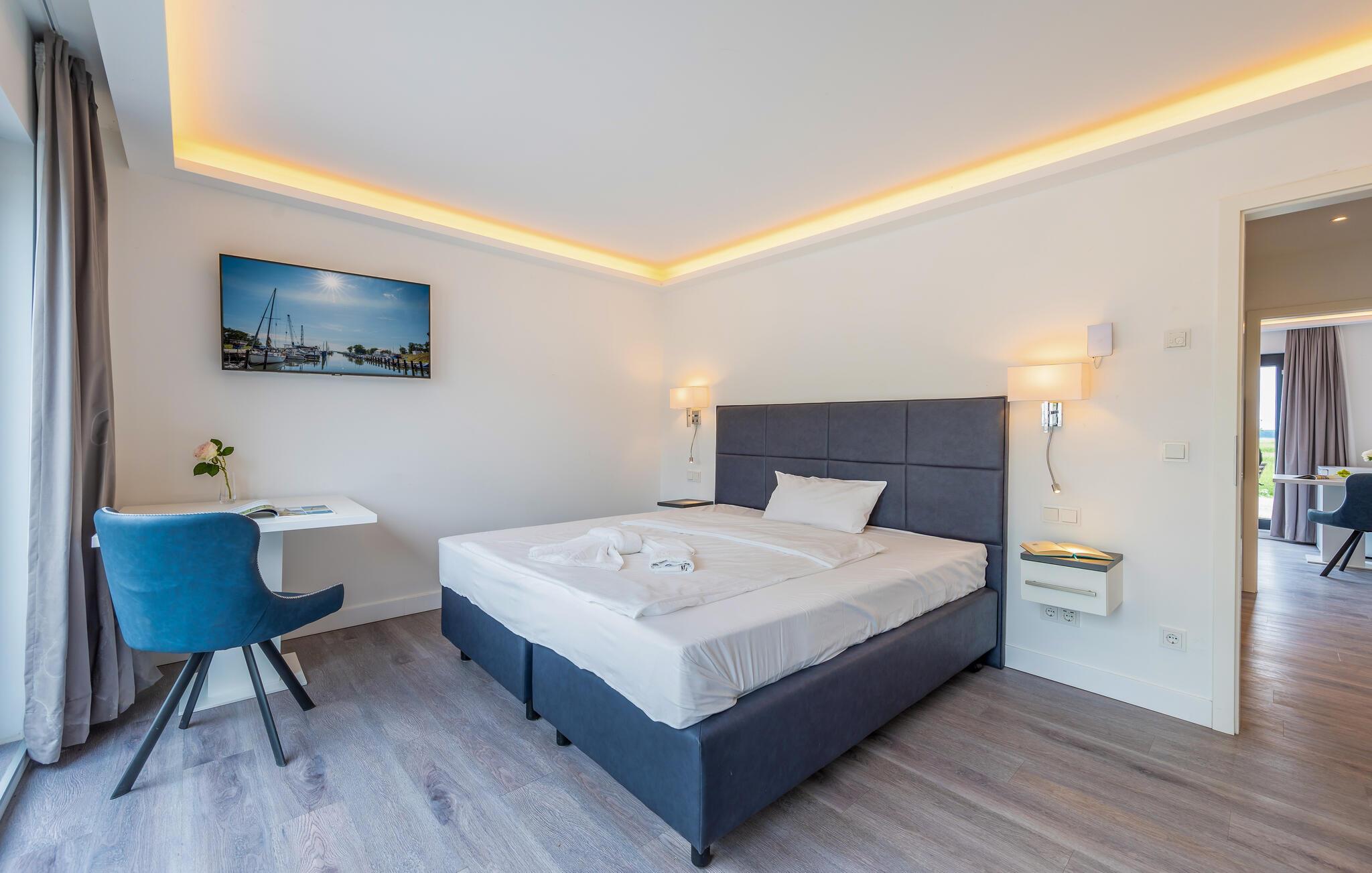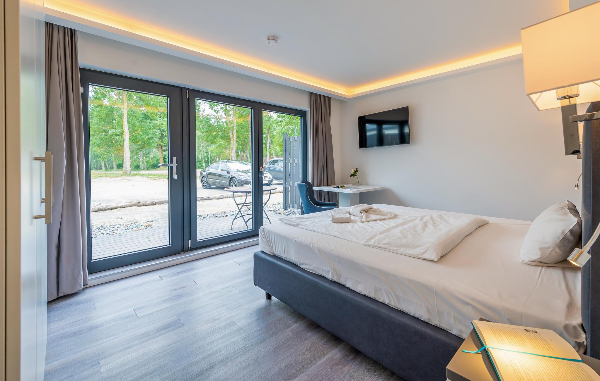Boligen ligger lige ved siden af naturreservatet, bag sivene og lidt hævet over vandet med en fantastisk udsigt over lagunelandskabet. Med andre ord den perfekte beliggenhed til en ferie med masser af store oplevelser. Haus Boddenblick har soveværelse med dobbeltseng og opholdsstue med sovesofa. Begge værelser har en udendørs terrasse med havemøbler. Der er et tekøkken mellem de to værelser, som også giver adgang til badeværelset. Badeværelset er udstyret med stor bruseniche, lille sauna, håndvask og toilet. Køkkenet har køleskab, to-brænder kogeplade, kaffemaskine, elkedel, brødrister og mikroovn. Og så har huset aircondition, så I kan finde den helt rette temperatur at slappe af i.