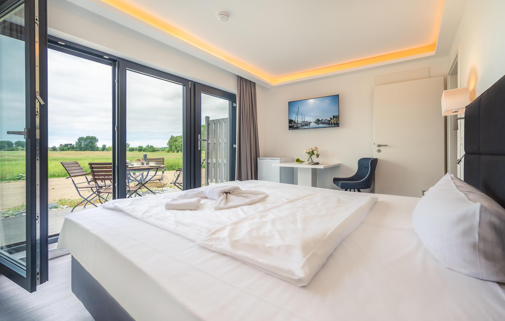Boligen ligger lige ved siden af naturreservatet, bag sivene og lidt hævet over vandet med en fantastisk udsigt over lagunelandskabet. Med andre ord den perfekte beliggenhed til en ferie med masser af store oplevelser. Haus Boddenblick har soveværelse med dobbeltseng og opholdsstue med sovesofa. Begge værelser har en udendørs terrasse med havemøbler. Der er et tekøkken mellem de to værelser, som også giver adgang til badeværelset. Badeværelset er udstyret med stor bruseniche, lille sauna, håndvask og toilet. Køkkenet har køleskab, to-brænder kogeplade, kaffemaskine, elkedel, brødrister og mikroovn. Og så har huset aircondition, så I kan finde den helt rette temperatur at slappe af i.