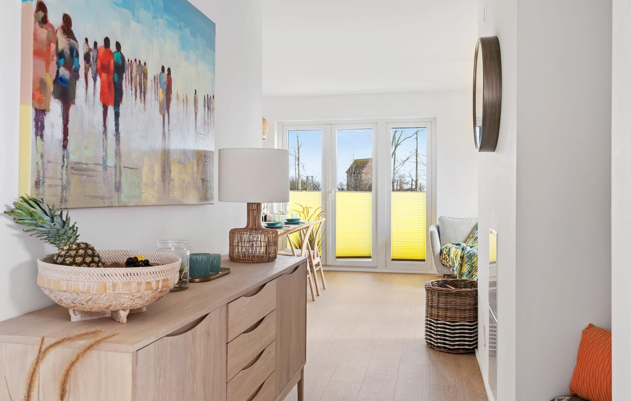Med sin gulv-til-loft vinduesfront og den store tilstødende terrasse er den åbne stue/alrum lejlighedens hjerte. At komme herind og straks føle sig hjemme er én ting. At slappe af i den hyggelige opholdsstue, nyde naturens fred og ro ud af vinduet eller se tv er ren afslapning og rekreation! Hverdagen bliver mere og mere fjern. Skulle vejret nogensinde blive nordisk, vil pejsen med sin brølende ild give yderligere komfort.