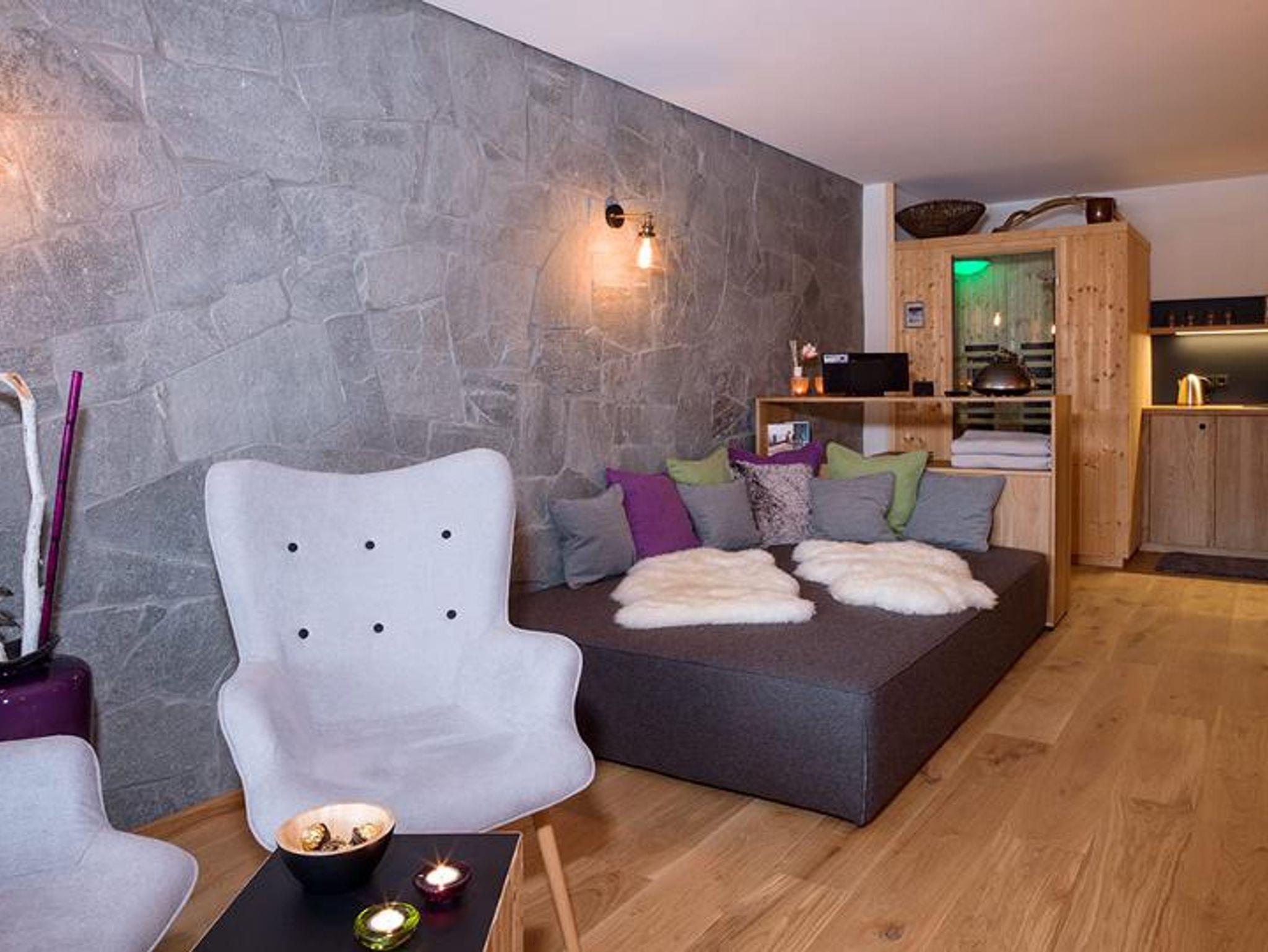 Auf dem großzügigen Panorama-Freisitz mit atemberaubender Aussicht auf den Großen Almberg und den Schwarzkopf können Sie die Seele baumeln lassen und dabei Ihr Frühstück, ein Glas Wein oder einfach nur die Stille der Natur genießen.
