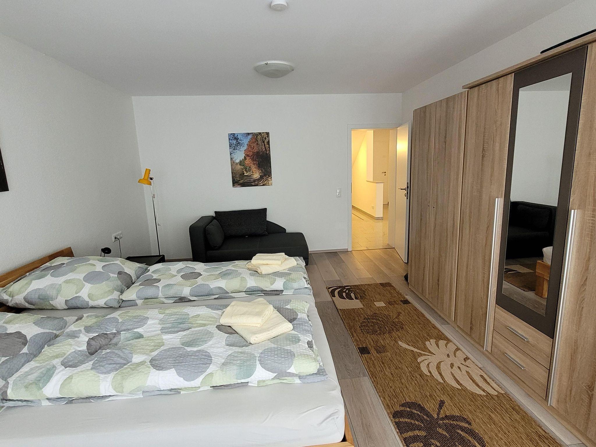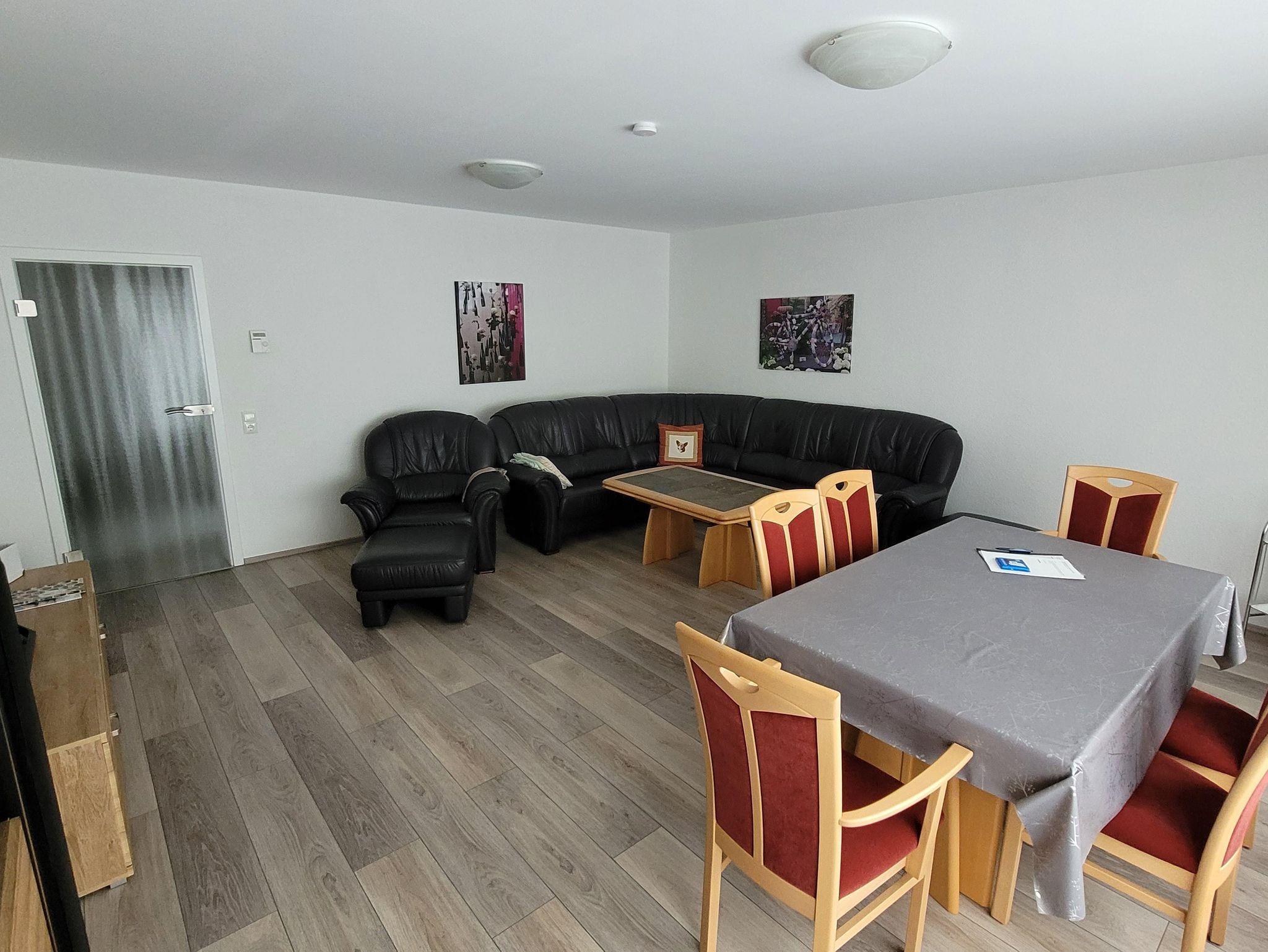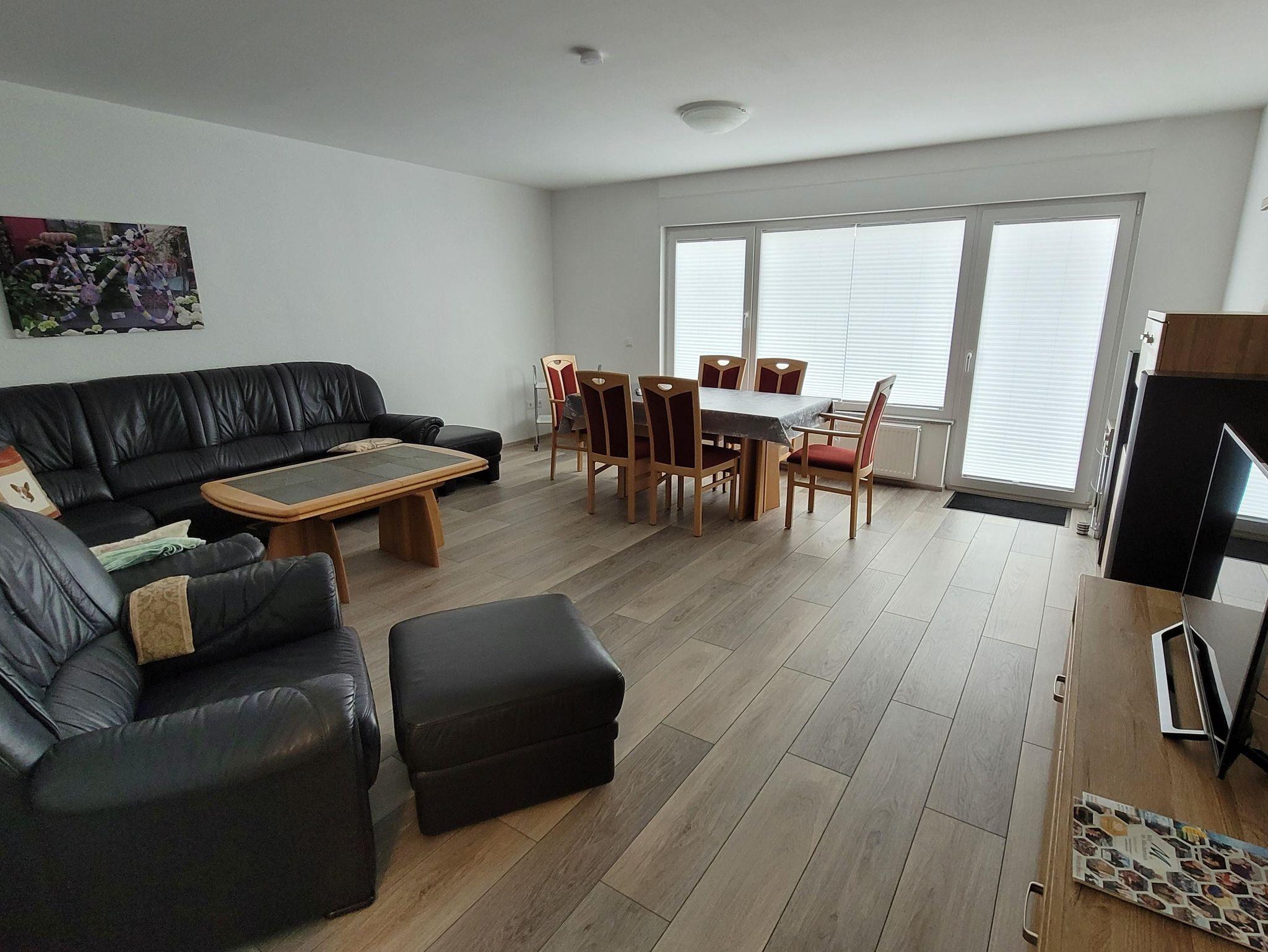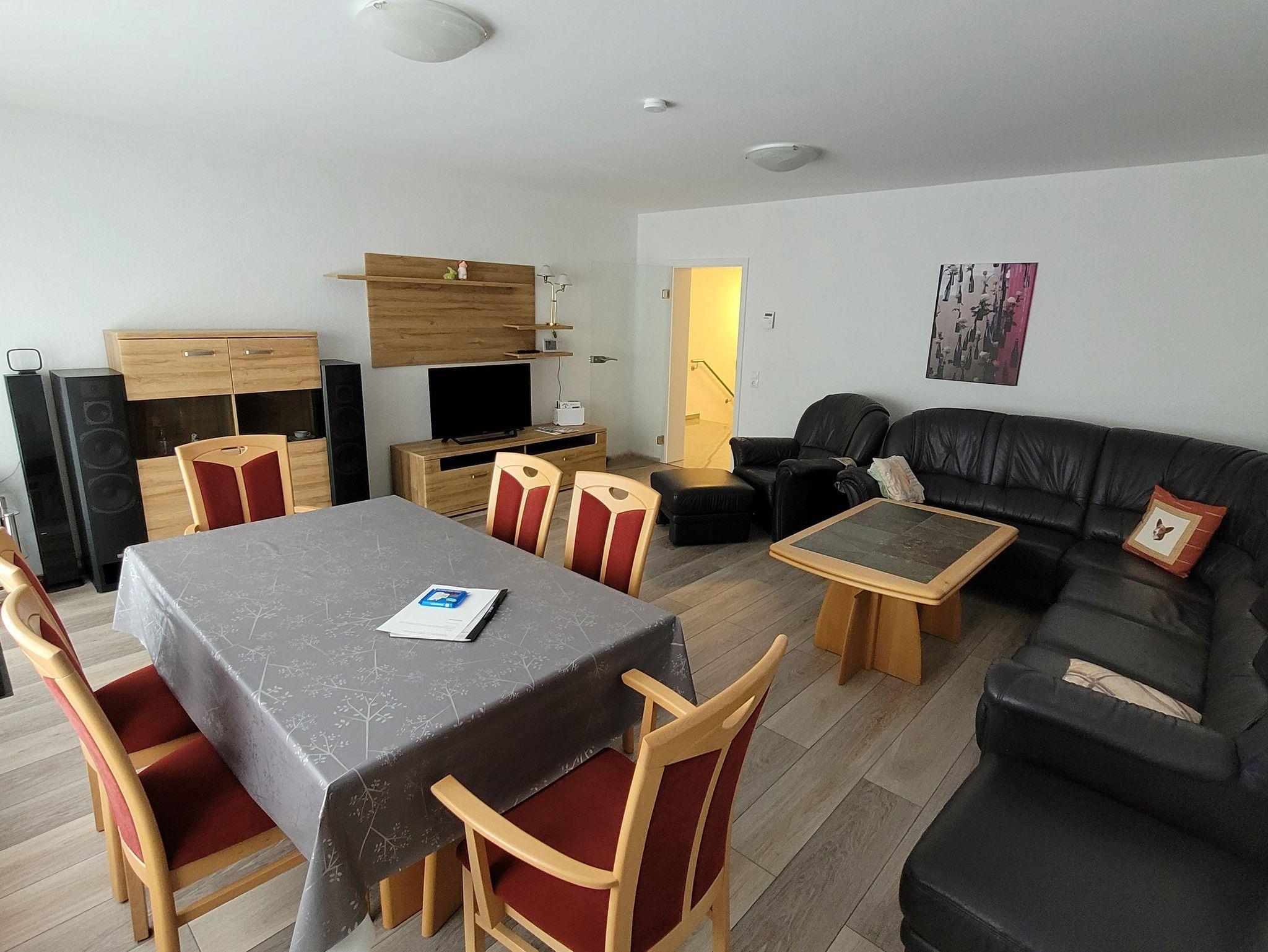 Unsere modern eingerichtete Ferienwohnung verfügt über zwei Schlafzimmer, ein Wohnzimmer mit Essgruppe, eine Küche, ein Badezimmer (Dusche/ WC) und daneben ein separates Gäste WC. Im großen Schlafzimmer befindet sich ein Doppelbett und eine Schlafcoach, im weiteren Zimmer zwei Einzelbetten. So haben in der Wohnung maximal fünf Personen Platz.