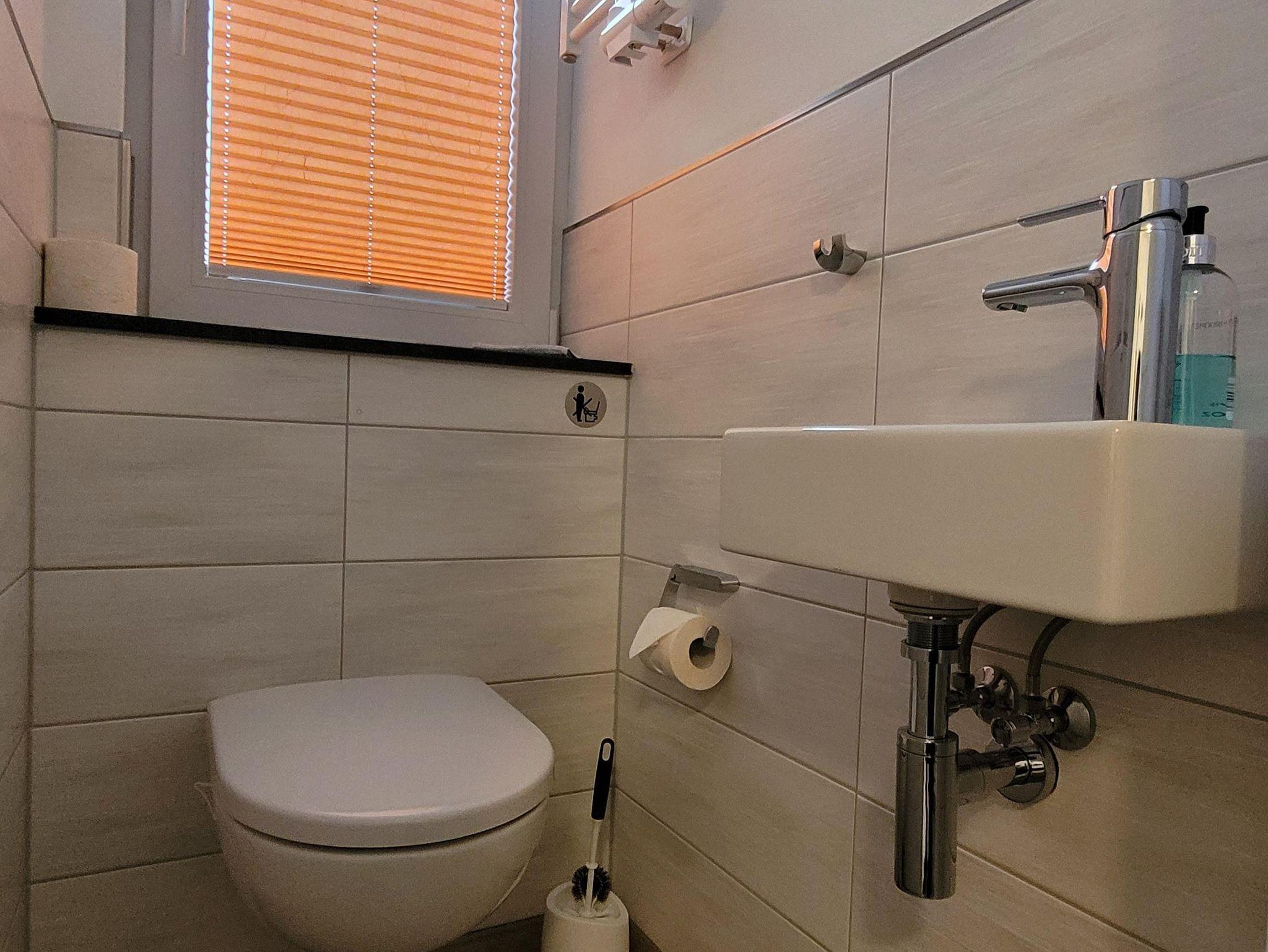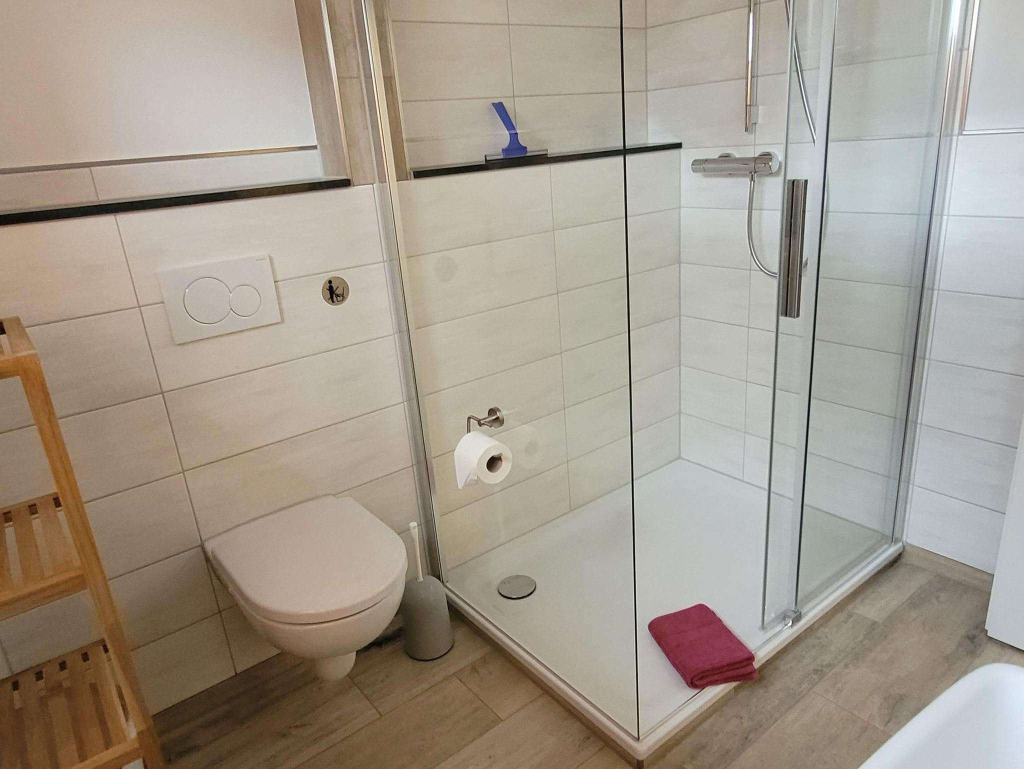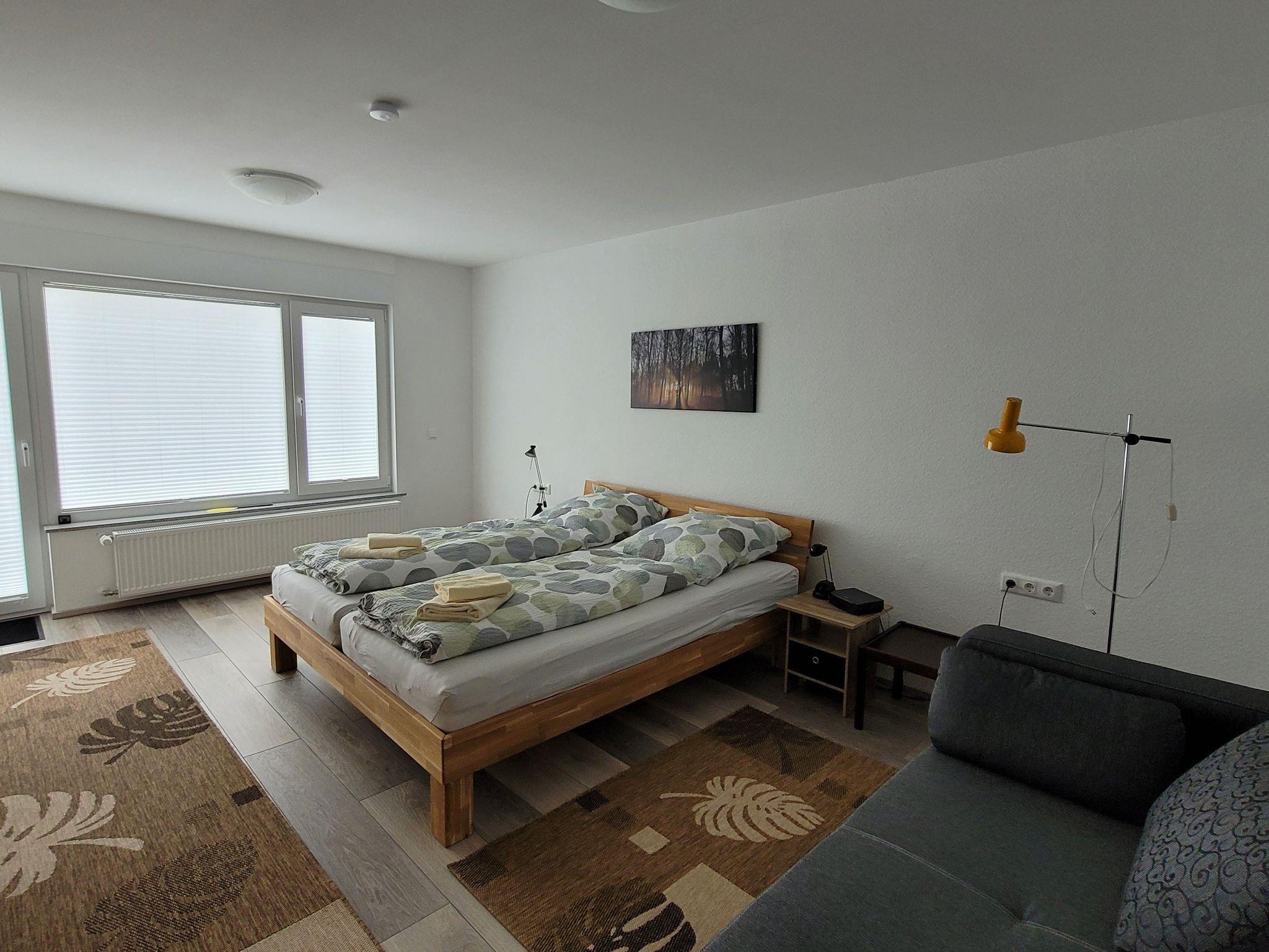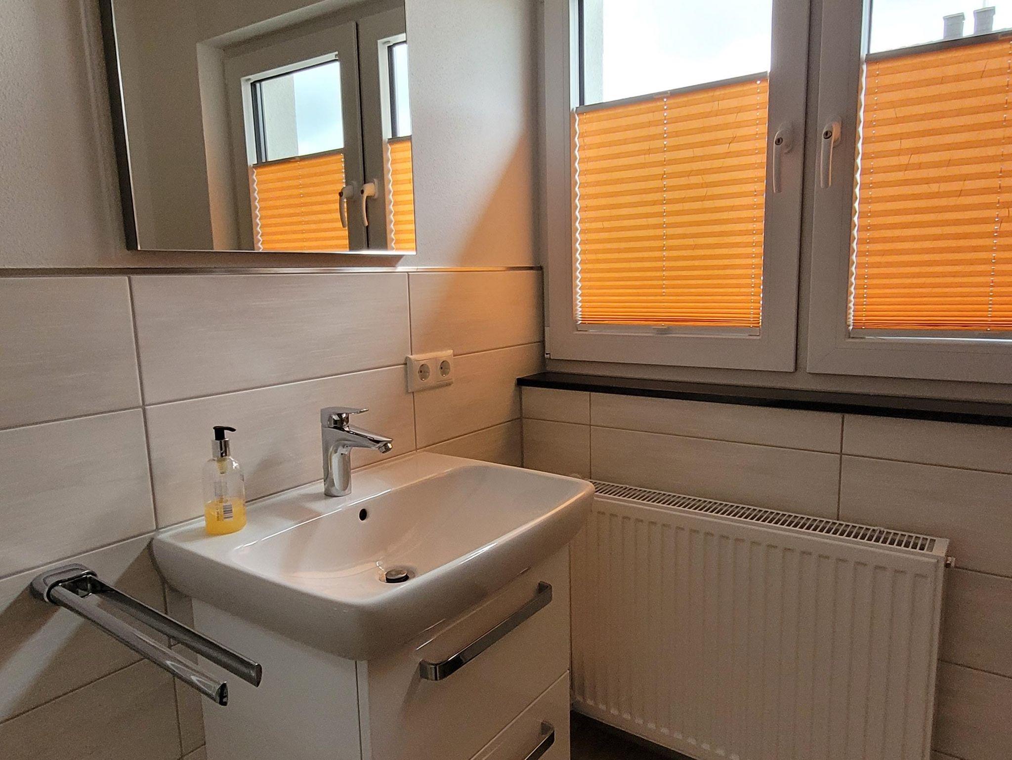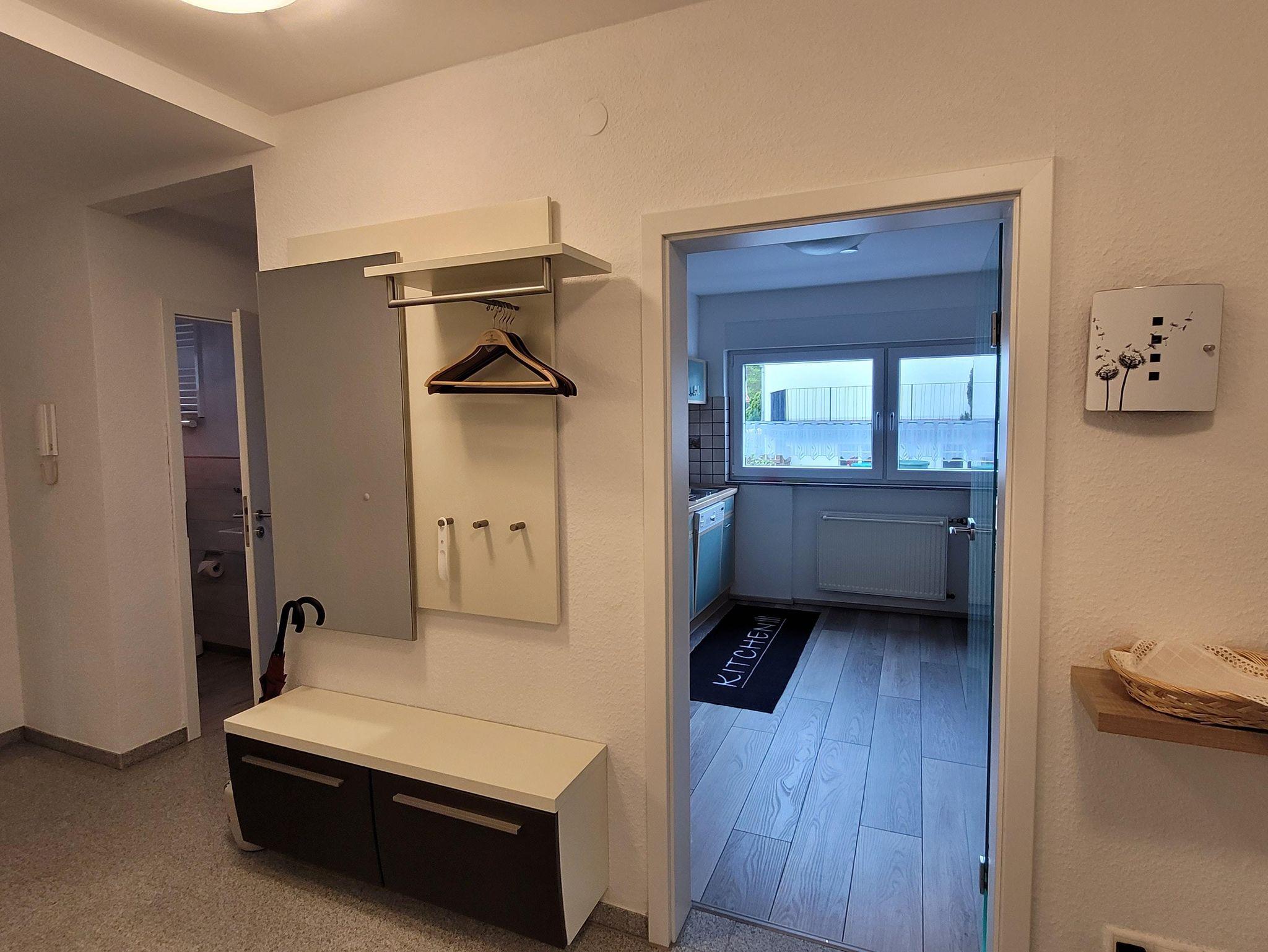 Unsere modern eingerichtete Ferienwohnung verfügt über zwei Schlafzimmer, ein Wohnzimmer mit Essgruppe, eine Küche, ein Badezimmer (Dusche/ WC) und daneben ein separates Gäste WC. Im großen Schlafzimmer befindet sich ein Doppelbett und eine Schlafcoach, im weiteren Zimmer zwei Einzelbetten. So haben in der Wohnung maximal fünf Personen Platz.
