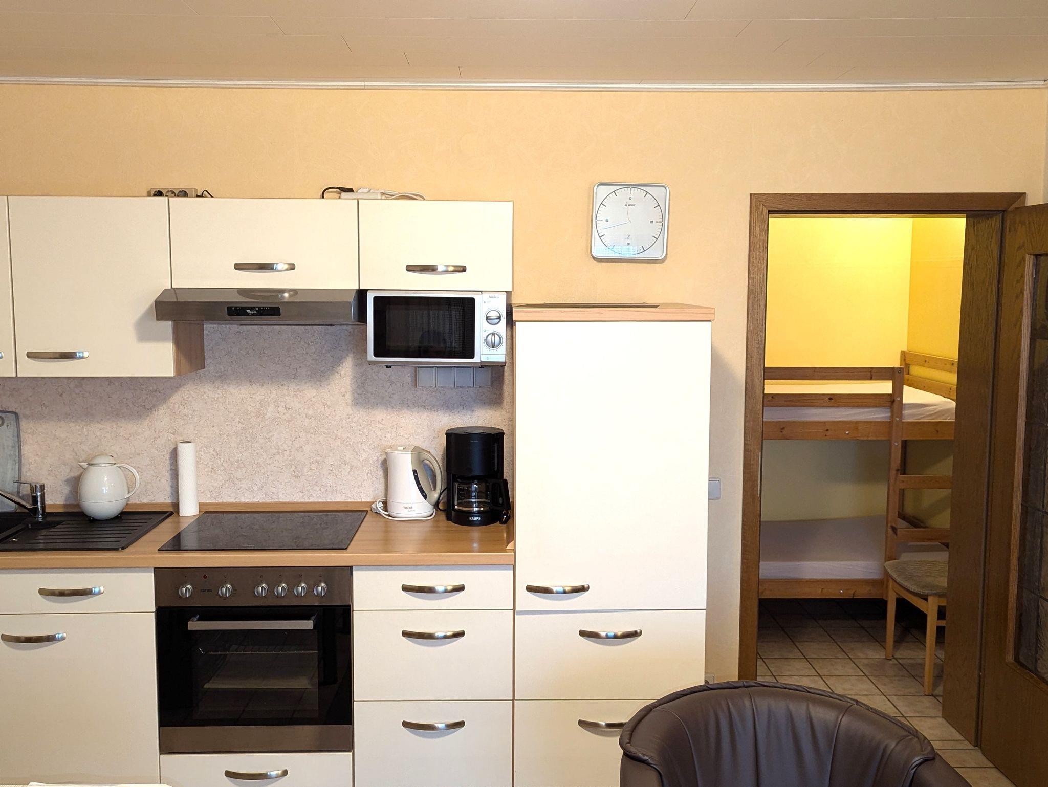 Ein gemütliches Apartment mit einer voll ausgestatteten Küche und einer Terrasse mit herrlicher Panoramaaussicht auf das Sauerland. Dieses Apartment bietet viel Platz und ist ideal für 2 Erwachsene und 2 Kinder. Ein Etagenbett für 2 Kinder befindet sich in einer Nische im Korridor.