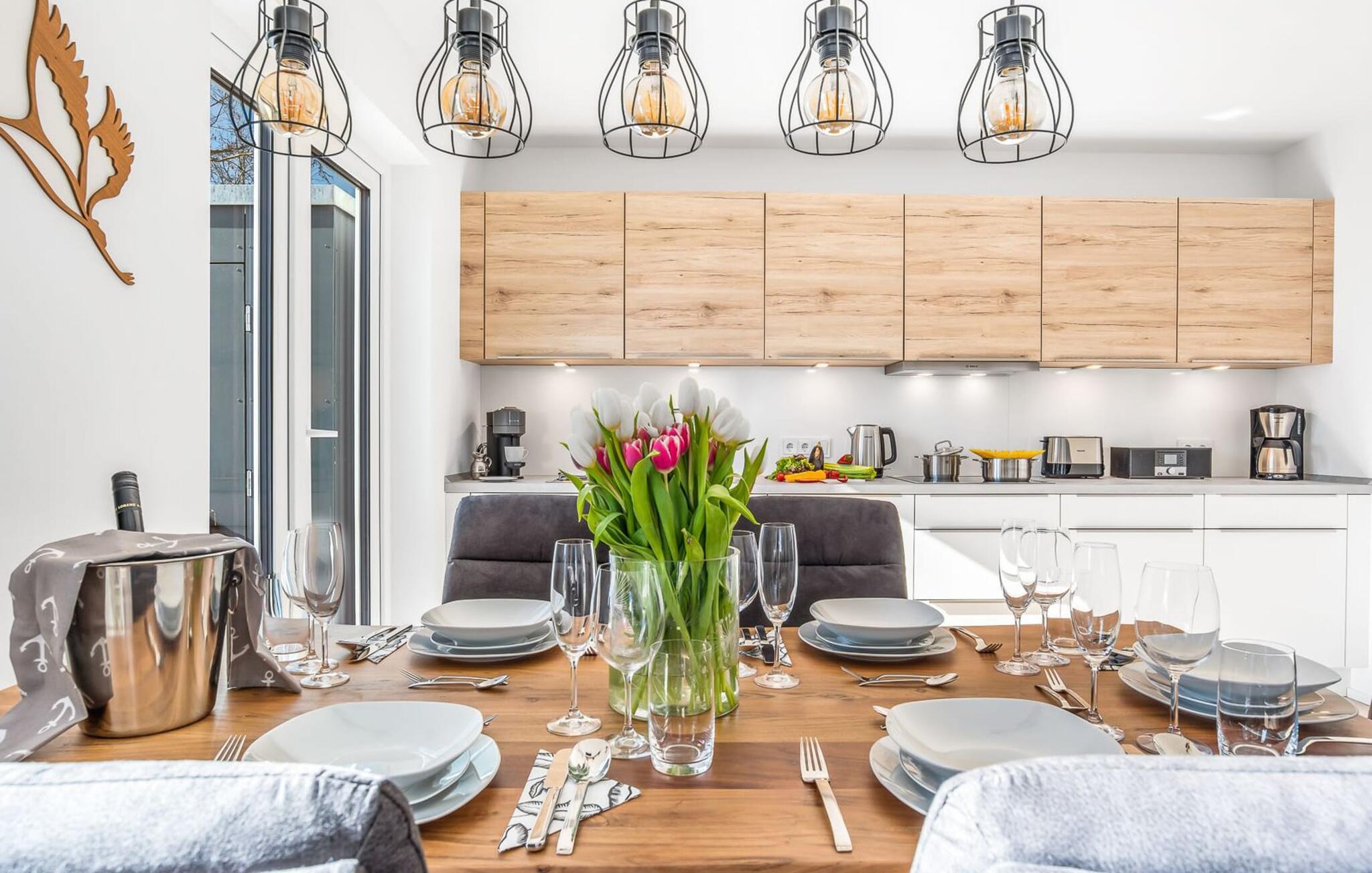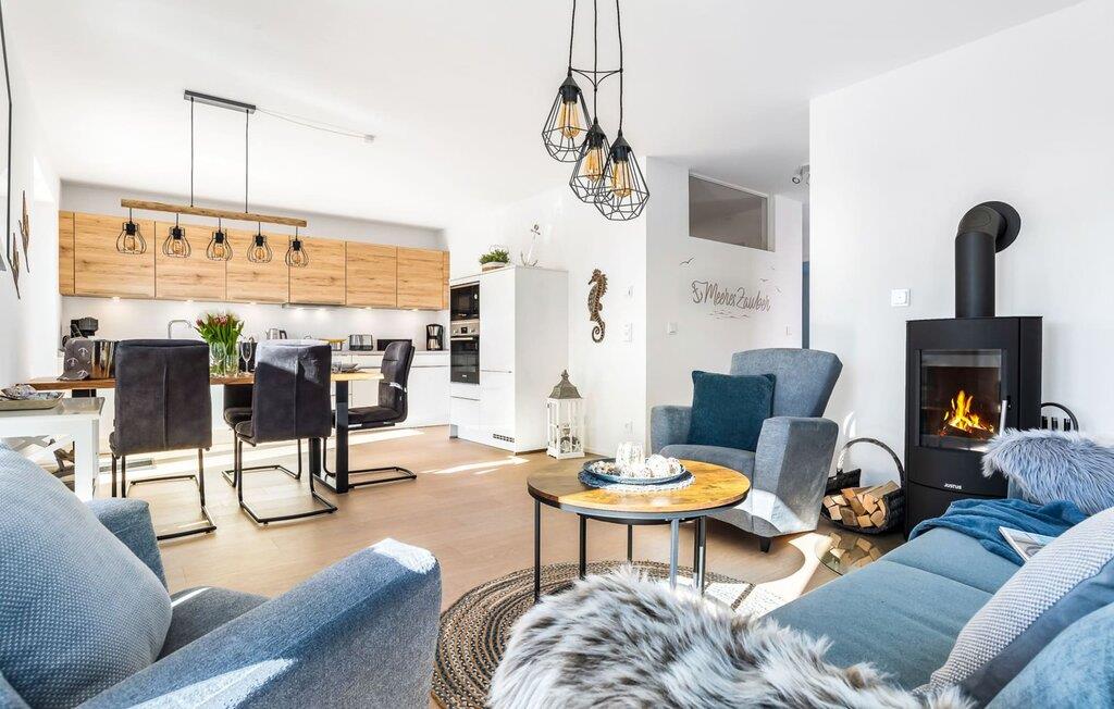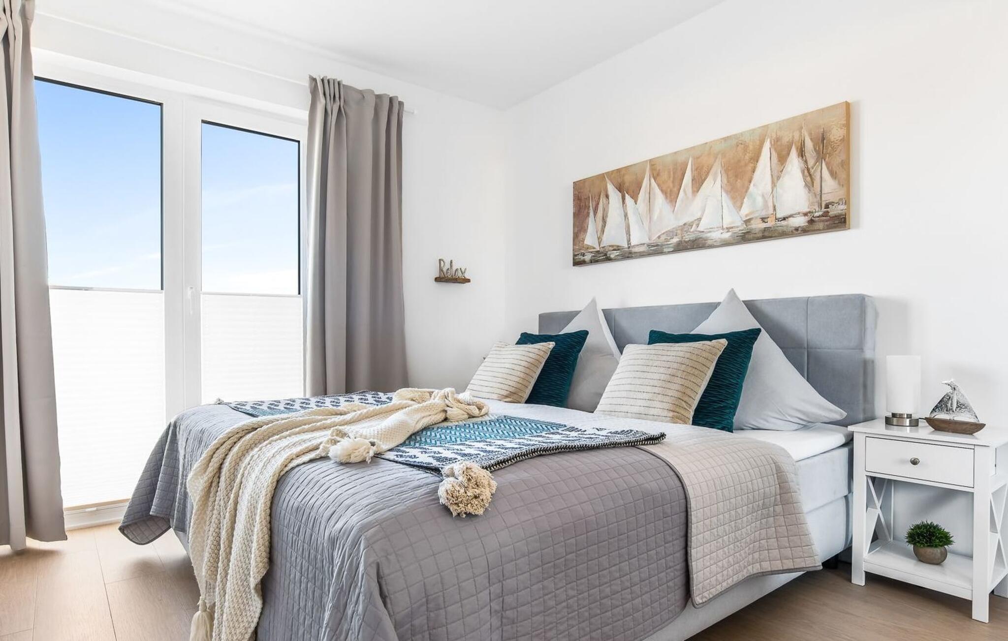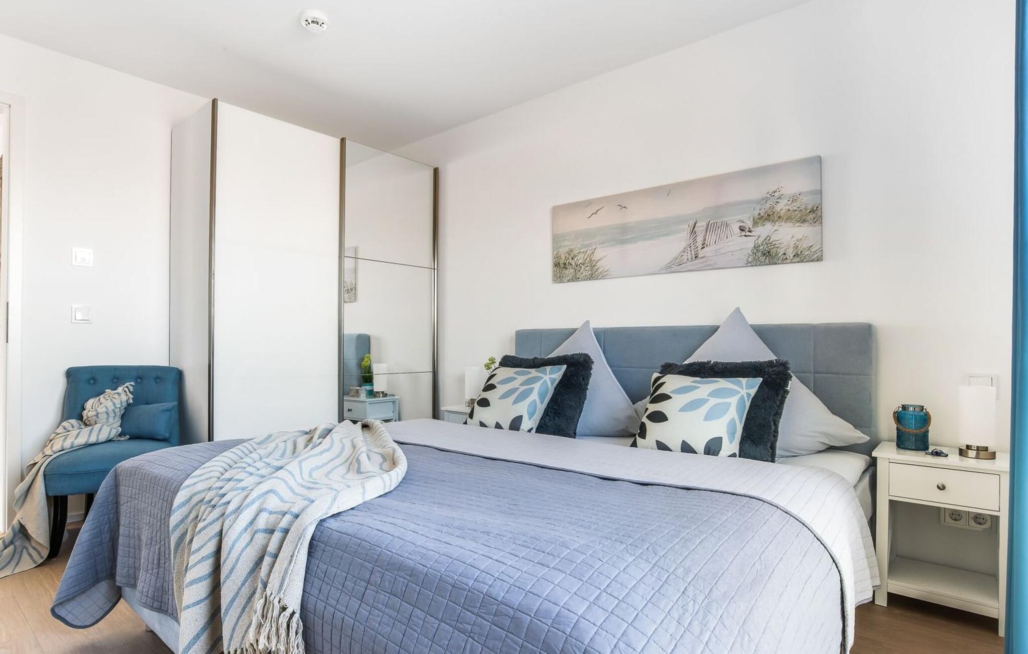 MeeresZauber er en rummelig og rummelig ferielounge i stueetagen med direkte udsigt over de naturbevarende strandenge og marker. Den naturlige sandstrand Weidefelder med kiosk, restaurant, strandstole og forskellige muligheder for vandsport kan nås på få hundrede meter. Firbenede venner kan også slippe dampen ud på hundestranden bagerst. I umiddelbar nærhed er der også den fantasifuldt designede Adventure Golf minigolfbane og lystbådehavnen i OstseeResort Olpenitz med forskellige indkøbsmuligheder. Med vinduesfronten fra gulv til loft og den store tilstødende terrasse er den åbne stue/alrum lejlighedens hjerte. De lyse værelser og moderne indretning får jer til at føle jer velkommen fra første øjeblik. Den hyggelige opholdsstue inviterer til afslapning og den knitrende pejs gør det rigtig hyggeligt selv på dårlige vejrdage. Det fuldt udstyrede køkken får amatørkokkenes hjerter til at slå hurtigere. At lave mad sammen er sjovt her! Direkte fra stuen kommer man ind på den store sydvendte terrasse. Her er terrassemøbler og grill til rådighed for at nyde Østersøsolen eller for at afslutte dagen med en grillaften sammen. To soveværelser med komfortable dobbelte boxmadrasser er tilgængelige til afslapning om natten. Derudover er begge soveværelser hver udstyret med et fjernsyn. Babyer er også velkomne, da en rejseseng og høj stol er til rådighed. Bruserummet med en regnbruser på gulvniveau og en infrarød sauna sikrer uforglemmelige wellness-øjeblikke, der runder en perfekt feriedag af. Det er også praktisk at have egen parkeringsplads lige foran ferielejligheden. Vores yndlingssted: gå langs naturstien på den korteste vej til Weidefelder-stranden, slap af, hop i det kølige vand i Østersøen og nyd havets magi... Bemærk venligst: OstseeResort Olpenitz er meget populært, og der bygges fortsat i parken. Ikke desto mindre kan I se frem til en 5-stjernet standard og et førsteklasses ophold. Byggeaktiviteterne kommer ikke til at forstyrre jer på ferien, og derfor gives der ikke yderligere afslag i prisen.