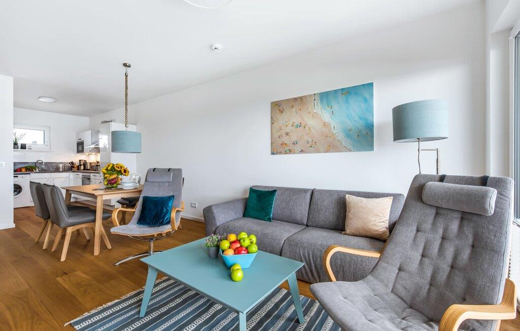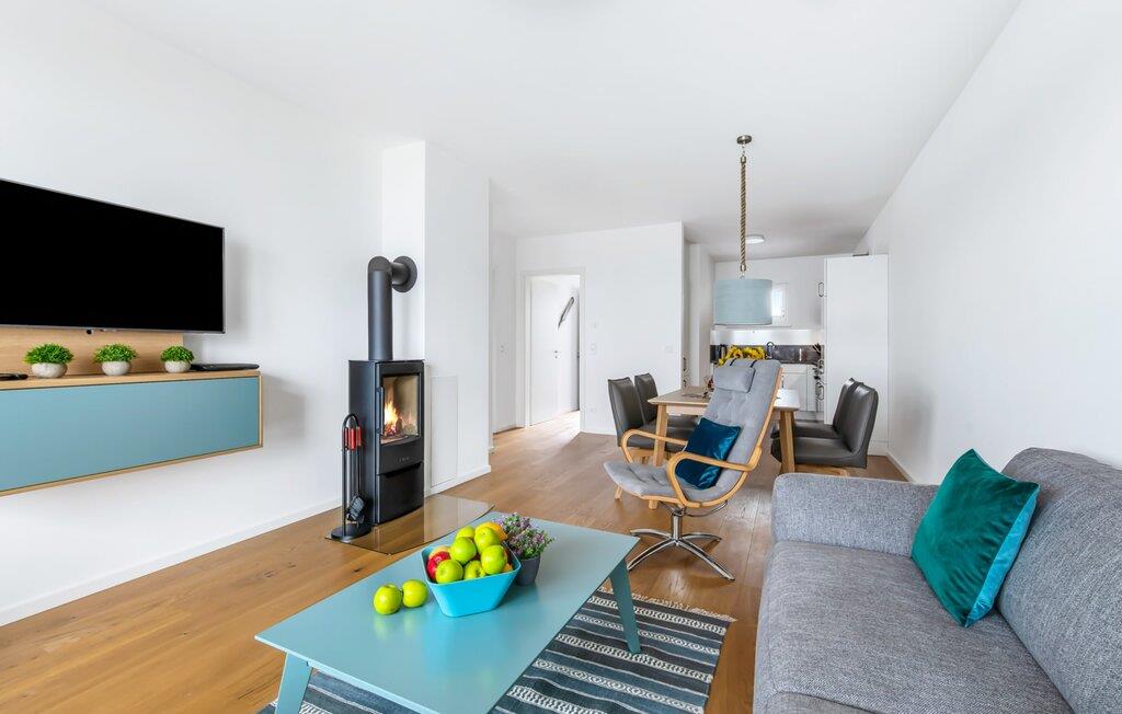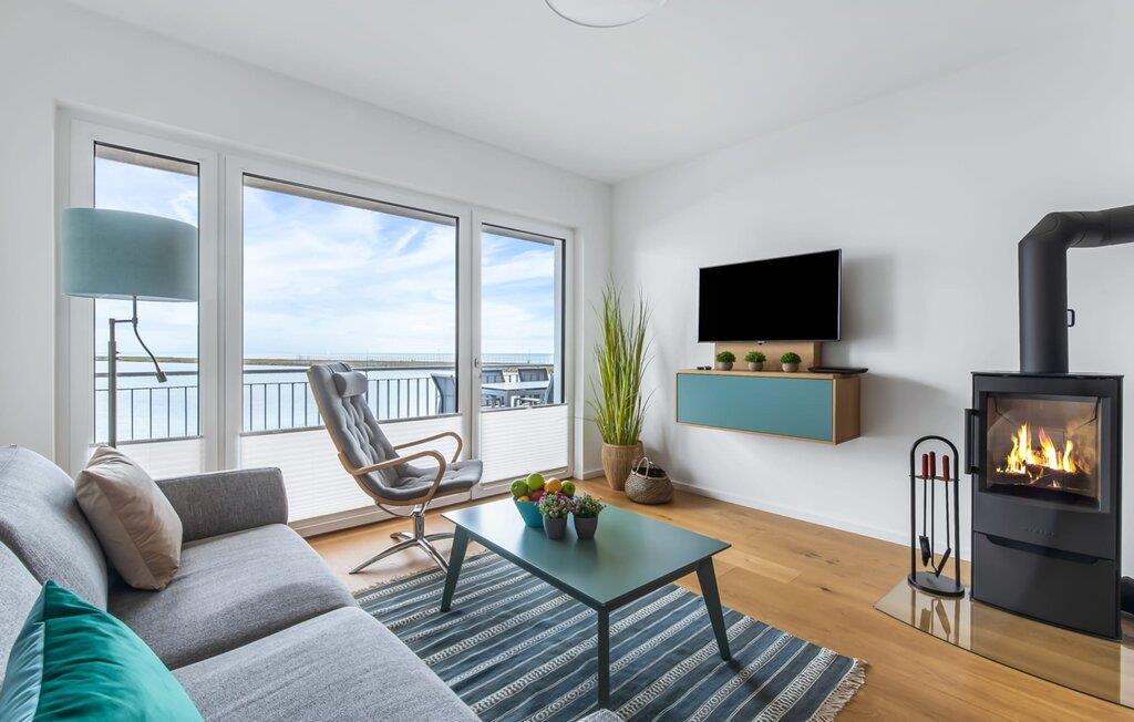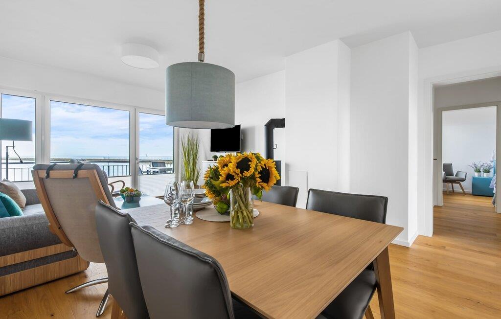 Moderne og elegant, indrettet i sarte farver og trætoner, det åbne opholds- og spiseområde i ferielejligheden lyser virkelig op. Et fjernsyn og pejsen sørger for hyggelige aftener, hvis I ikke længere vil se på vandet gennem vinduerne fra gulv til loft. Den komfortable sofa kan omdannes til en soveplads for yderligere to gæster med få enkle trin.