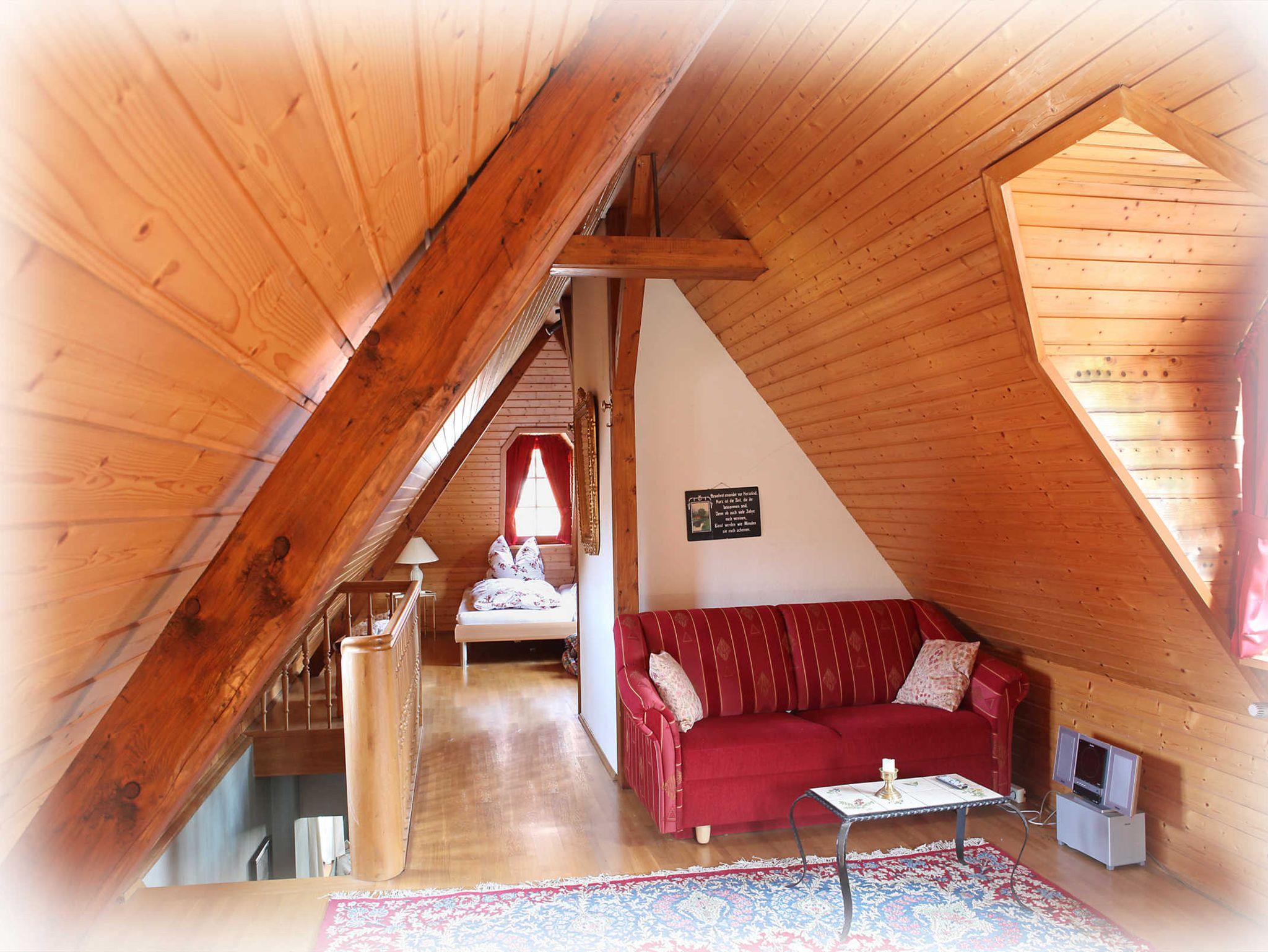 Die Wohnung B erstreckt sich über das 2. Obergeschoss sowie das Dachgeschoss des Hauses. Sie besteht aus Wohnzimmer mit angeschlossenem großzügigen Küchenbereich, Schlafzimmer, Bad und getrenntem WC. Ein weiterer geräumiger Wohnraum mit eigenem Schlafgemach befindet sich im Dachgeschoss des Hauses. Dort ist auch der Fernseh-Bereich mit Sofa und Doppelbettcouch angesiedelt.