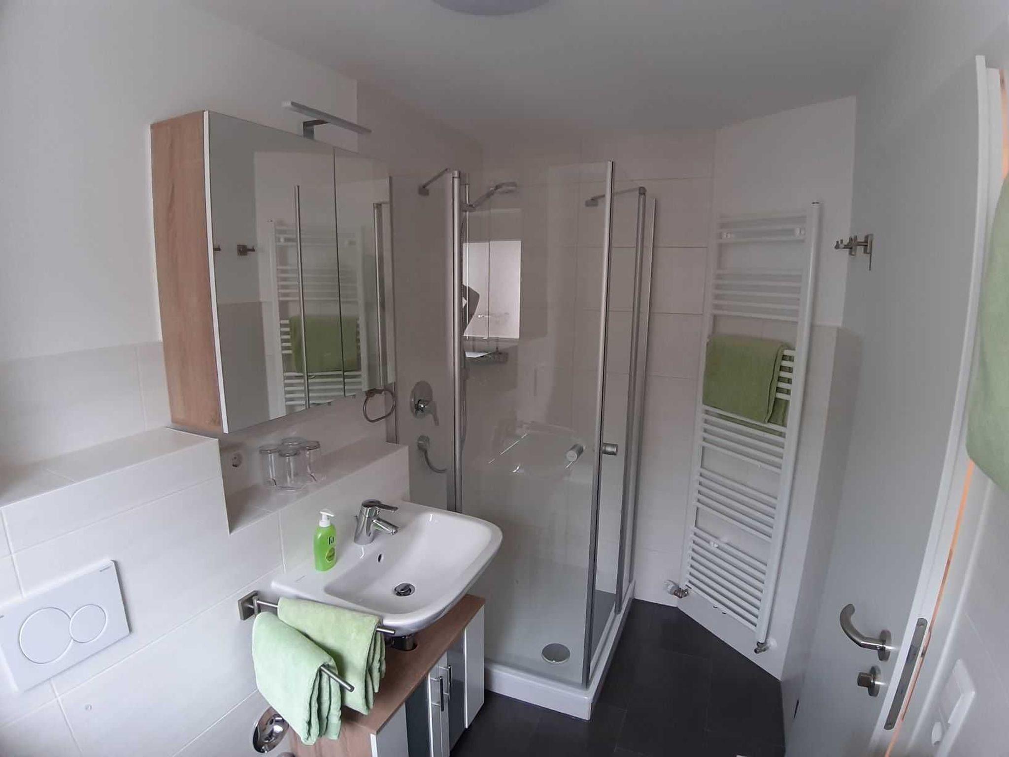 Das Badezimmer hat Tageslicht über ein zu öffnendes Fenster und ist ausgestattet mit Dusche/WC, Kosmetikspiegel, Haartrockner und Toilettenpapier.