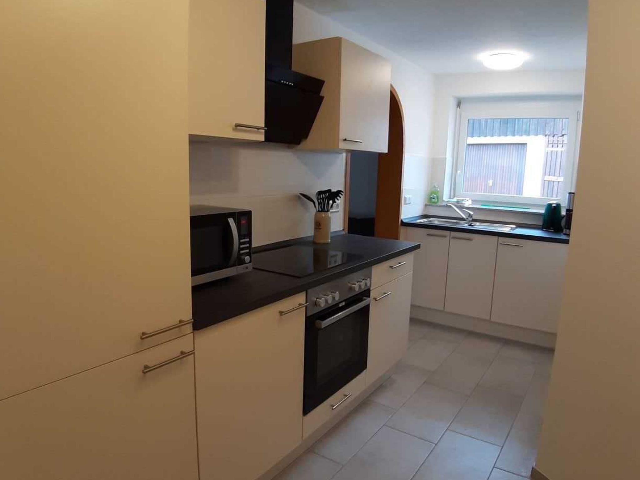 Die Küche verfügt über einen Kühlschrank inkl. Gefrierfach, Ceran-Kochfeld, Dunstabzugshaube, Backofen, Mikrowelle, Geschirrspülmaschine, Wasserkocher und Filterkaffeemaschine. Es sind entsprechend ausreichend Geschirr, Gläser, Schüsseln und Töpfe vorhanden.