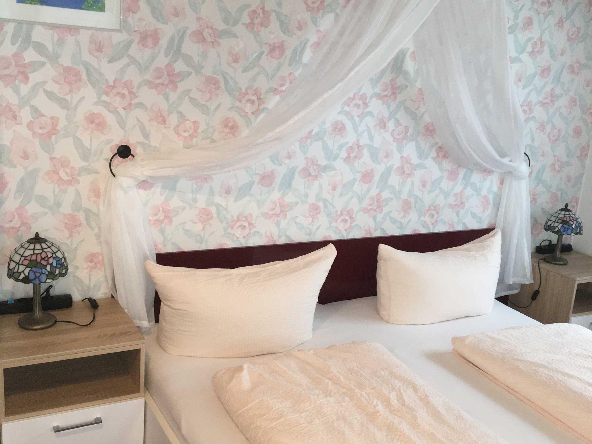 Ruhige Pension in sonniger Lage. In Gartenanlage ohne Verkehrslärm. Vier Gehminuten zur Altstadt, kostenlose Parkplätze und abschließbare Fahrradgarage direkt am Haus, Doppelzimmer mit Kühlschrank, Geschirrschrank, DU/WC, TV, Tresor, Wlan und zum größten Teil mit Balkon oder Terrasse. Zimmer ohne Frühstück, Frühstücksmöglichkeiten in der nahen Altstadt.