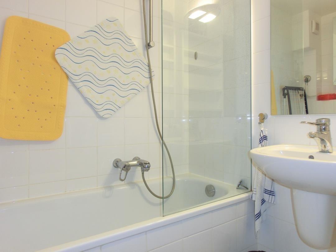 1 Badezimmer mit Badewanne m. Duschwand, Waschtisch und WC