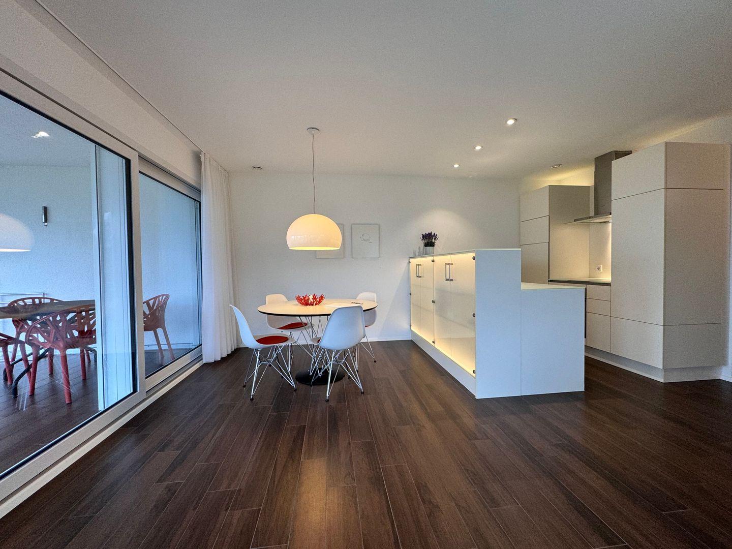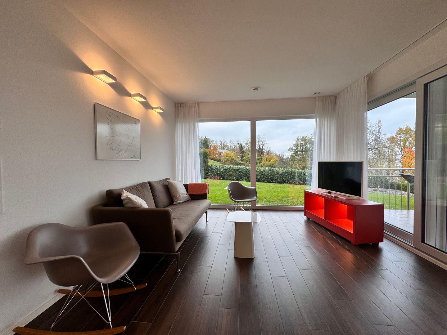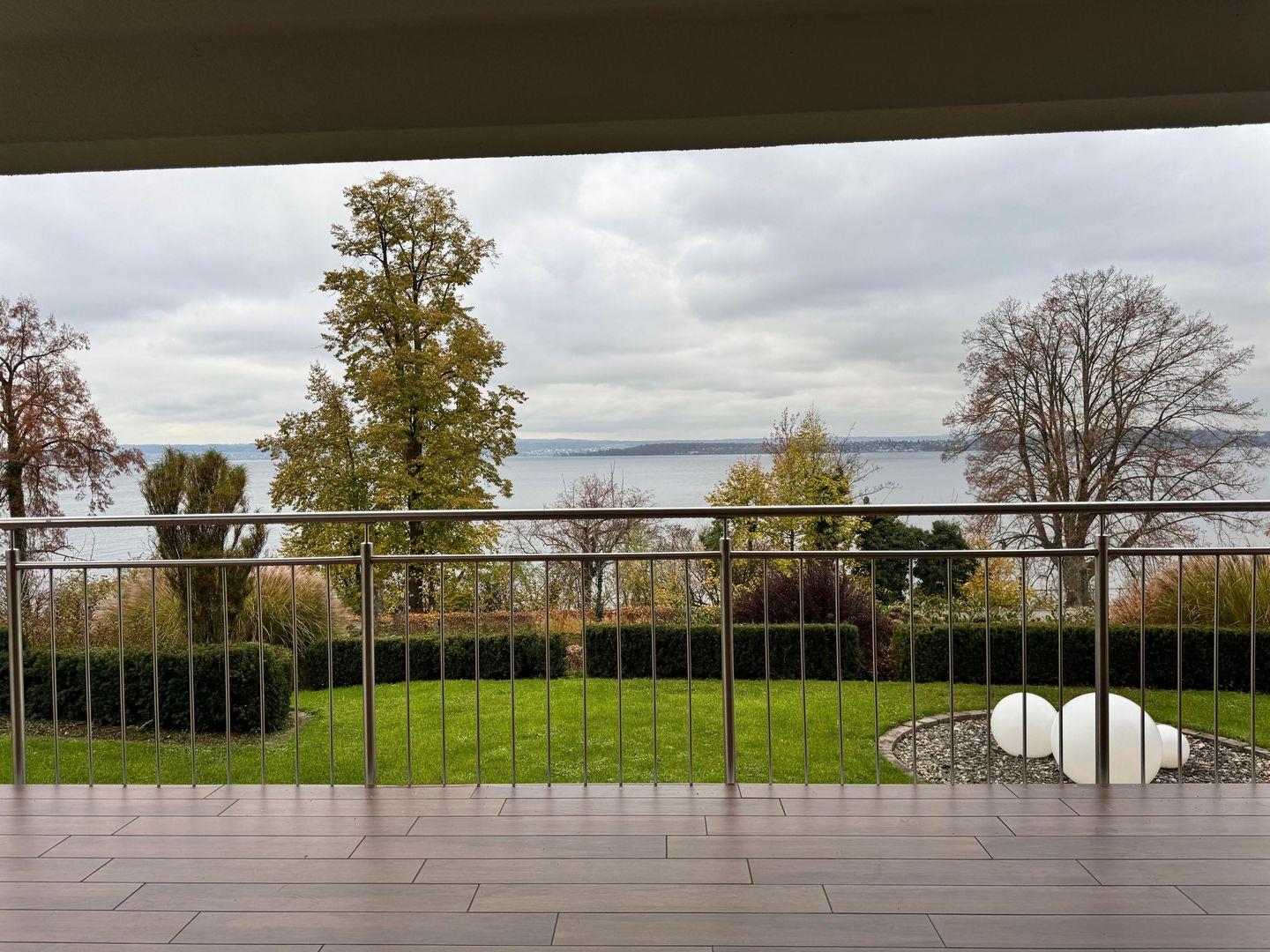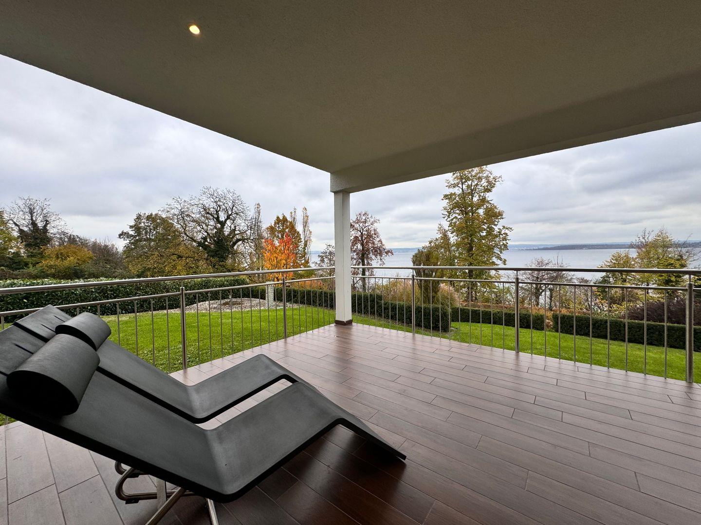 Herzstück der Unterkunft ist das offen gestaltete Wohn- und Esszimmer mit direktem Zugang zum überdachten, geschlossenen Balkon (25 m²). Von hier aus genießen Sie einen außergewöhnlich guten Seeblick sowie Ausblicke auf die umliegende Landschaft und den Garten. Die Balkonmöblierung mit Sonnenliegen und weiteren Gartenmöbeln lädt zum Verweilen und Genießen der natürlichen Umgebung ein. Alle Fenster sind mit Sichtschutz versehen und sorgen für Privatsphäre.
