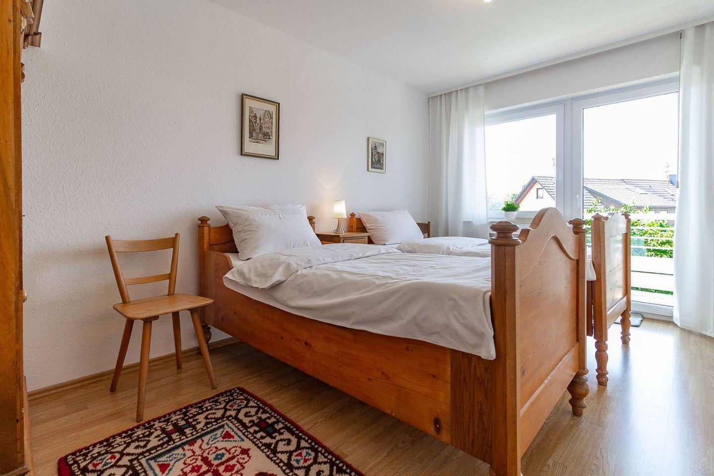 Egal, ob Sie zu zweit Wert auf viel Platz legen oder Ihre 6-köpfige Familie ausreichend Raum für jeden wünscht, in der Ferienwohnung Silvanerlaube A finden Sie ihr Urlaubsdomizil für entspannte Tage. Die Küche und das Esszimmer bieten genug Platz, um auch gerne Zuhause zu kochen. Vielleicht einen Bodensee-Fisch vom Markt? Auf dem großen Eckbalkon können Sie dem Lauf der Sonne vom Morgen bis zum Nachmittag folgen. Die Wohnung ist hochwertig, teilweise mit wertvollen Antik-Möbeln und Parkettboden ausgestattet. Ein Schlafzimmer ist mit einem Doppelbett ausgestattet, im zweiten Schlafzimmer befindet sich ein kleines Doppelbett (1,40 x 2,20 m) und im drittel Schlafzimmer stehen 2 Einzelbetten.