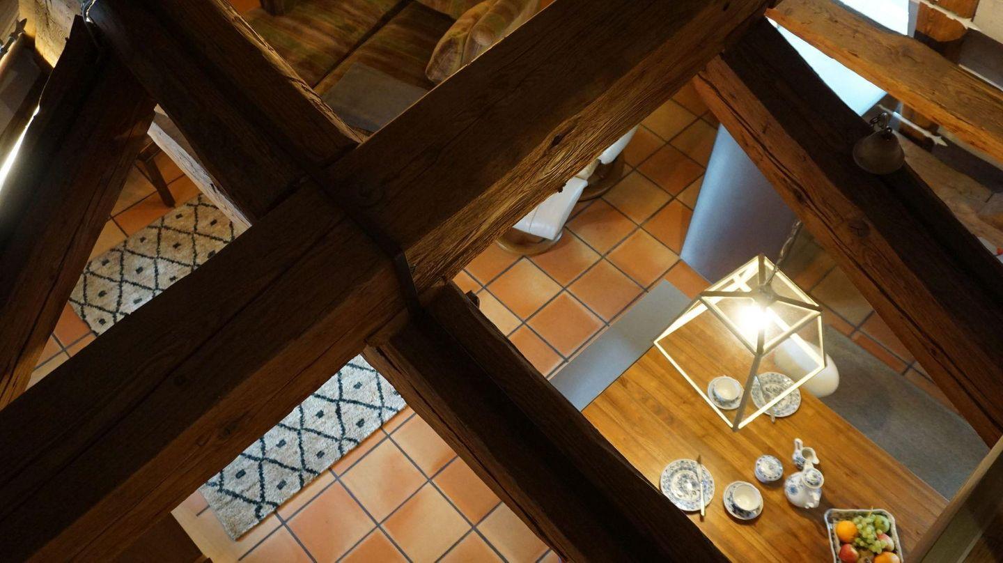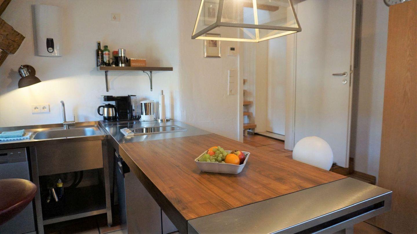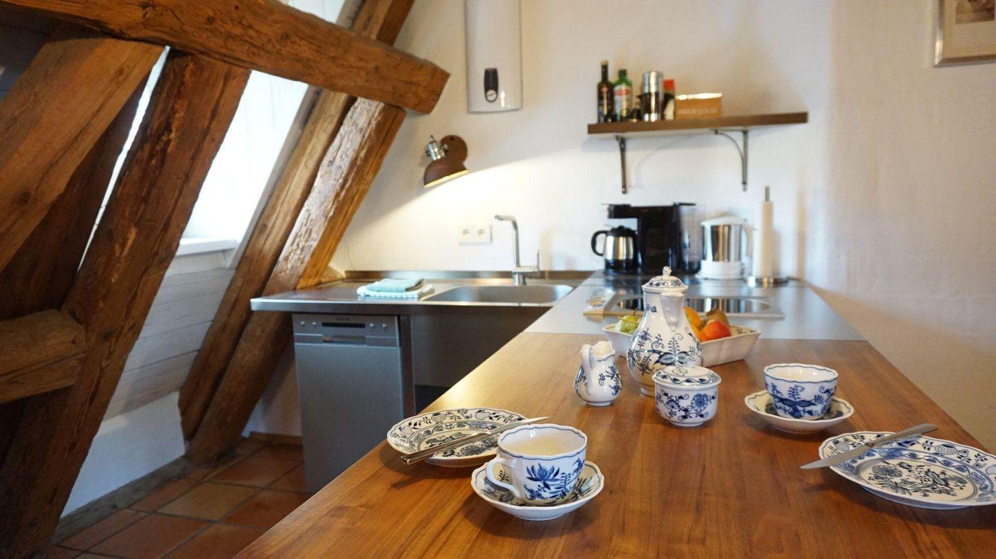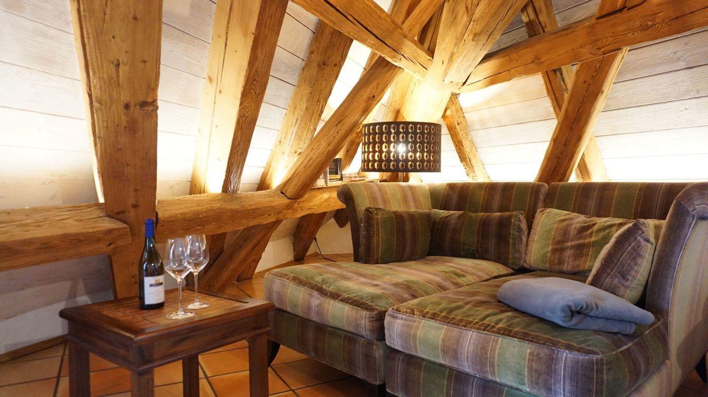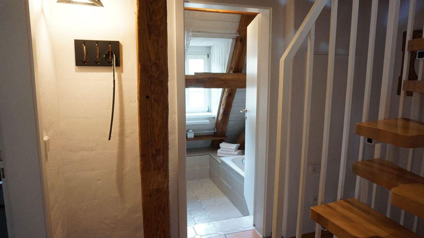 Charmant verbindet sich das rustikale Ambiente des historischen Gebäudes mit zeitgemäßen Komfort und moderner Ausstattung. Über den Dächern von Meersburg, mit Blick in den ehemaligen Klosterhof finden Sie hier einen herrlichen Platz. Vom Frühstück mit frischen Brötchen von nebenan an der modernen Theke bis zum Füße hochlegen nach einem erlebnisreichen Tag auf dem gemütlichen XL- Sofa. Das hochwertige Bett und das moderne Bad sorgen für entspannte und erholsame Urlaubstage. Gleich um die Ecke findet der Wochenmarkt statt- wie wäre es mit Fisch vom Bodensee? In der außergewöhnlichen Bulthaupt-Modulküche steht alles Notwendige bereit. Lift bis zur Etage unterhalb. Zum Ausladen können Sie einige Minuten beim Haus halten. Die Parkkarte für den Sommertalparkplatz (5 min. Gehzeit) ist inklusive.