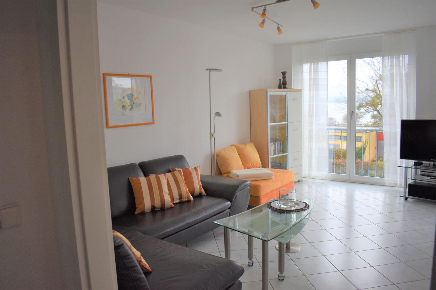 Die Ferienwohnung ist geschmackvoll und komfortabel eingerichtet. Alle Böden sind weiß gefliest, die Küche ist bestens ausgestattet. Die großen, bodentiefen Panoramafenster bieten bei jedem Wetter einen wunderbaren Blick auf den Bodensee. Ein Steinwurf ist es zum See, zum Hafen und bis in die quirlige Unterstadt mit ihren Restaurants, Weinstuben und kleinen Geschäften. Zu einem Frühstück mit Blick auf den Bodensee und die Berge lädt der überdachte Balkon ein. Wellness- und Sportmöglichkeiten liegen direkt vor der Tür. Zur Meersburger Therme sind es keine 2 Minuten, genauso wie zum gegenüberliegenden Frei- und Strandbad mit 50-Meter-Sportbecken. Der Bodensee- Rundwander- und Radweg verlaufen unmittelbar am Haus. Während Sie die vielfältige Bodenseeregion bequem mit Schiff, Bus und Bahn erkunden, parkt Ihr PKW sicher in der Tiefgarage.