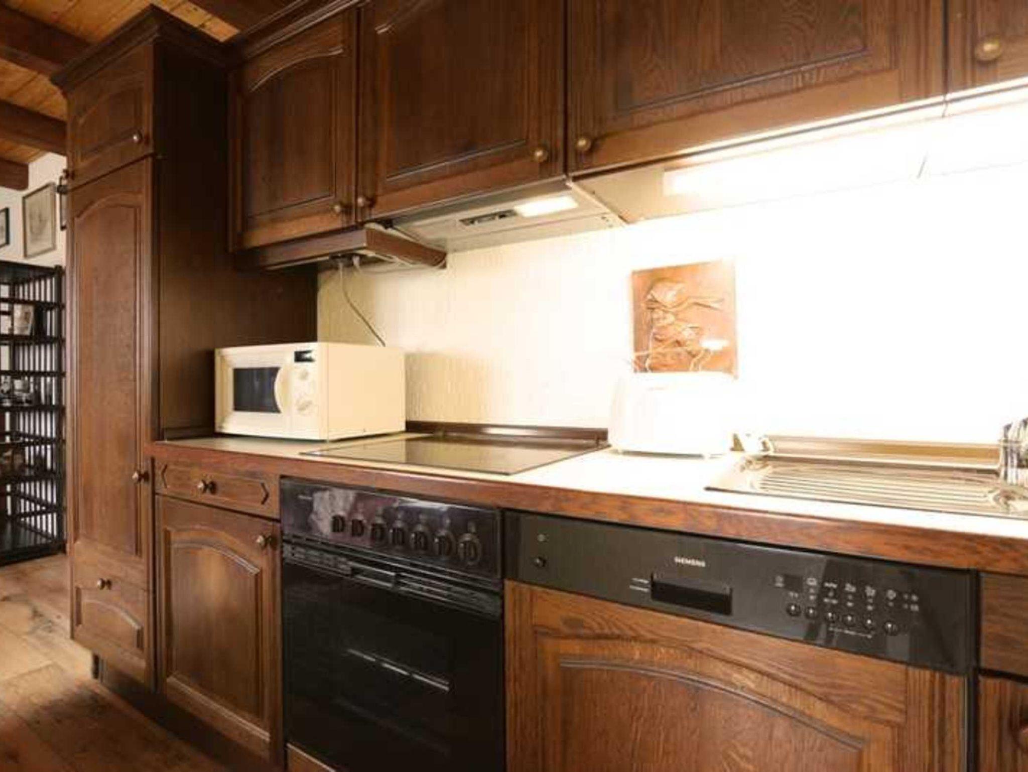 • Offene Küche im Wohnzimmer mit Einbauküche inkl. Herd, Mikrowelle, Kaffeemaschine, Eierkocher, Toaster, Wasserkocher, Kühlschrank mit kleinem Gefrierfach;