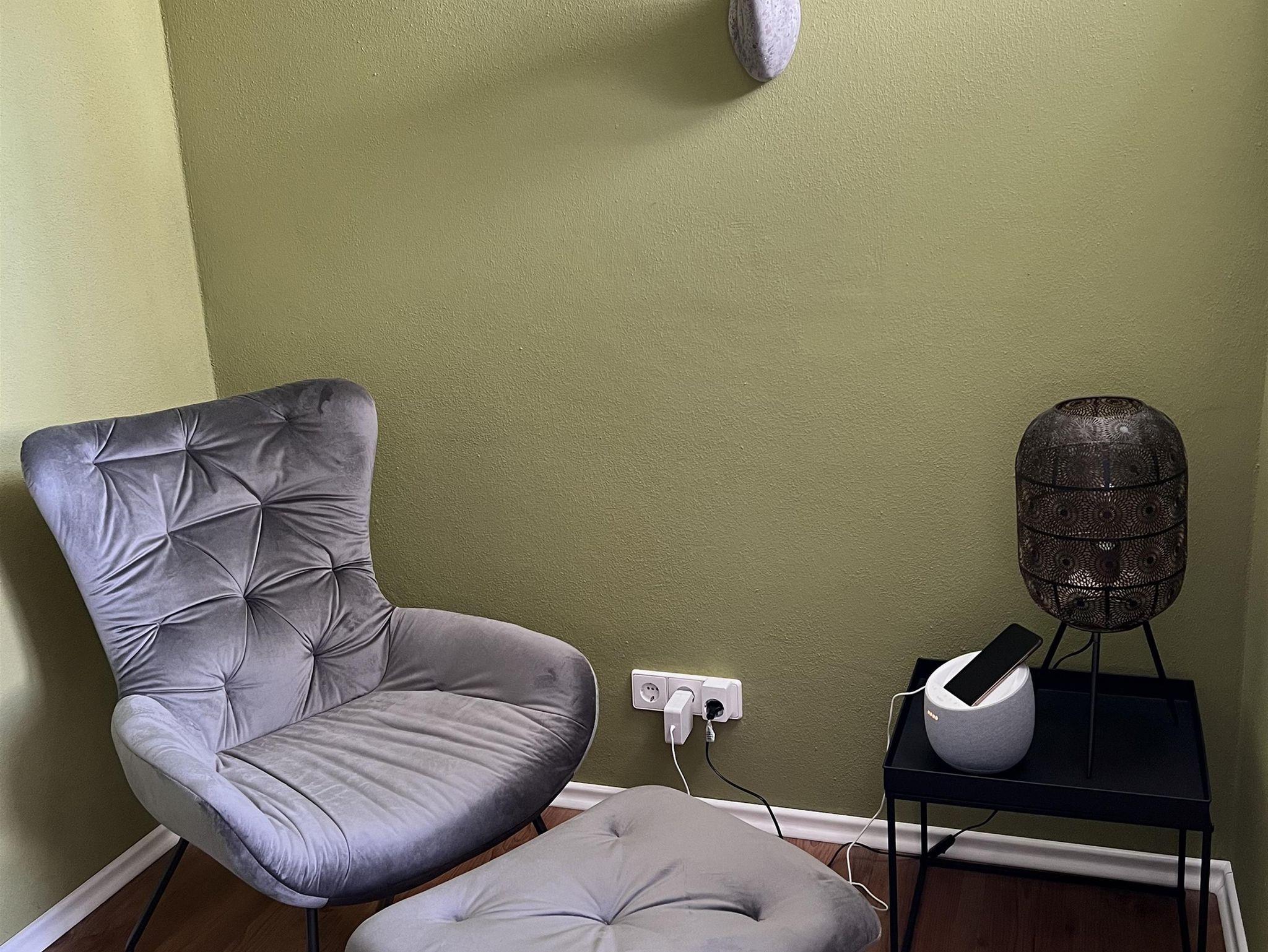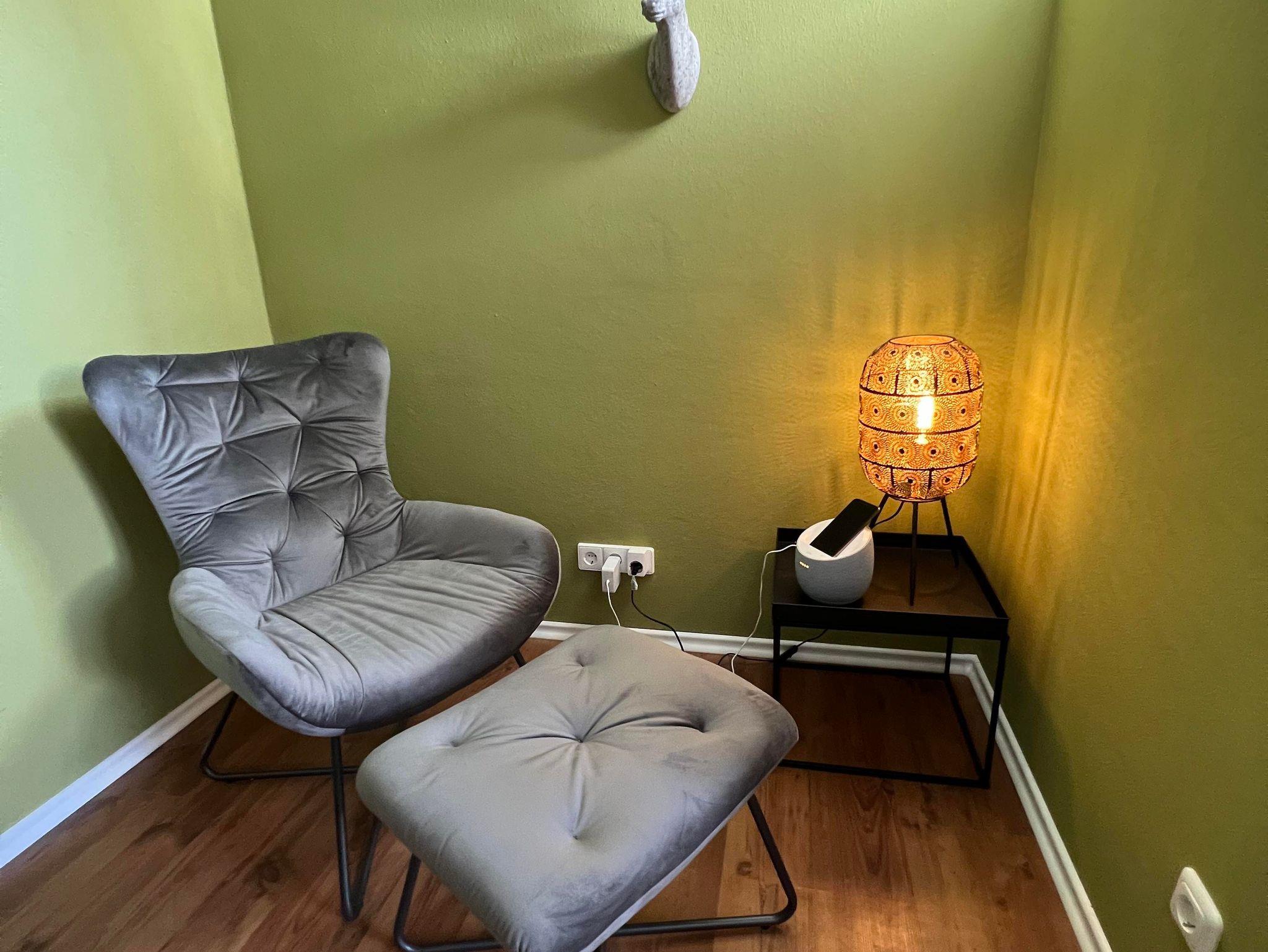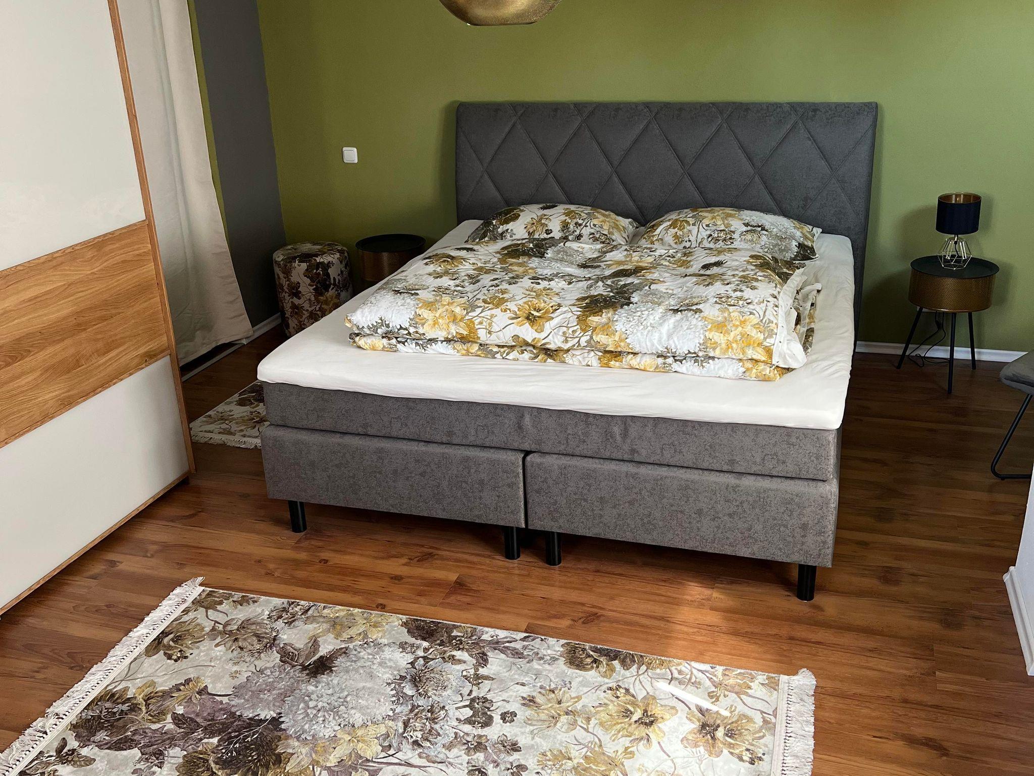 Ausstattung Schlafbereich - Kingsize-Boxspringbett (Breite 180 cm), großer Schwebetürenkleiderschrank, Leseecke mit Sessel und Hocker, Bluetooth-Box