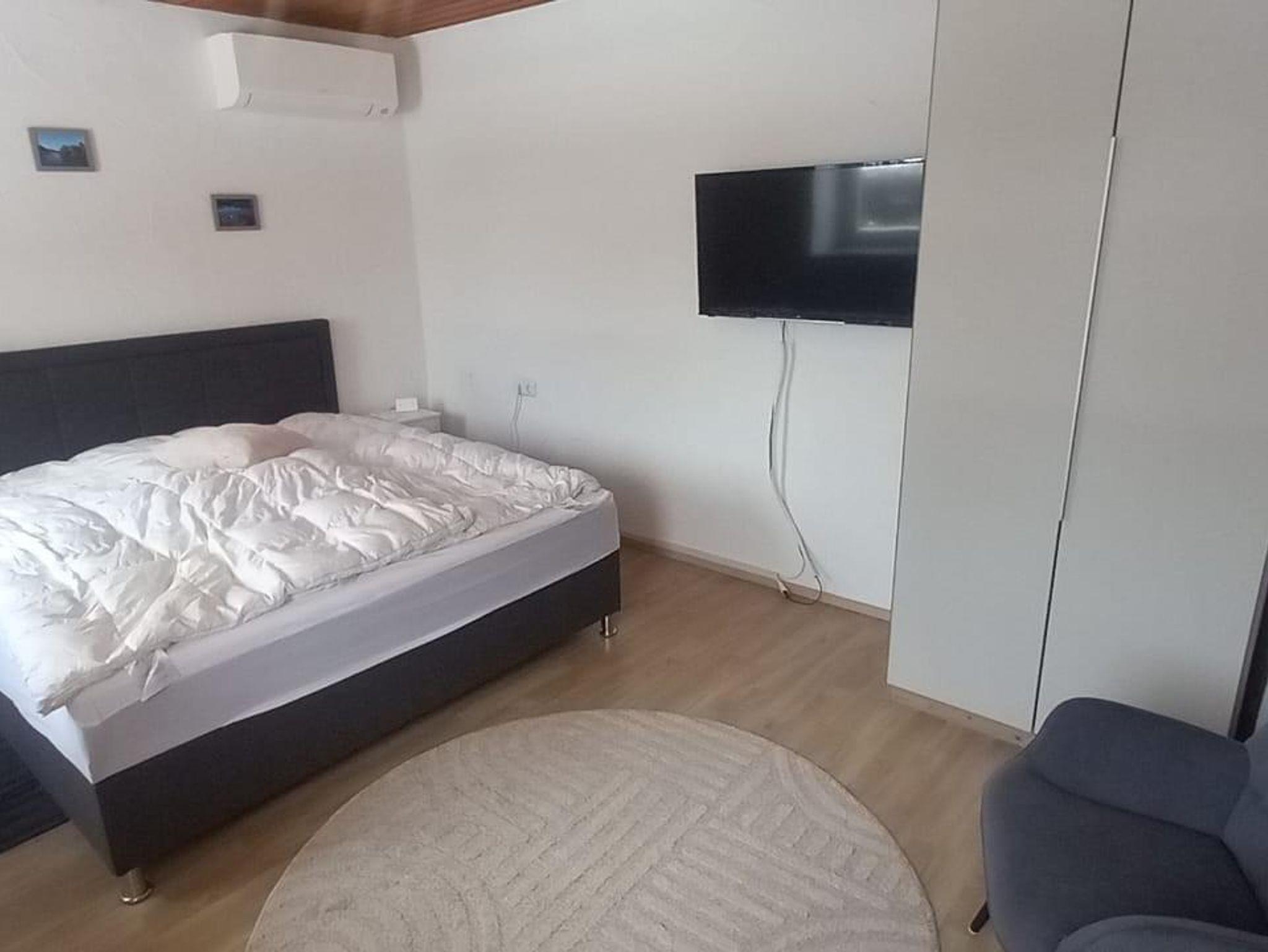 Schlafzimmer 1 im Erdgeschoss mit Boxspringbett 1,80 und ausklappbaren TV, Kleiderschrank und Sessel