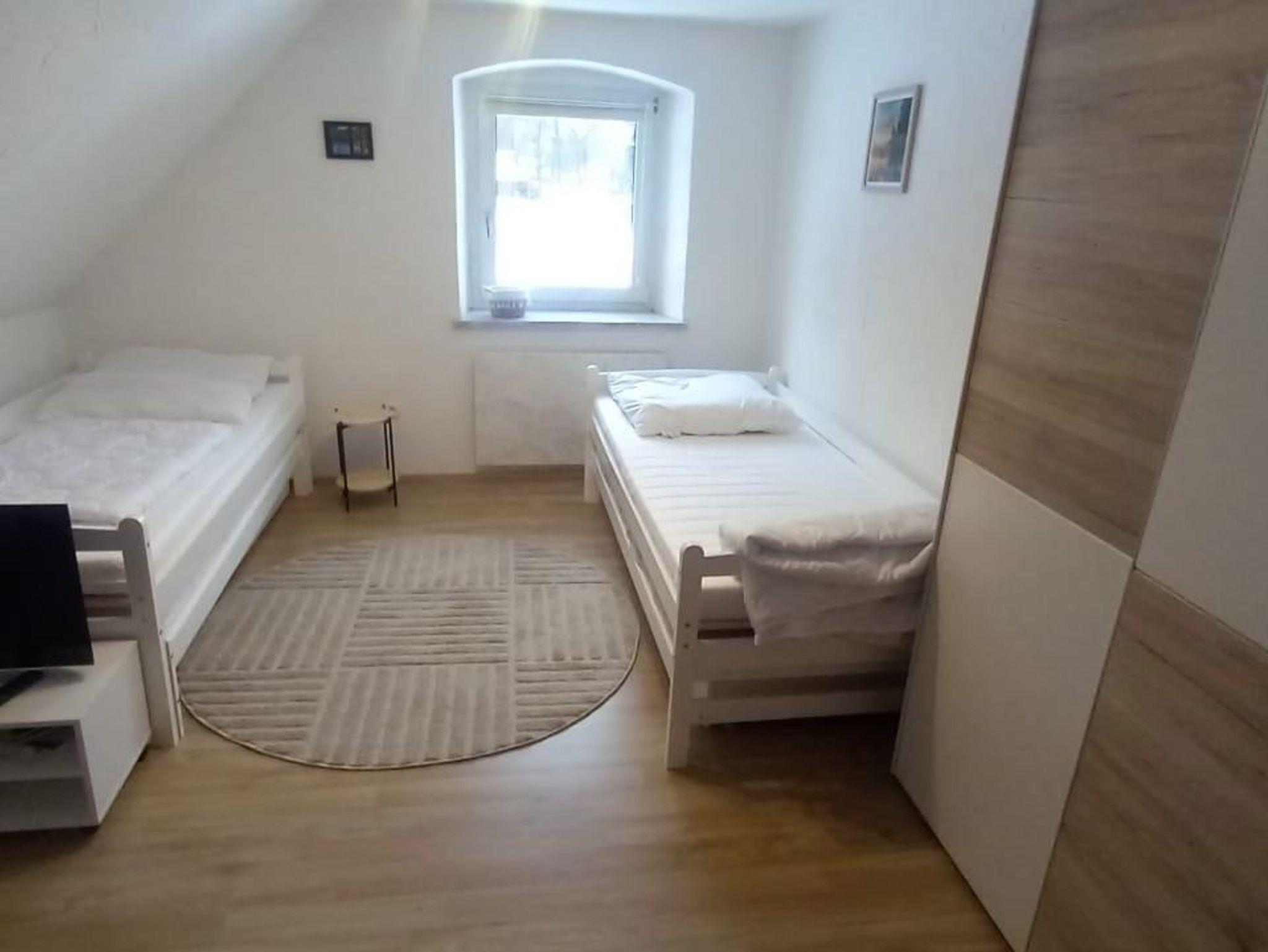 Schlafzimmer 3 im 1. Stock mit 2 Einzelbetten, Sessel und TV, großer Kleiderschrank