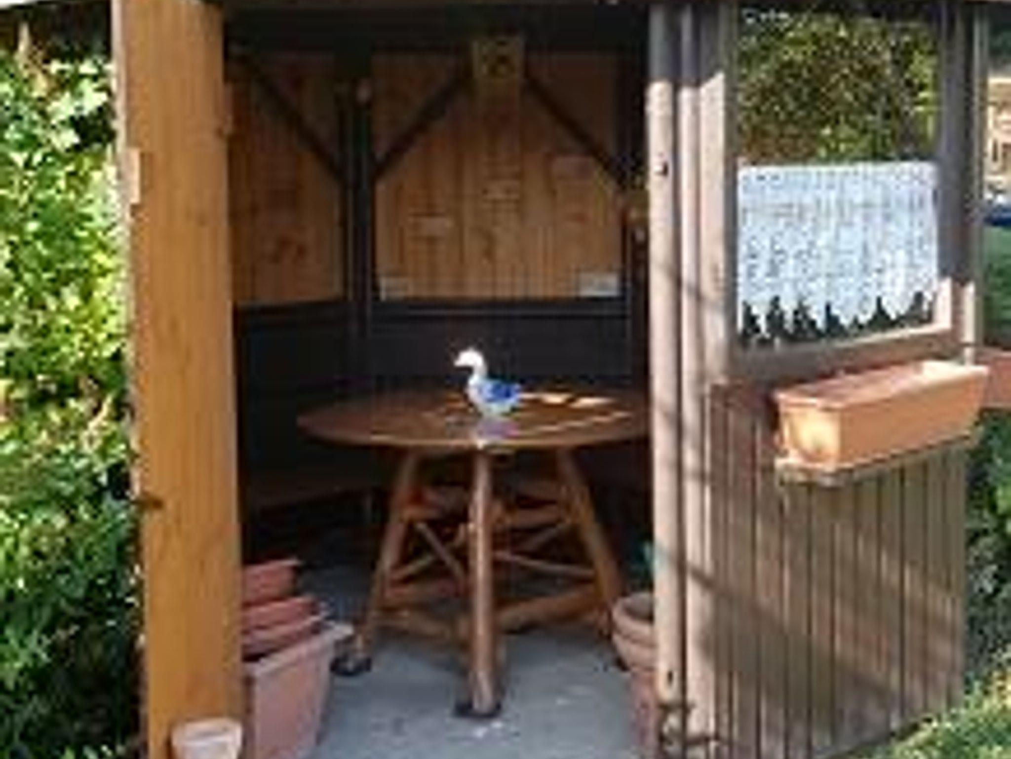 bietet. Der Garten mit der Terrasse ist groß und man hat einen fantastischen Ausblick. In der kleinen Laube im