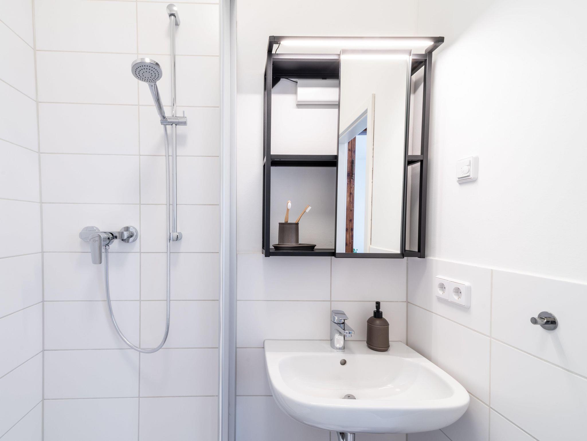 Auch das kleine Badezimmer mit Dusche hält alles Notwendige bereit: Frische Handtücher, Toilettenpapier und Seife, ebenso wie ausreichend Stauraum für Ihre persönlichen Hygieneartikel.