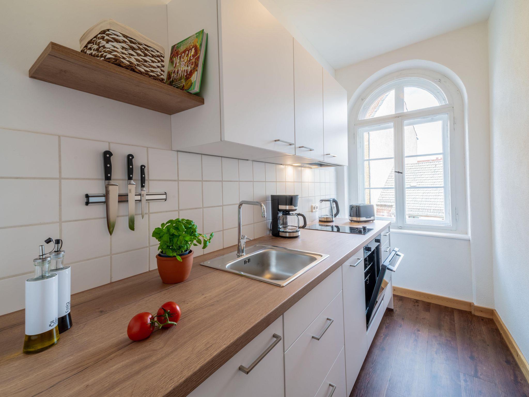 Angrenzend an den Wohnbereich befindet sich die vollausgestattete Küche mit Kochfeldern, Ofen, Geschirrspülmaschine, Kühl- und Gefrierschrank, Kaffeemaschine, Wasserkocher und Toaster.