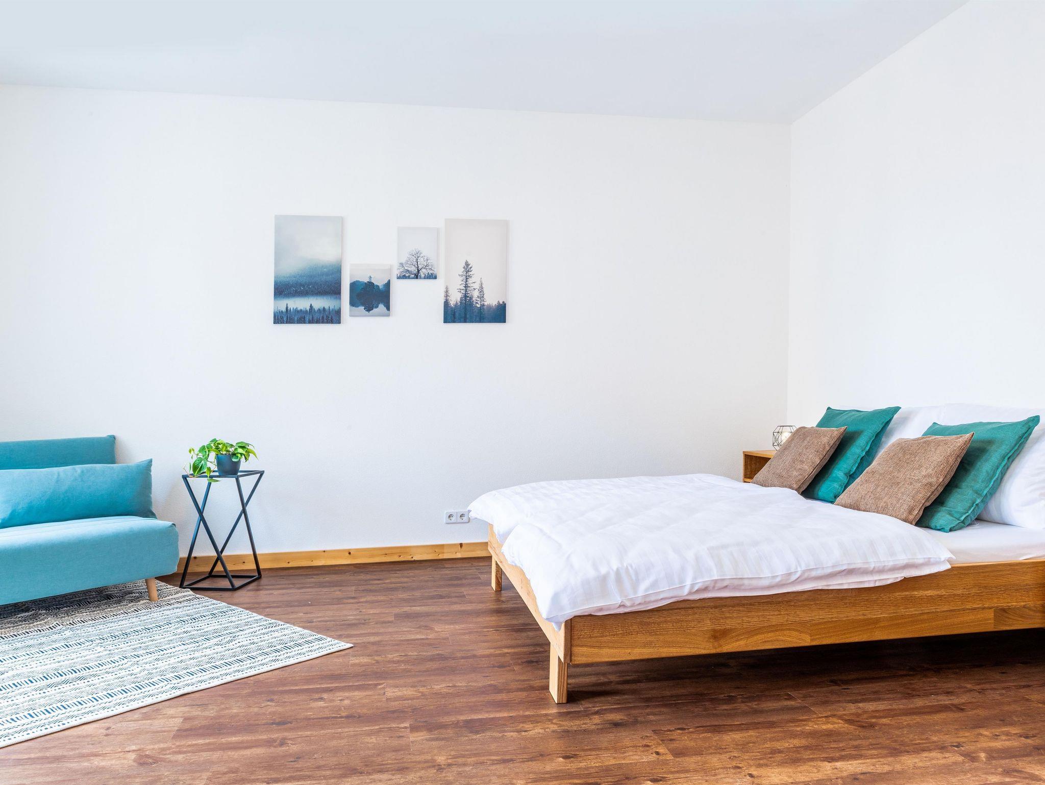Dieses Apartment für bis zu drei Personen ist mit einem großzügigen Bett, einer gemütlichen Couch, welche optional als zusätzliche Schlafoption genutzt werden kann, sowie einer Kommode und einer Garderobe ausgestattet.
