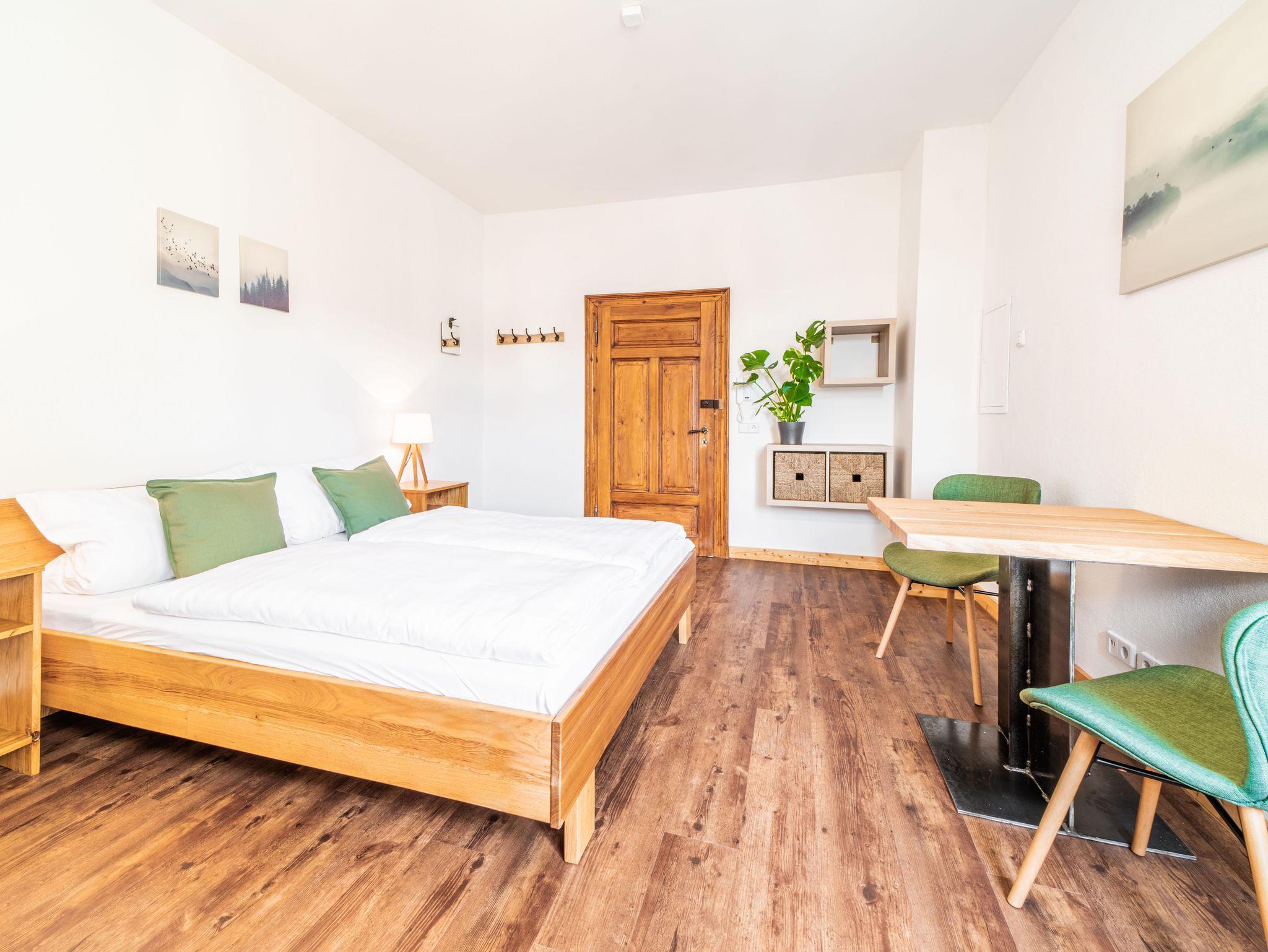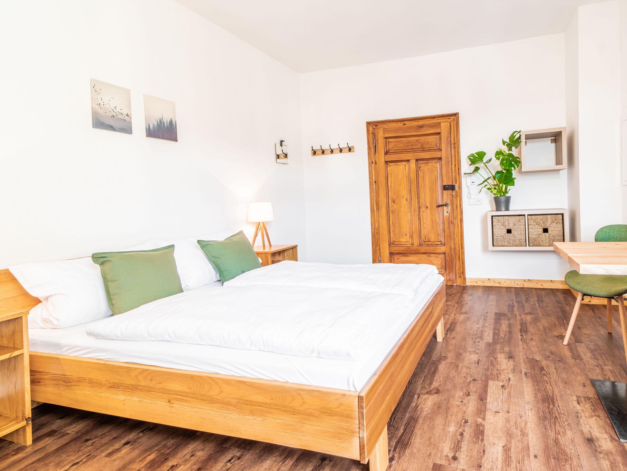 Dieses Apartment ist mit einem großzügigen Bett, Regalen sowie einer Garderobe ausgestattet. Am gemütlichen Holztisch lassen Sie sich Ihre Mahlzeiten schmecken oder nutzen ihn als Schreibtisch für kreative Ideen. Für die Zubereitung von Snacks befindet sich hier auch ein kleiner Küchenbereich mit Geschirr, Kühl- und Gefrierschrank, Kaffeemaschine und Wasserkocher.