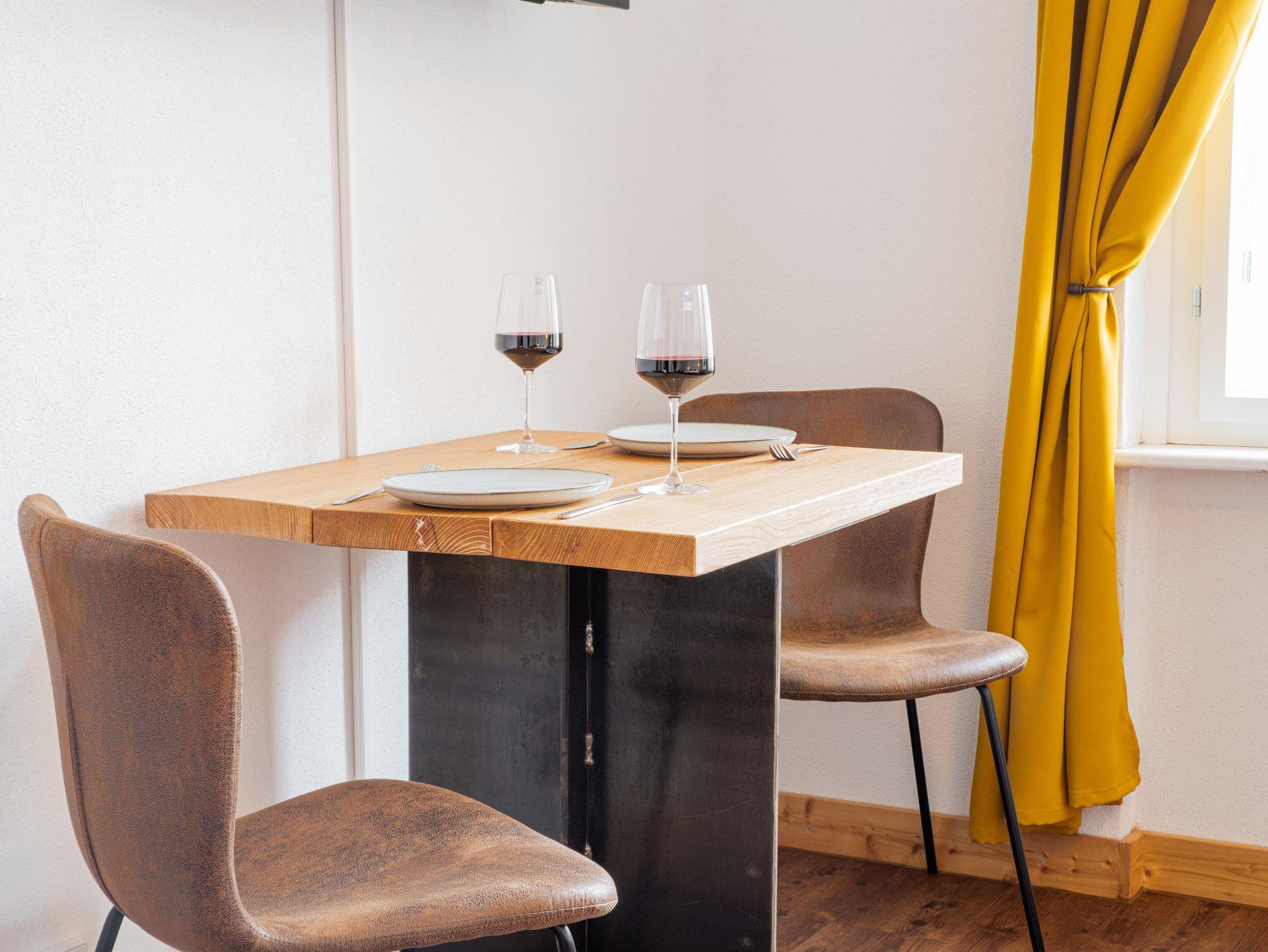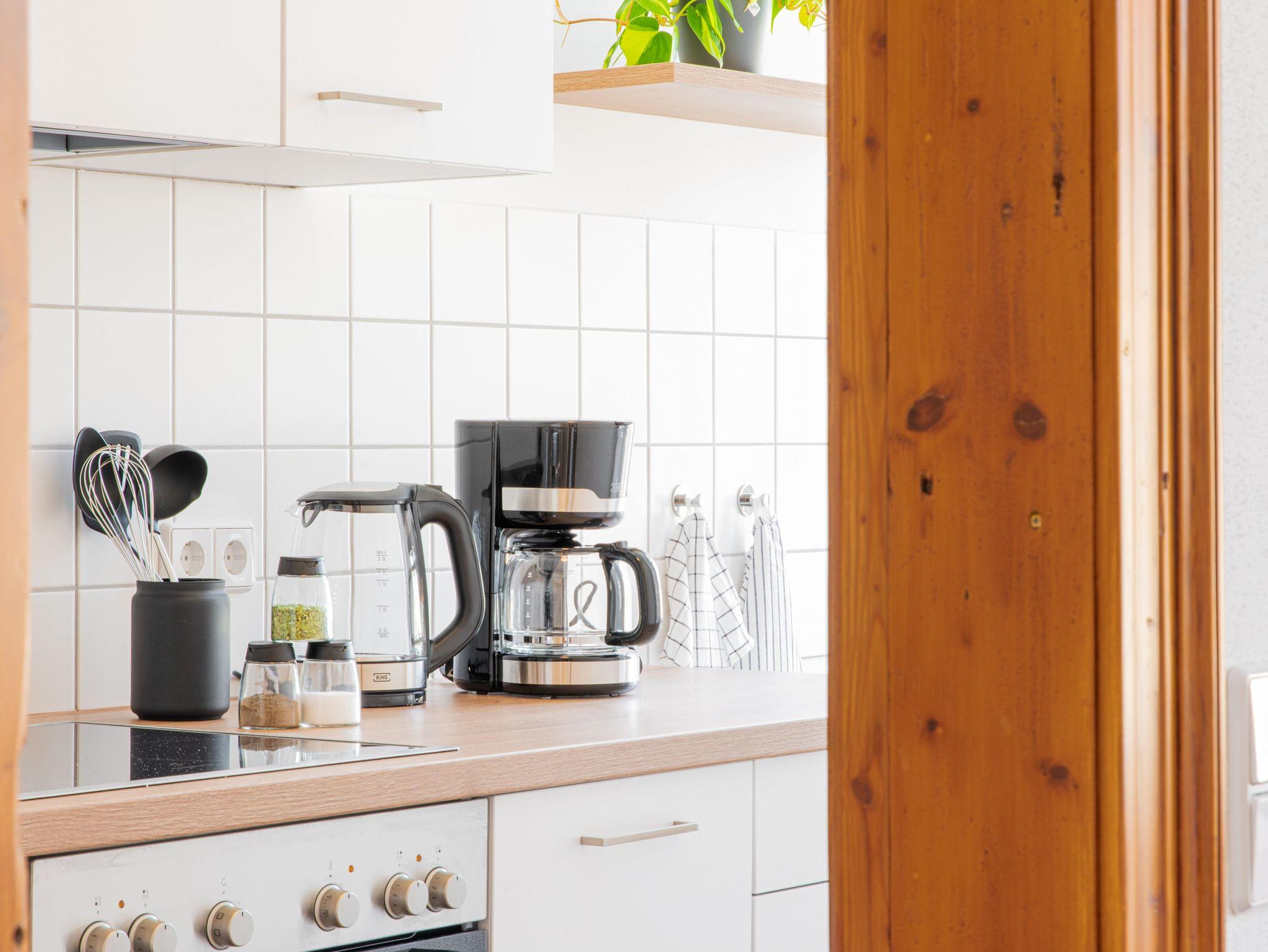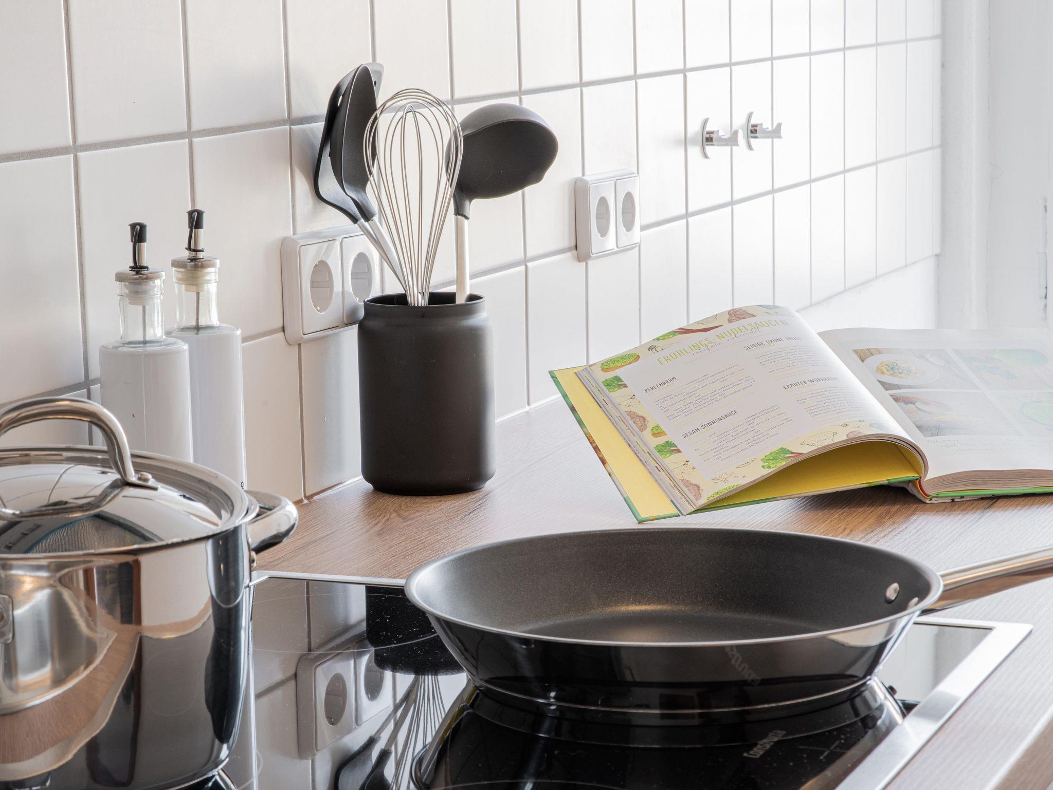 Angrenzend an den Wohnbereich befindet sich die vollausgestattete Küche mit Kochfeldern, Ofen, Geschirrspülmaschine, Kühl- und Gefrierschrank, Kaffeemaschine und Wasserkocher. Mit der vollumfänglichen Ausstattung an Kochutensilien können Sie sich jederzeit selbst versorgen.
