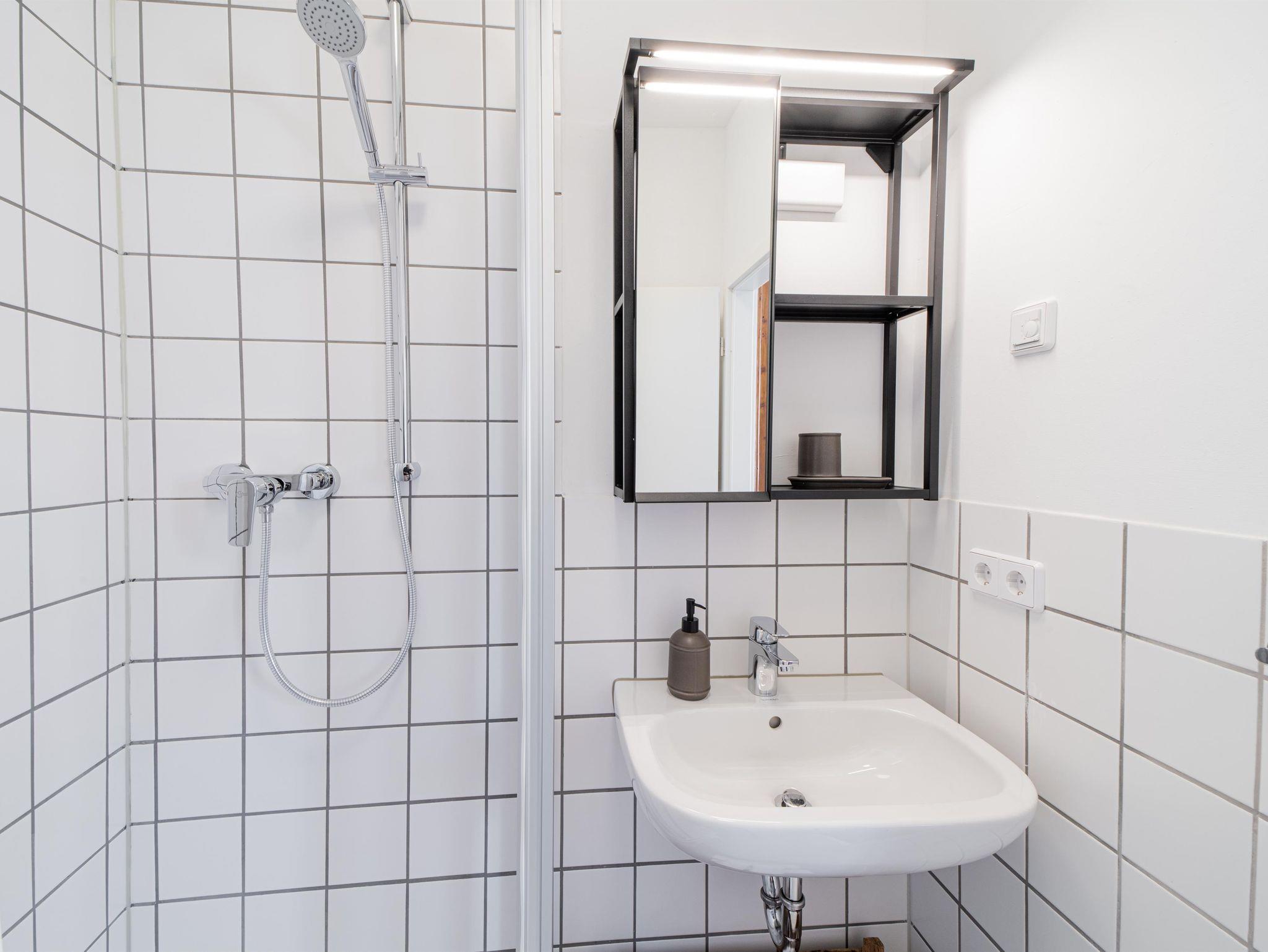 Auch das kleine Badezimmer mit Dusche hält alles Notwendige bereit: Frische Handtücher in zwei Größen, Toilettenpapier und Seife, ebenso wie ausreichend Stauraum für Ihre persönlichen Hygieneartikel.