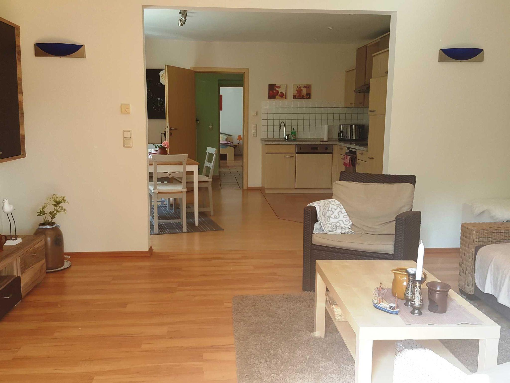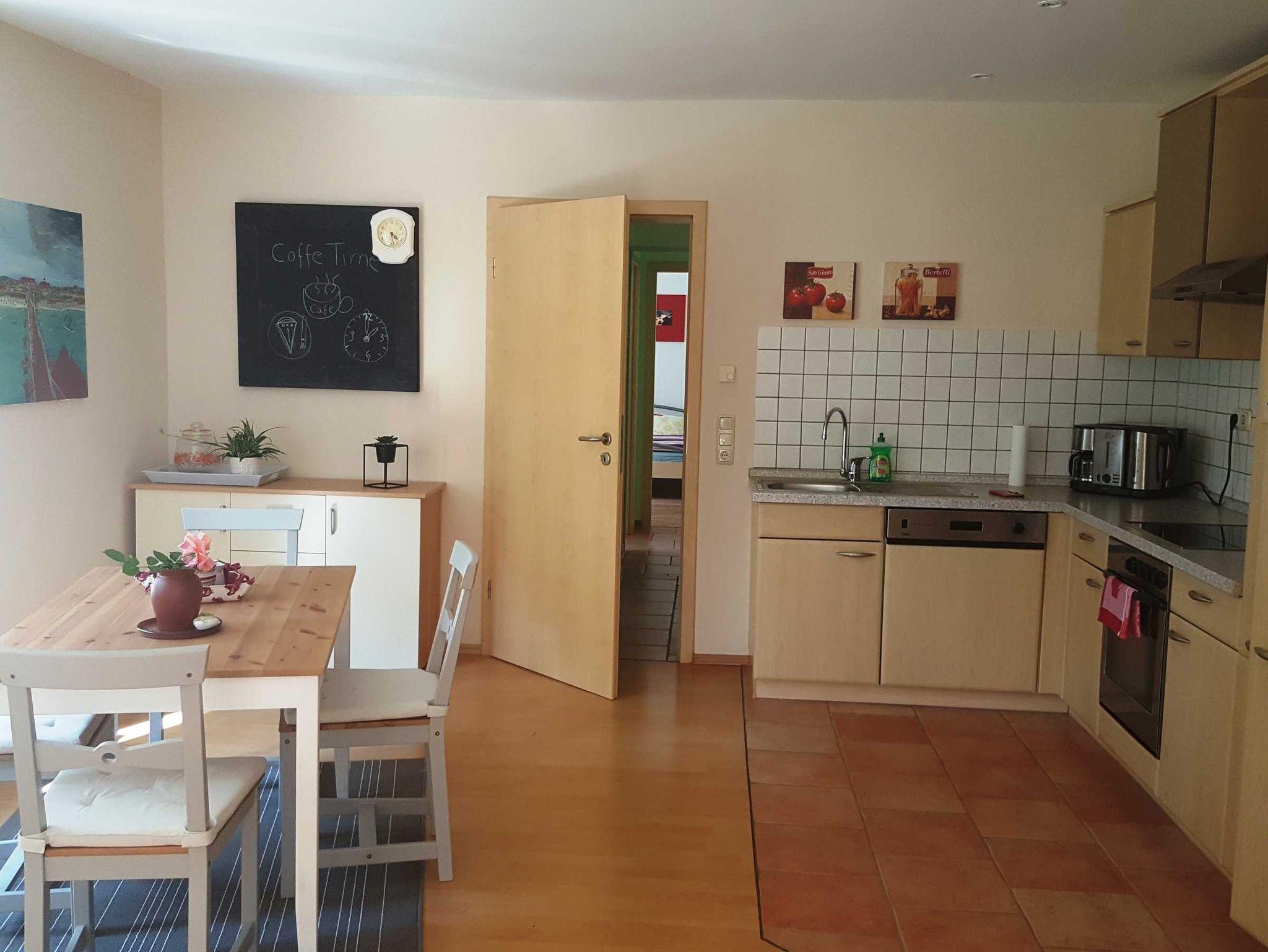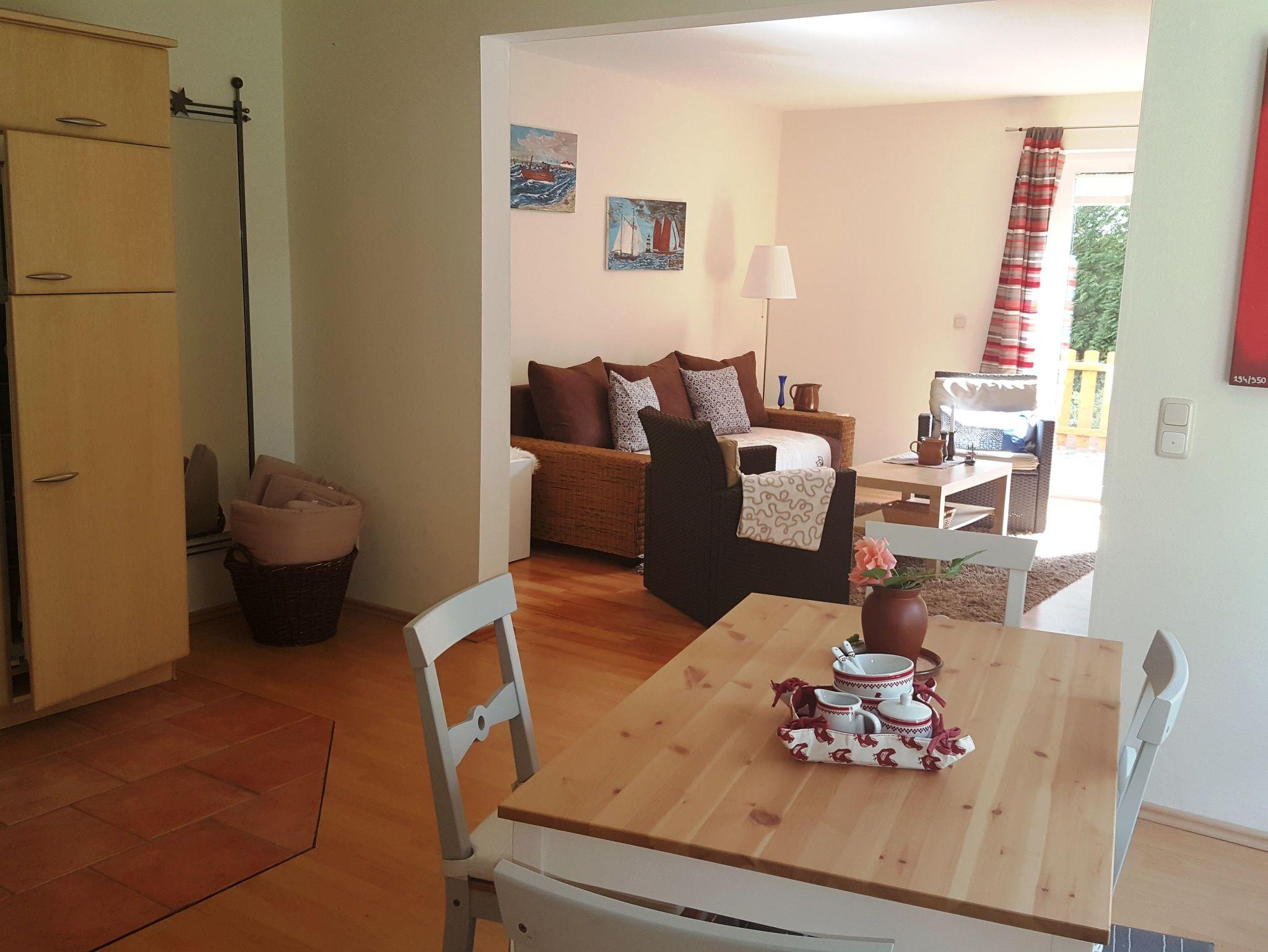 Die 2-Raum-Ferienwohnung ist ca. 60 qm groß und befindet sich im Erdgeschoss des Hauses. Die möblierte Terrasse ist vom Wohnzimmer aus begehbar, davor befindet sich eine zusätzliche Sitzecke im Garten mit einer Grillmöglichkeit. Das Wohnzimmer ist ausgestattet mit TV, Radio mit CD-Player, Sideboard, einer ausklappbaren Rattan-Couch (Liegefläche 1,80 x 2,00m), sowie Esstisch mit Stühlen. Die offene Küchenzeile ist ebenfalls im Wohnzimmer integriert. Sie verfügt über eine Kühl- und Gefrierkombination, 4-Platten-Ceranherd, Backofen, Mikrowelle, Wasserkocher und Kaffeemaschine. Vom Wohnzimmer hat man einen Blick ins Grüne. Im separaten Schlafzimmer steht Ihnen ein Doppelbett zur Verfügung. Bad mit DU/WC. Ein Kinderreisebett (Baby) und Hochstuhl ist auf Anfrage kostenfrei erhältlich, bitte vorbestellen. Die Erstausstattung Bettwäsche ist inklusive. Handtücher sind mitzubringen.
