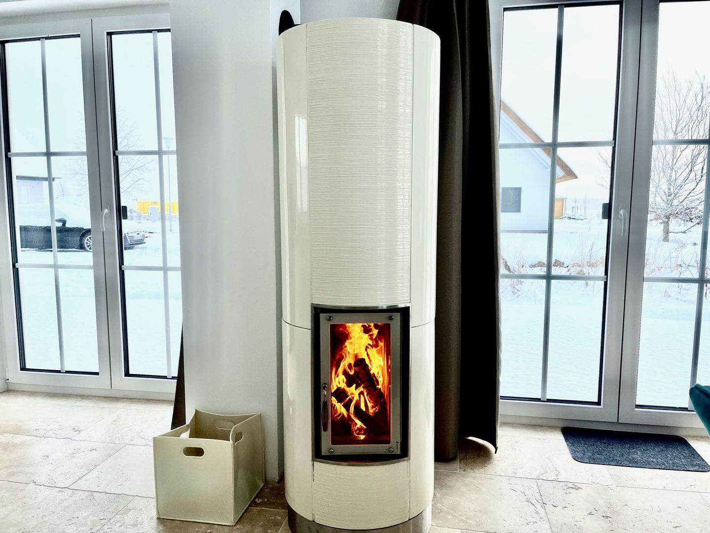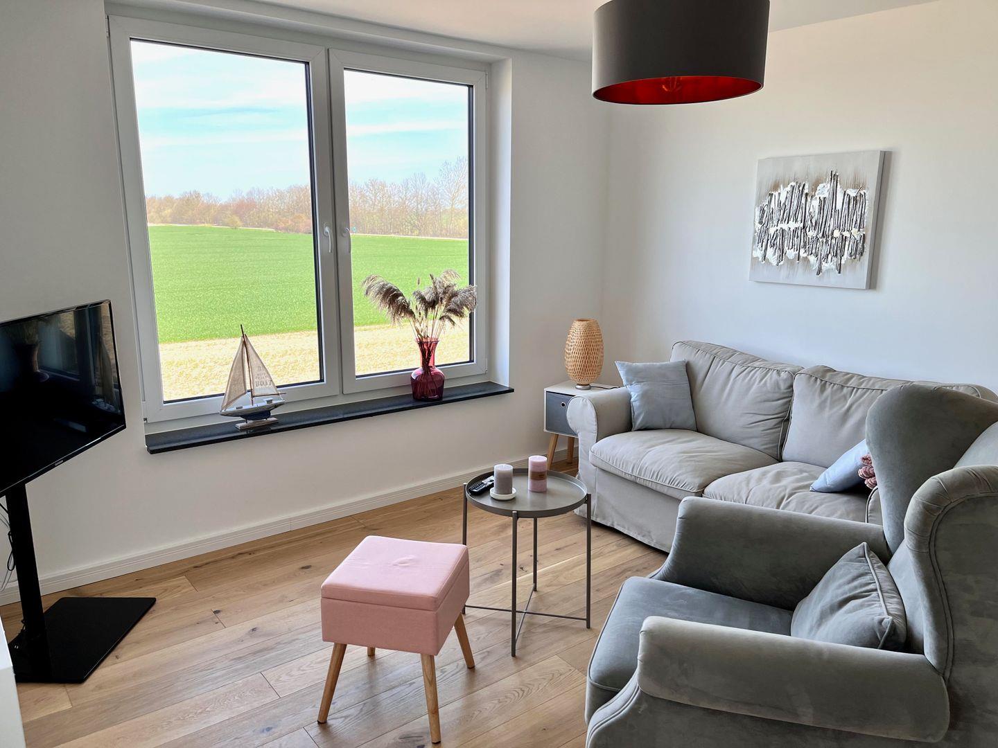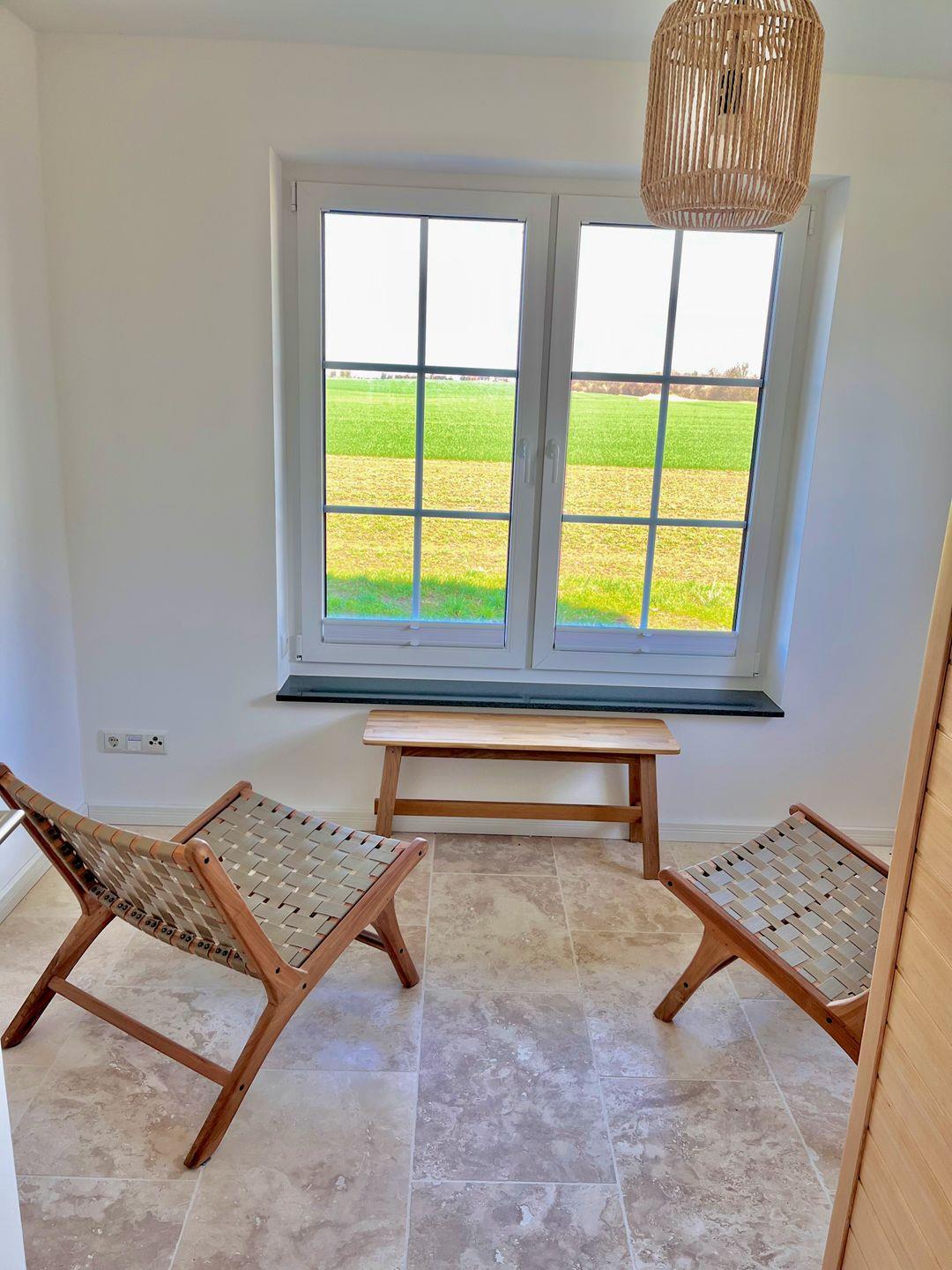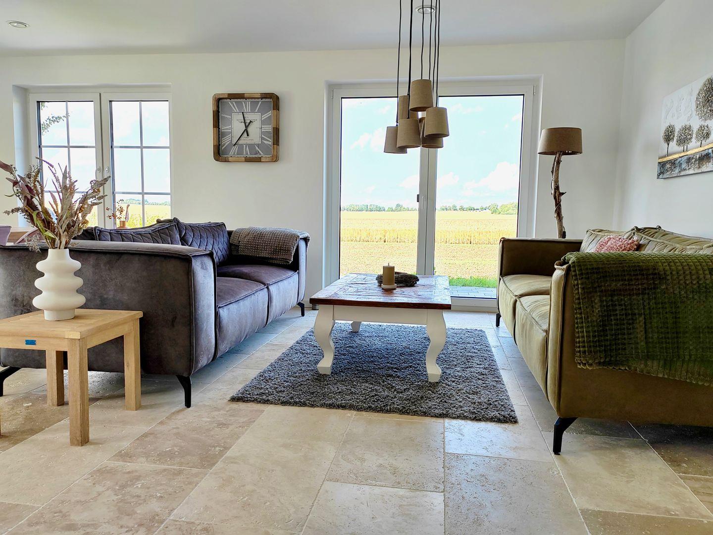 Im Erdgeschoss öffnet sich der großzügige, lichtdurchflutete Wohnbereich mit offener Küche – der lebendige Mittelpunkt des Hauses. Machen Sie es sich auf den bequemen Sofas gemütlich, genießen Sie den weiten Blick über die Felder und lassen Sie sich vom Kaminofen wohlig wärmen.