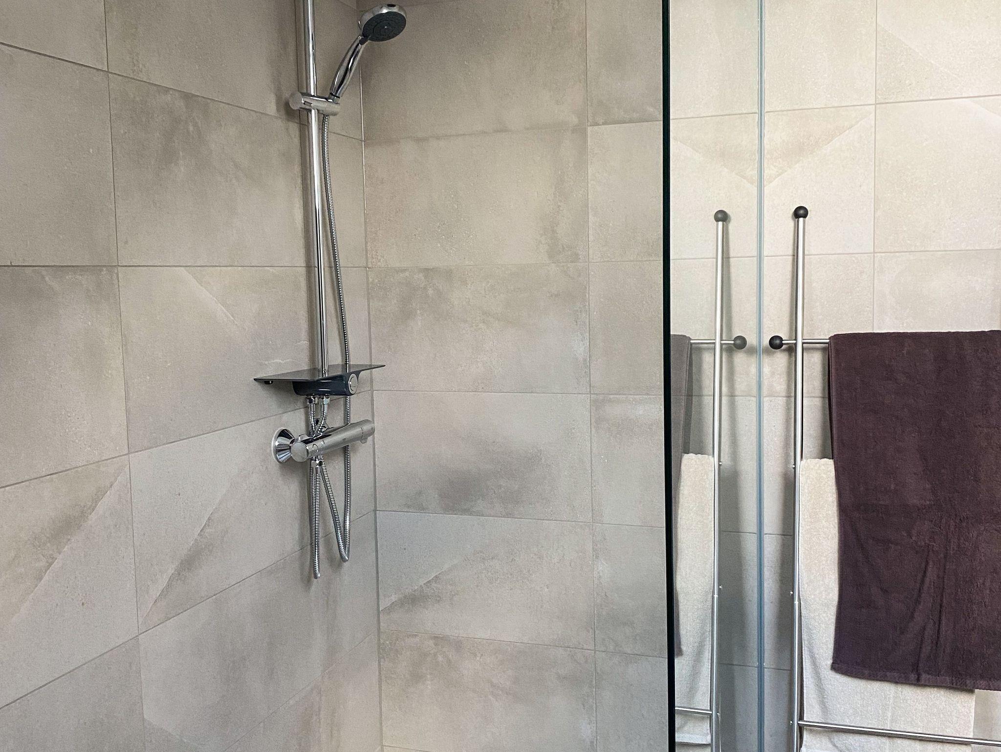 Badezimmer mit Dusche, Föhn und Waschmaschine. Seperates WC.