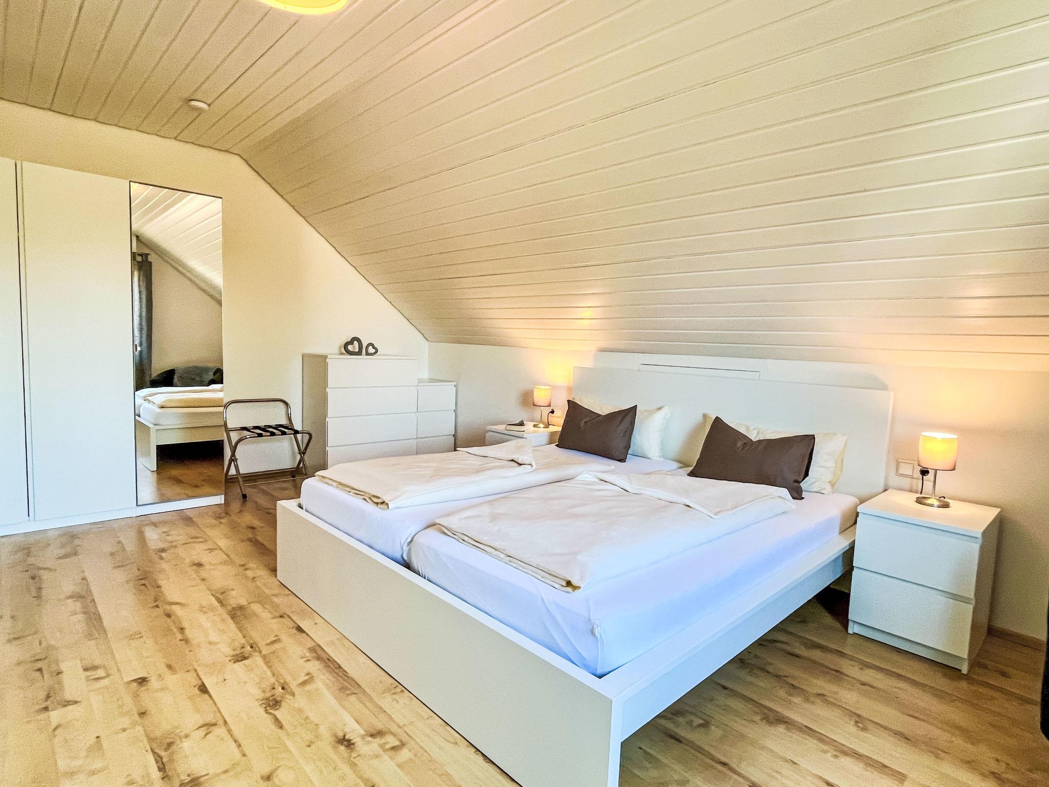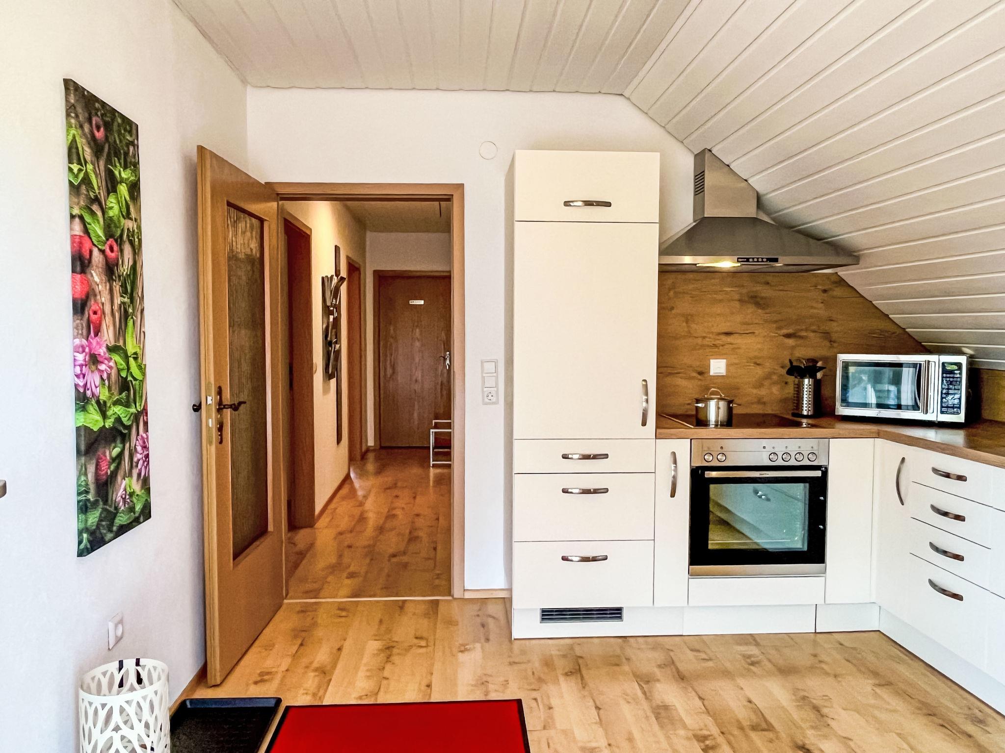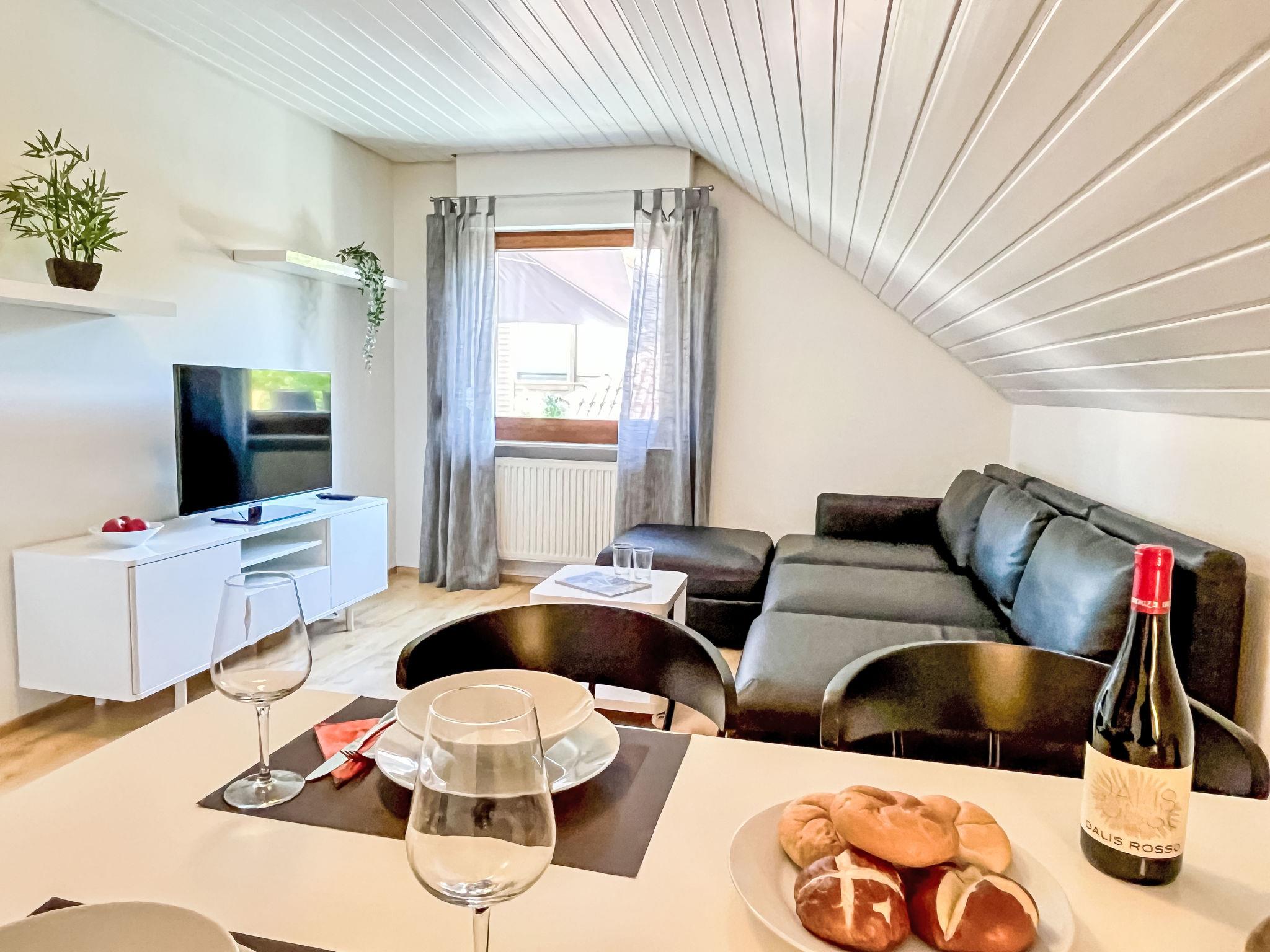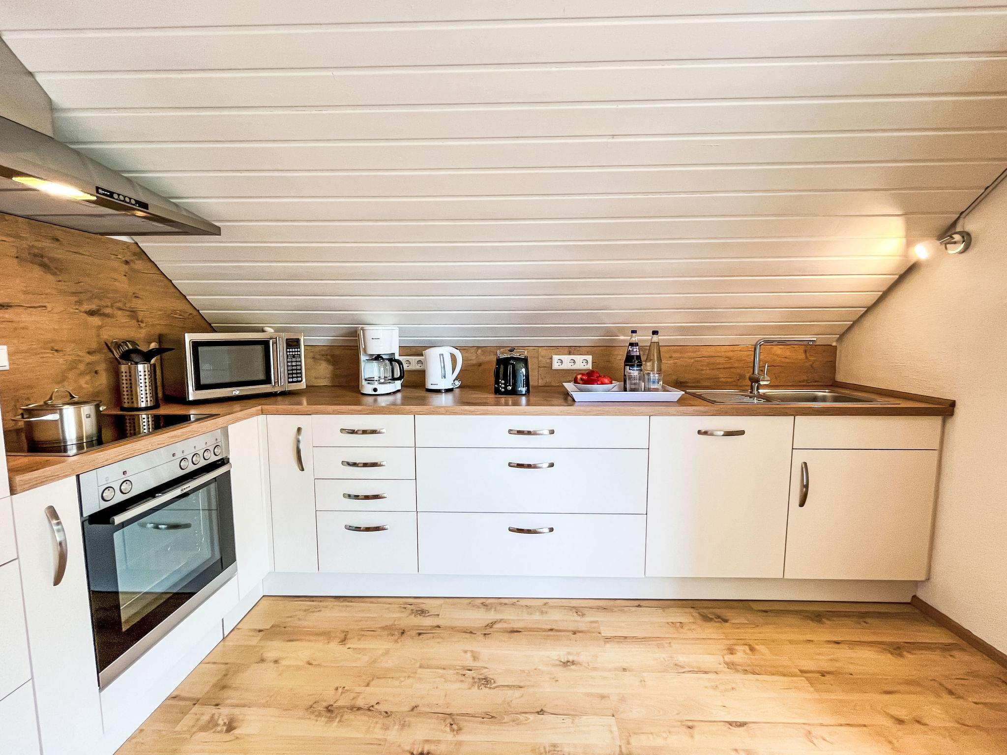 "Land in Sicht", 2-room apartment 60 m2, on the top floor. Bright, partly with sloping ceilings, beautiful and tasteful furnishings: living/sleeping room with 1 double sofabed (160 cm), dining table and satellite TV (flat screen). 1 room with 1 double bed and satellite TV (flat screen). Kitchen (oven, dishwasher, 4 ceramic glass hob hotplates, toaster, kettle, microwave, electric coffee machine). Exit to the balcony. Shower/WC. Heating. Balcony. Balcony furniture. Beautiful view of the garden. Facilities: children's high chair, baby cot. Internet (WiFi, free). Parking at the house. Please note: non-smokers only. Maximum 1 small pet/ dog allowed. Smoke alarm. Separate access to the apartment via external staircase (honeycomb steps).