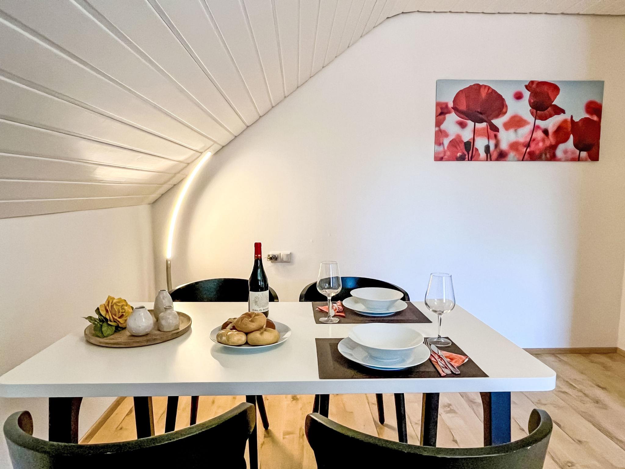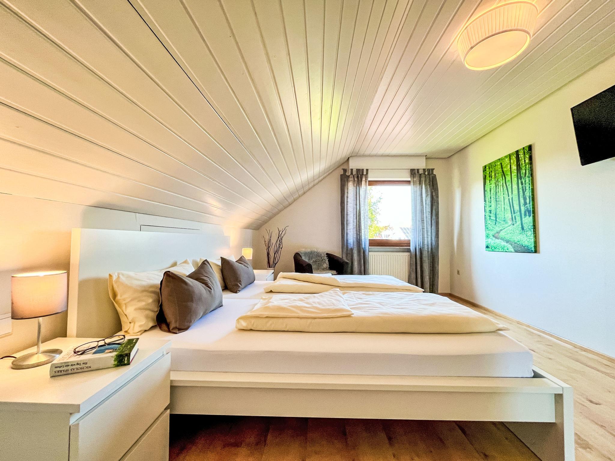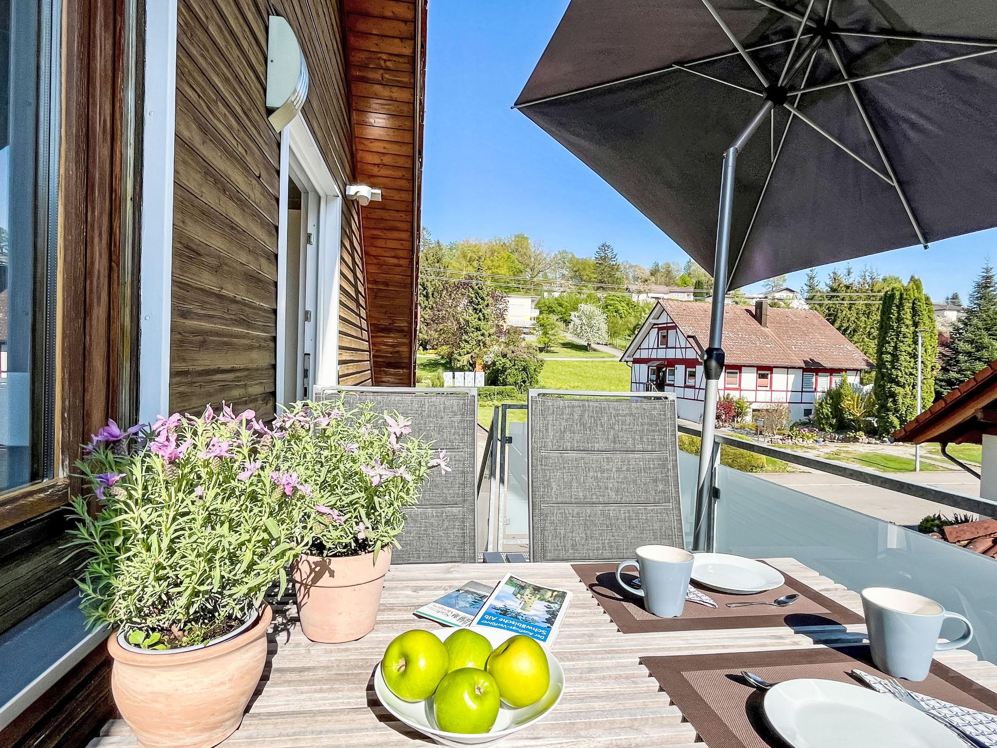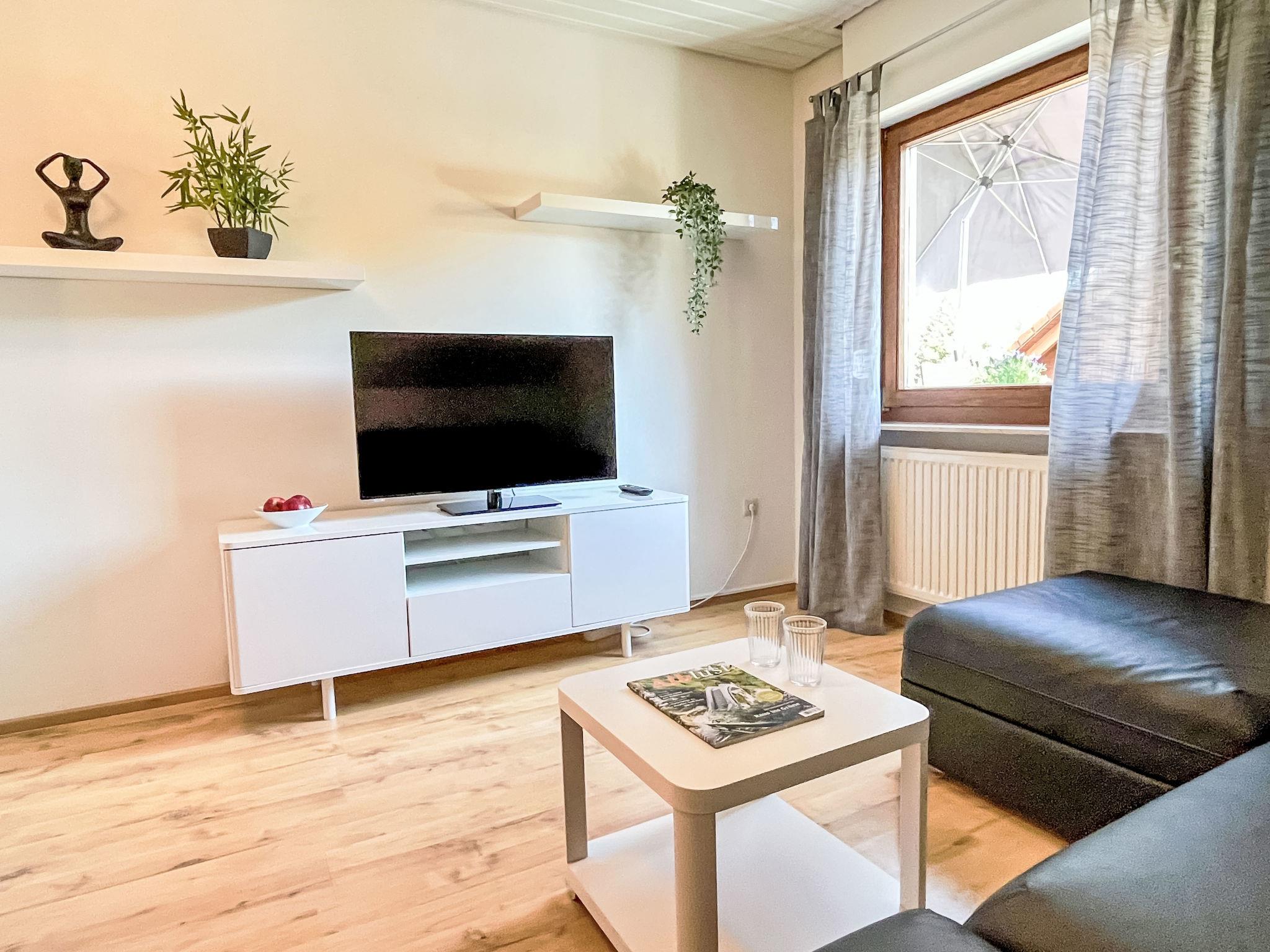 "Land in Sicht", 2-room apartment 60 m2, on the top floor. Bright, partly with sloping ceilings, beautiful and tasteful furnishings: living/sleeping room with 1 double sofabed (160 cm), dining table and satellite TV (flat screen). 1 room with 1 double bed and satellite TV (flat screen). Kitchen (oven, dishwasher, 4 ceramic glass hob hotplates, toaster, kettle, microwave, electric coffee machine). Exit to the balcony. Shower/WC. Heating. Balcony. Balcony furniture. Beautiful view of the garden. Facilities: children's high chair, baby cot. Internet (WiFi, free). Parking at the house. Please note: non-smokers only. Maximum 1 small pet/ dog allowed. Smoke alarm. Separate access to the apartment via external staircase (honeycomb steps).