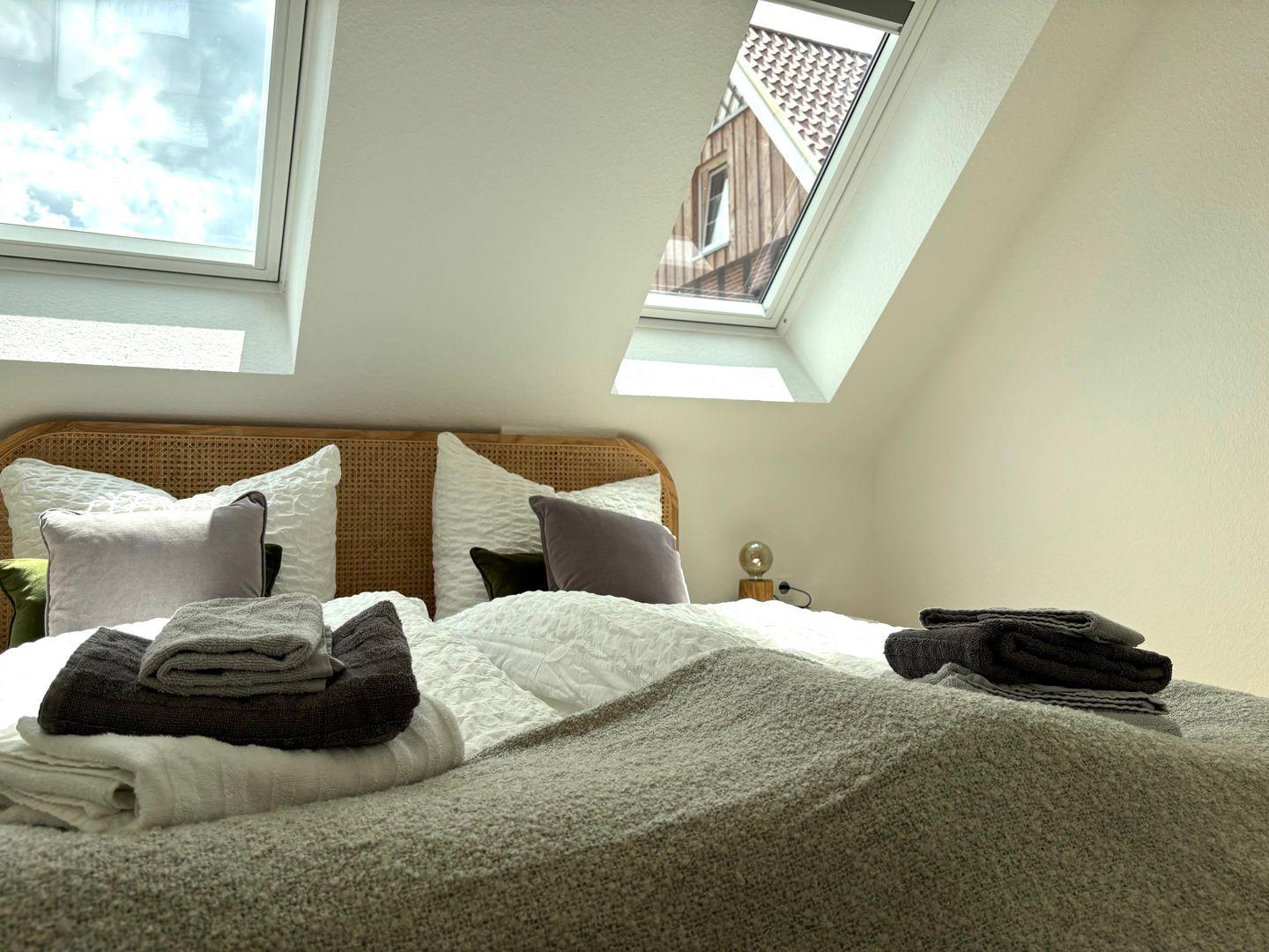 Die Ferienwohnung bietet Platz für bis zu 4 Personen. Am besten eignet sich die Wohnung für 3 Erwachsene, oder 2 Erwachsene und 2 Kinder. Das große Schlafzimmer hat ein Doppelbett (1,60m). Im kleinen Schlafzimmer/Arbeitszimmer steht ein Sofa, welches ausziehbar ist und als Schlafsofa genutzt werden könnte (1,40m). Das Zimmer kann flexibel als 2. Schlafzimmer, oder als Arbeitszimmer mit Schreibtisch genutzt werden.