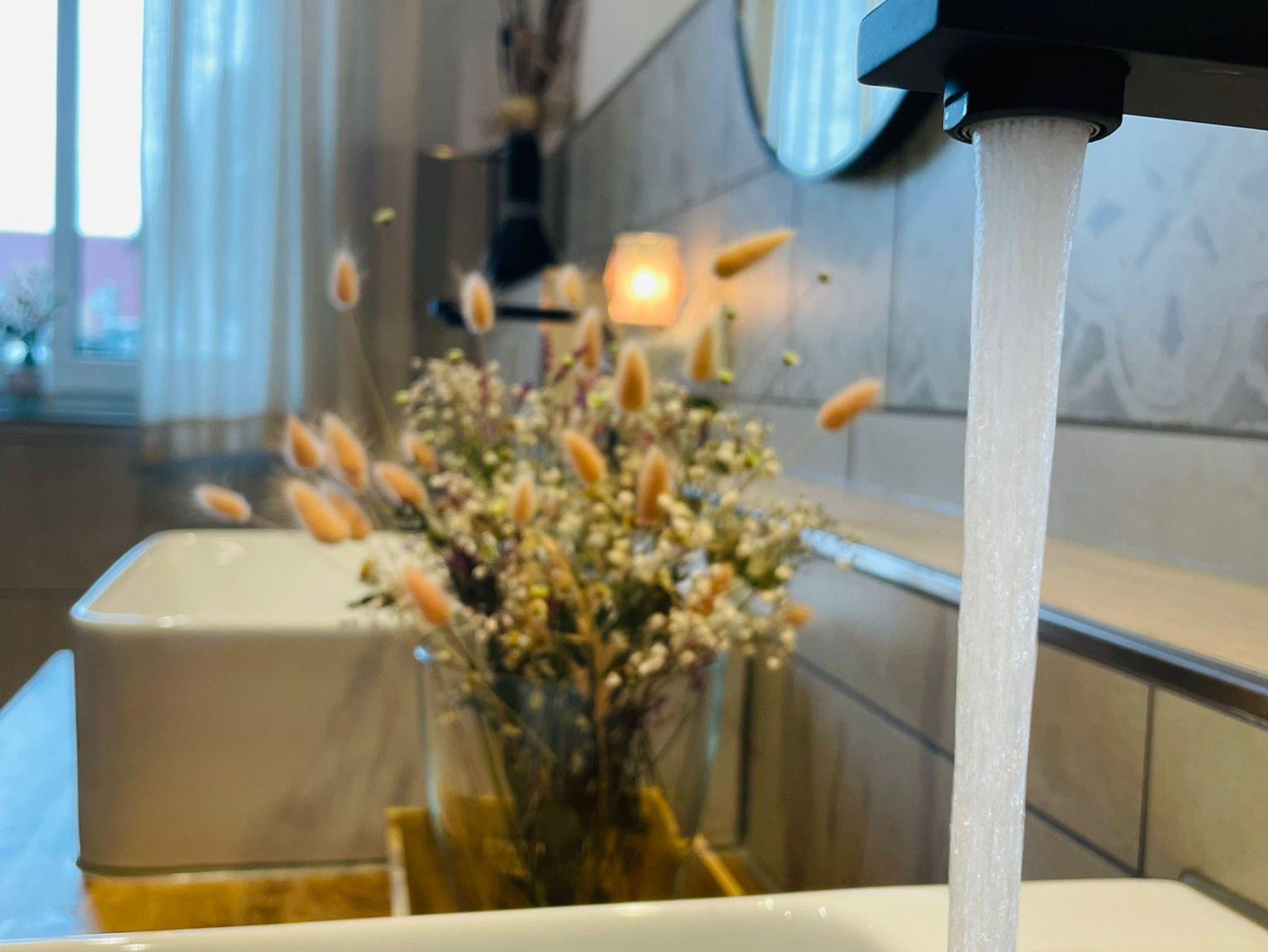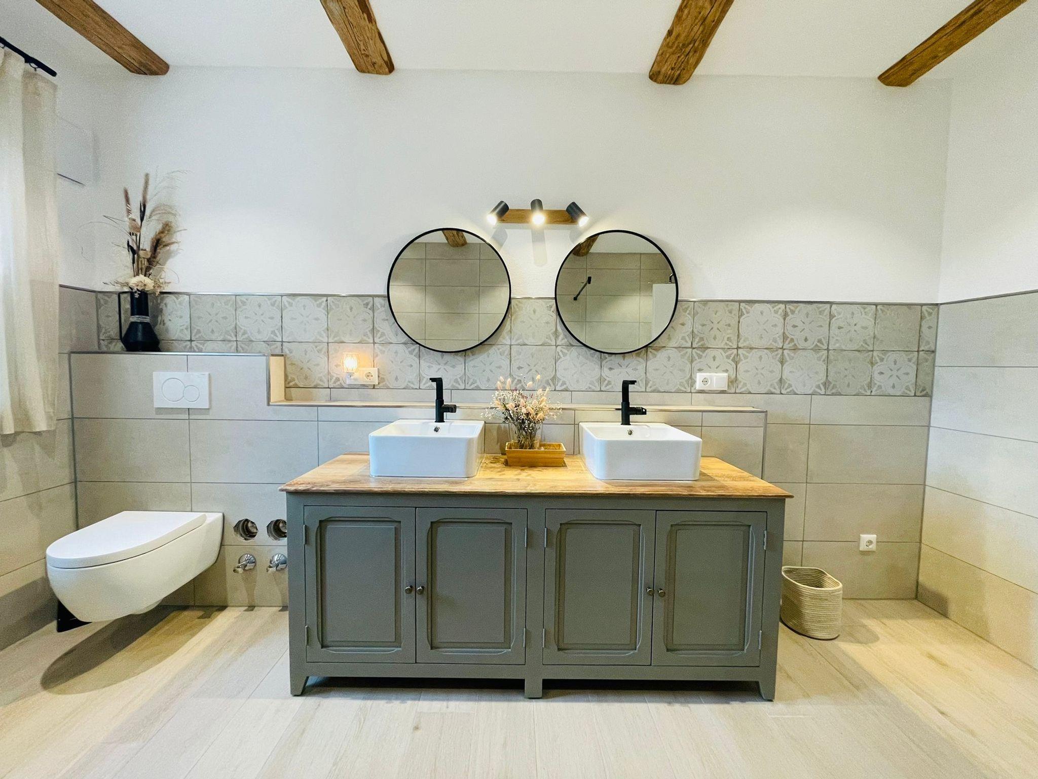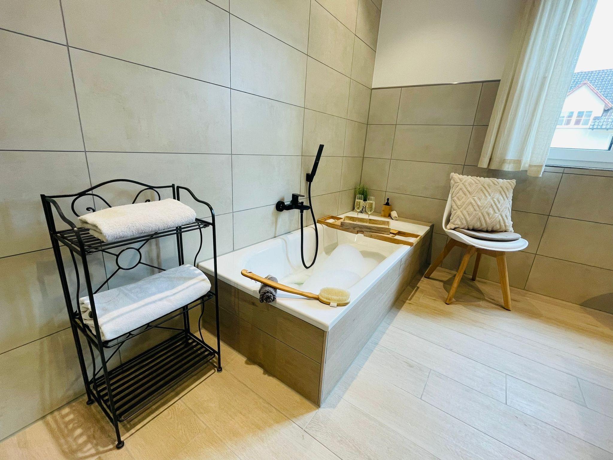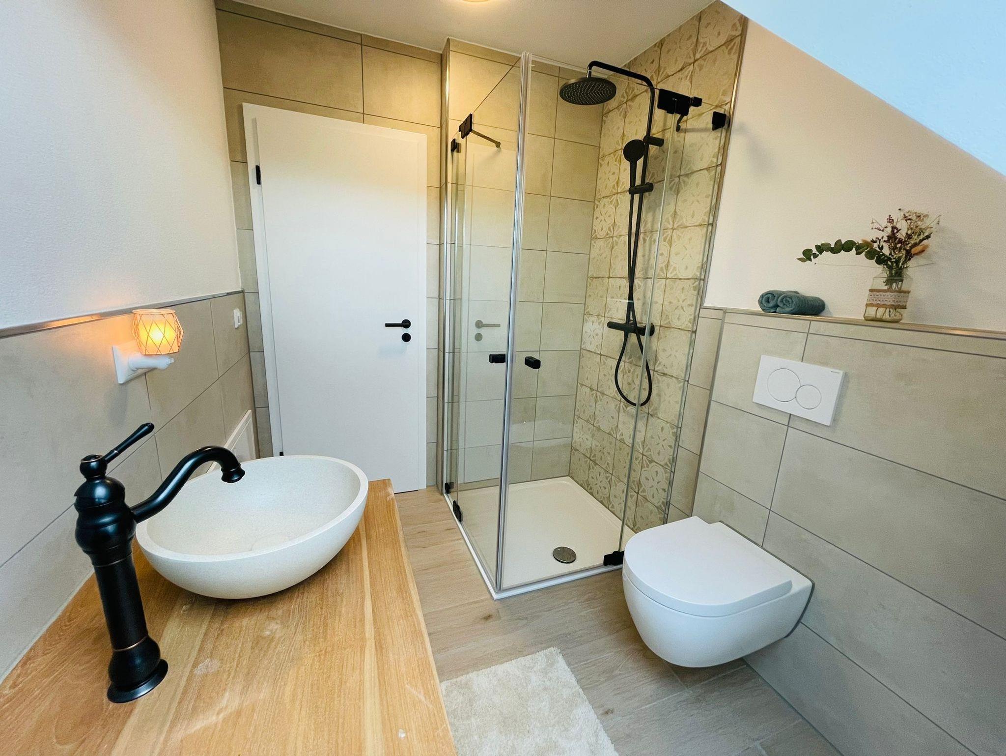 Die Ferienwohnung bietet 2 Bäder (je Etage 1 Bad), im großen Bad befindet sich eine Badewanne, eine geräumige Dusche, ein Doppelwaschbecken und WC.