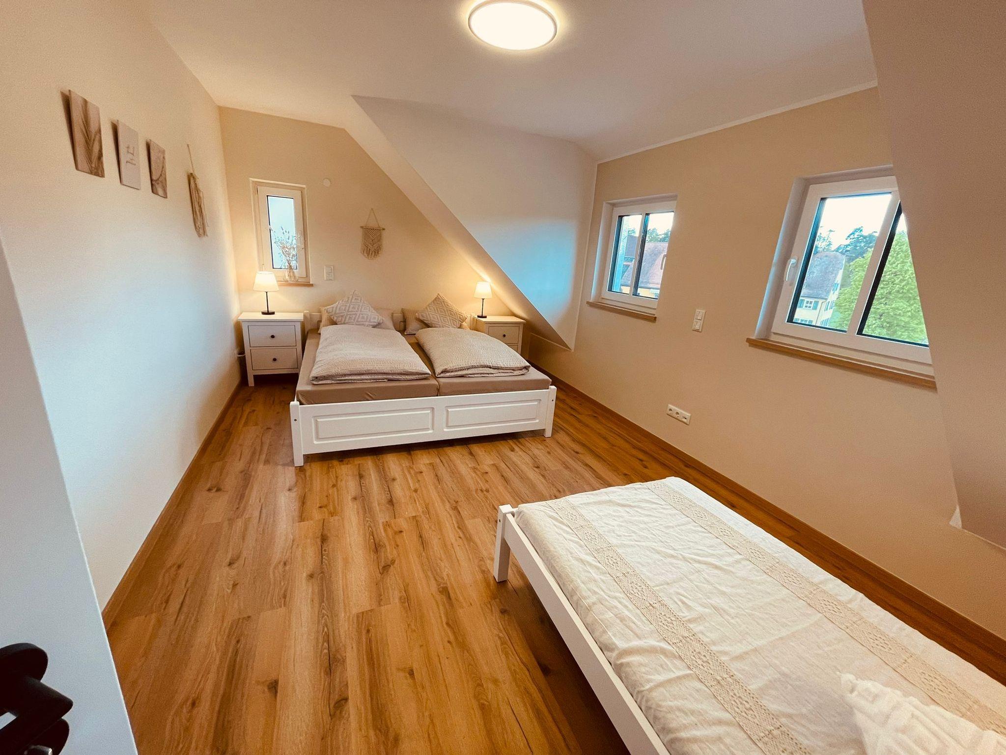 Das Bad in der 2. Etage besteht aus Dusche, Waschbecken und WC. Die 3 Schlafzimmer bietet Platz für 2-9 Personen. Schlafzimmer 1: ein Ehebett, Schlafzimmer 2: ein Ehebett und ein Einzelbett, Schlafzimmer 3: ein Ehebett und ein Stockbett. Im Allzweckraum befindet sich ein Wickeltisch, Waschmaschine, Wäscheständer und Schrank mit Reinigungsutensilien. Im hellen, offenen Wohnbereich befindet sich die geräumige Inselküche, Essbereich mit Eckbank für 9 Personen, und Wohnzimmer/Galerie mit großer Couch und Internet TV und Kinderspielecke. Zudem verfügt die Wohnung über elektronische Außenrollos und eine Finnische Sauna für 3-4 Personen.