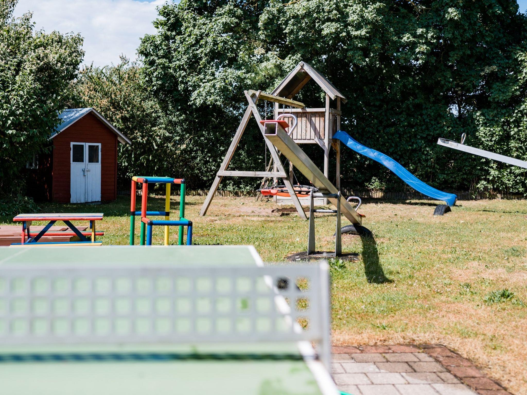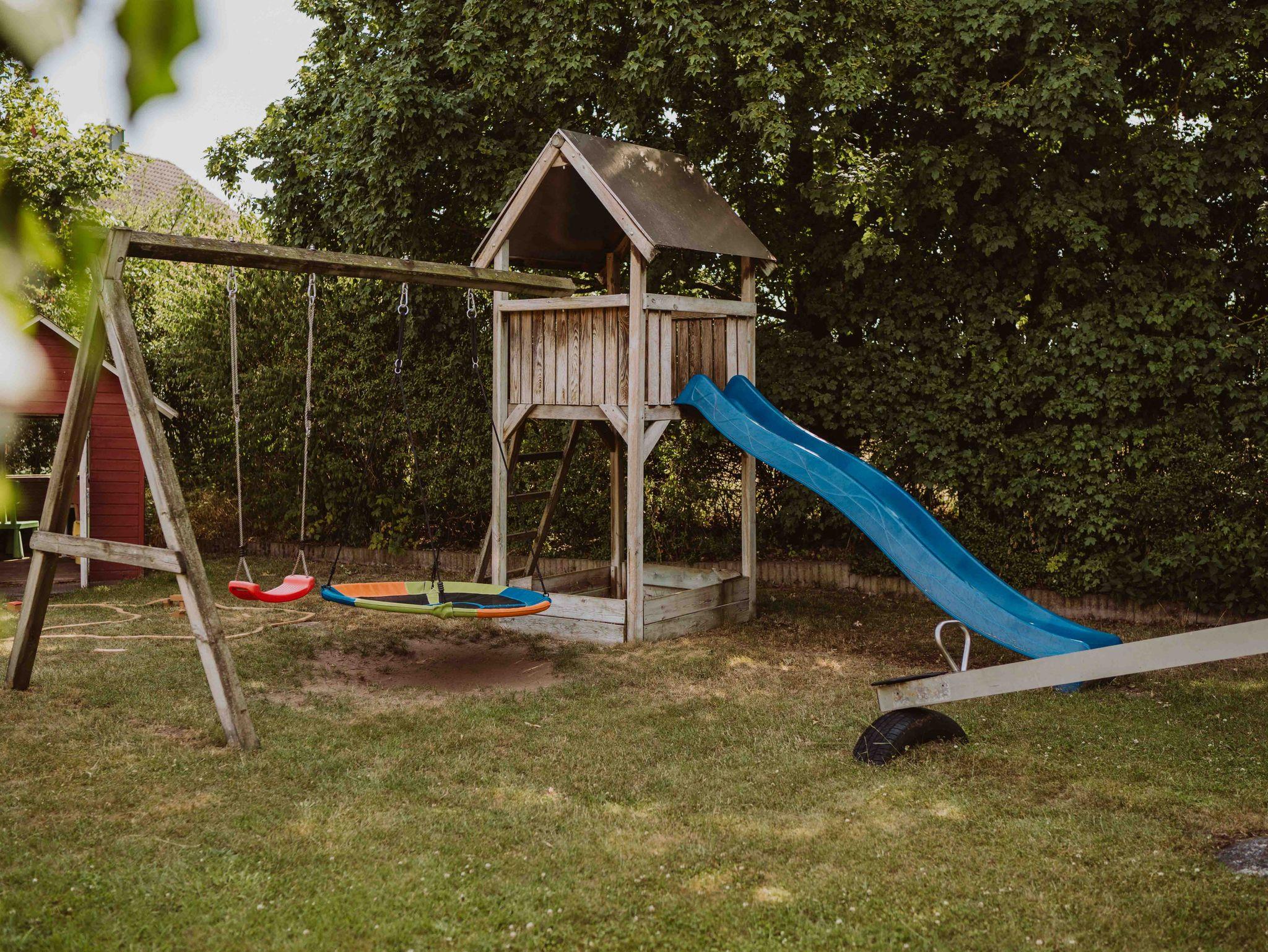 Wippen, Schaukel, Rutsche und Spielhaus sowie Bobby-Car und Tretbulldog stehen bereit.