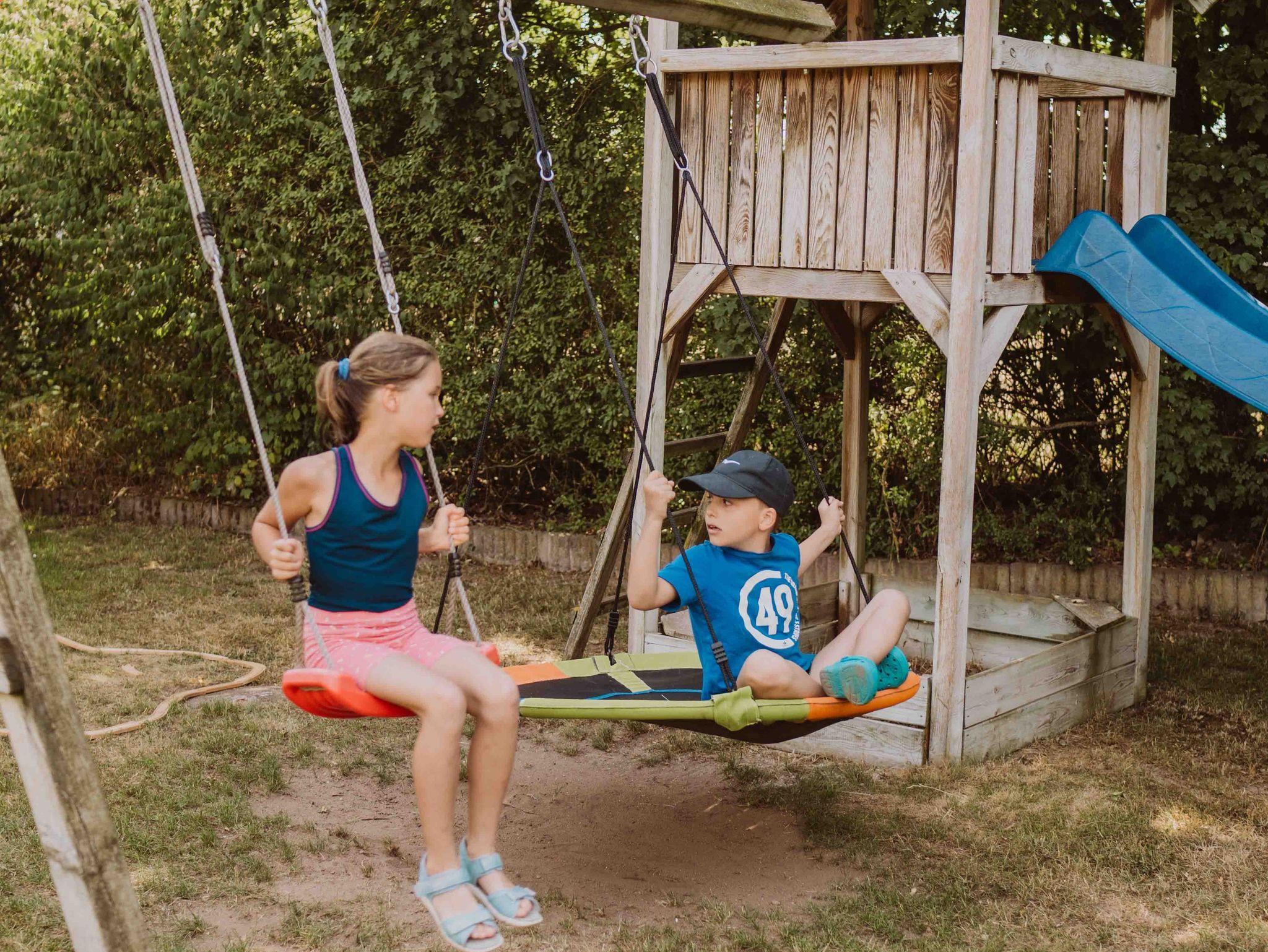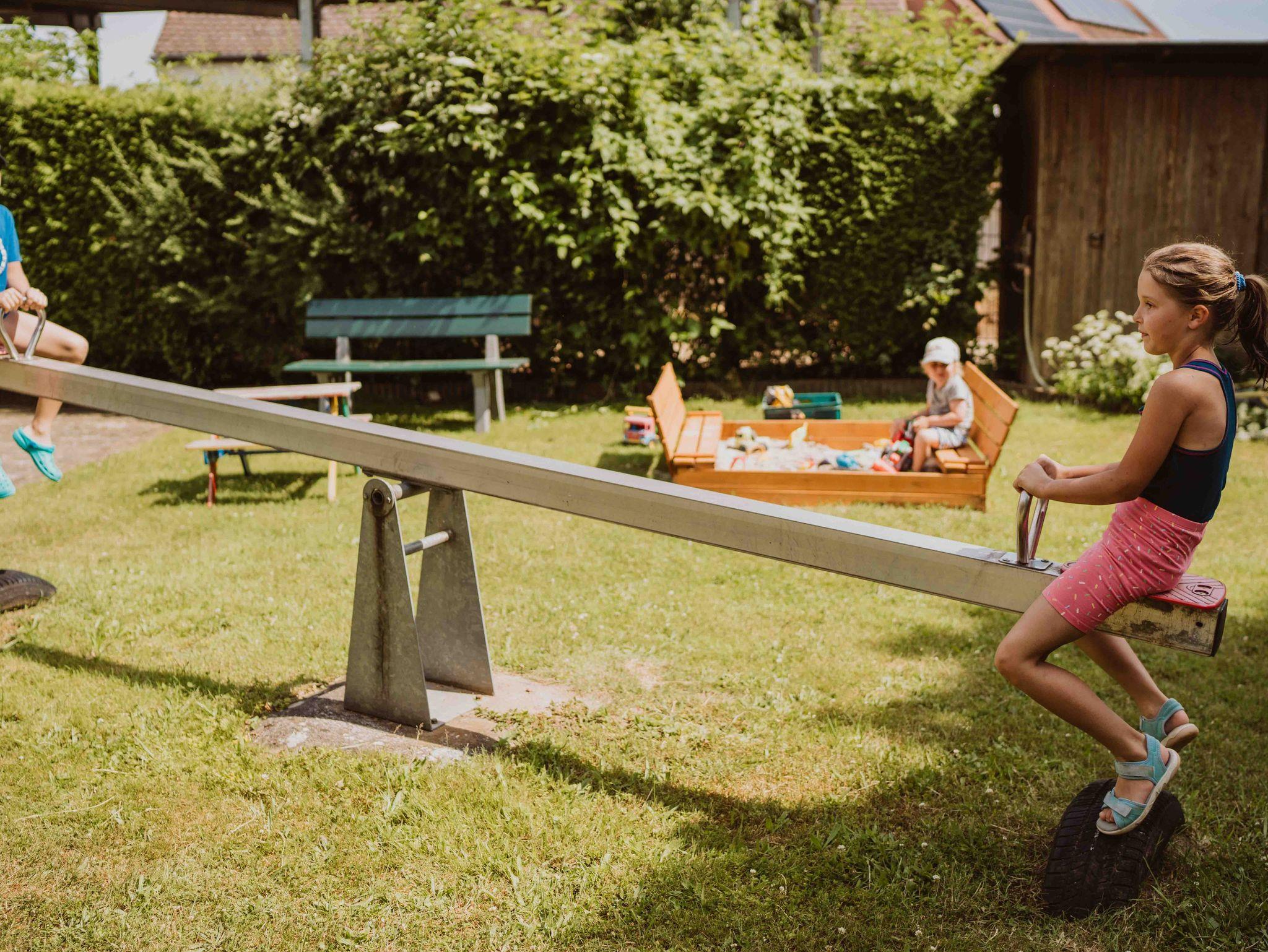 Wippen, Schaukel, Rutsche und Spielhaus sowie Bobby-Car und Tretbulldog stehen bereit.