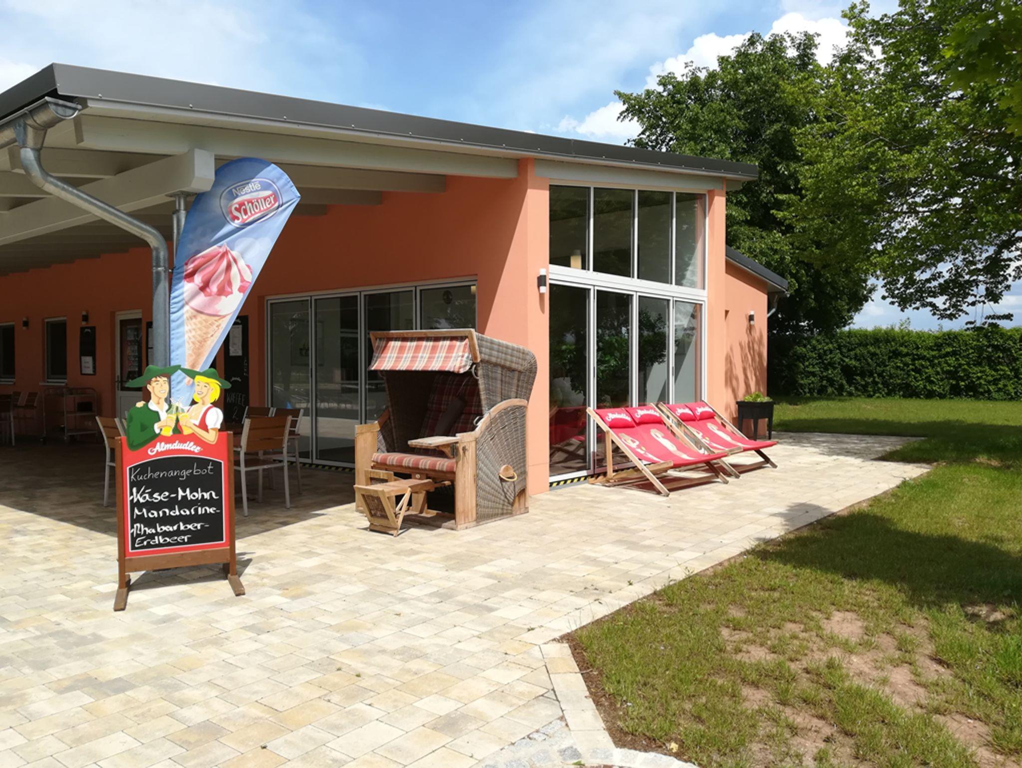 Für den kleinen Hunger, den großen Durst und auch für Naschkatzen ist ein wunderschöner Kiosk mit Sitzbereich am Naturbadesee vorhanden.